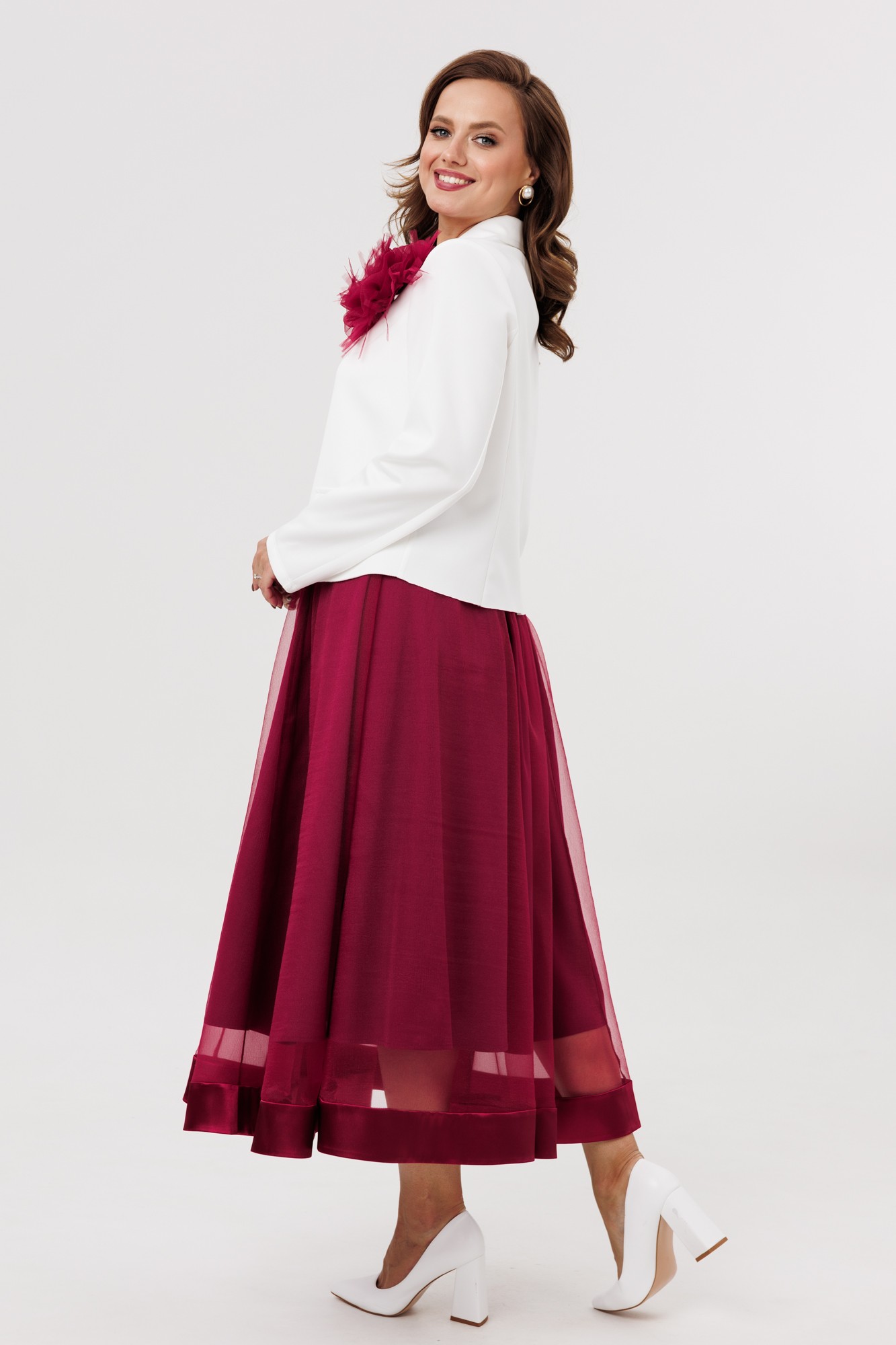 Нарядный женский костюм, состоящий из жакета и юбки. Жакет полуприлегающего силуэта, выполнен из трикотажного полотна (тянется), без подкладки. По переду нагрудная вытачка и отделочный клапан, центральная застежка на петли-пуговицы. Спинка со средними рельефными швами. Рукава втачные, двухшовные. Горловина оформлена воротником пиджачного типа с лацканом. Юбка – 6-клинка, выполненная из двух видов ткани – органзы и атласа (не тянется), на подкладке. По низу клиньев – притачная планка из атласа. Верхний срез оформлен поясом с эластичной резинкой. Жакет декорирован съемным цветком бордового цвета (на булавочке).