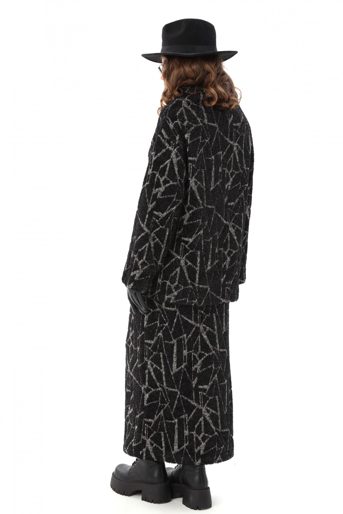 Костюм комбинированный двухпредметный: состоит из джемпера и юбки. Джемпер прямого свободного силуэта длиной до линии бедер, воротник хомут, рукав одношовный, втачной длиной до запястья. Спинка цельнокроеная. Перед состоит из двух частей- верхней и нижней. По нижней части переда сверху по центру вставка из отделочной ткани. По нижней части переда боковые накладные карманы из отделочной ткани, уходящие в боковой шов, длиннее линии низа переда вровень с линией низа спинки. Юбка на резинке прямого кроя с имитацией запаха из отделочной ткани.