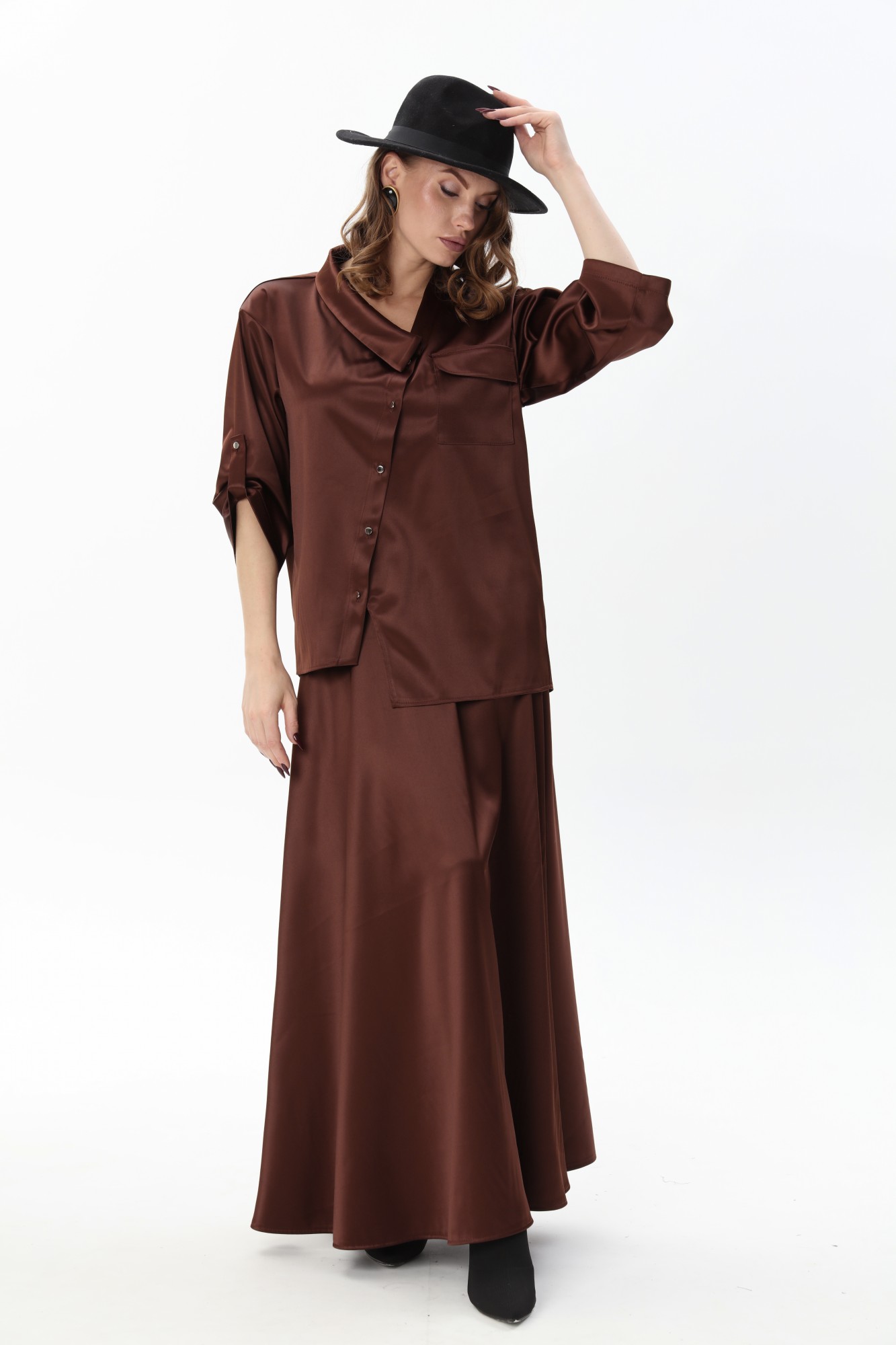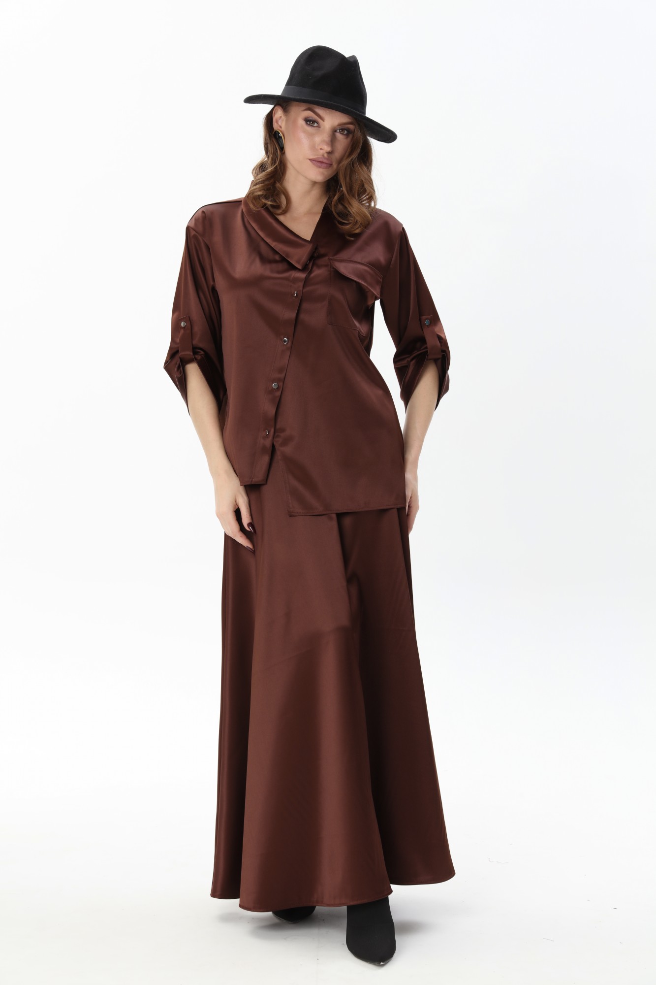 Костюм комбинированный двухпредметный: состоит из жакета и юбки. Жакет рубашечного типа прямого силуэта с асимметричным низом. Рукав втачной со спущенной линией плеча, фиксируется на пату. Застежка центральная на петли и пуговицы, смещённая по косой. На левой полочке накладной карман с клапаном. Воротник отложной на стойке до половины спинки. Юбка - солнце макси с узким поясом. В боковых швах расположены карманы. Застёжка на петлю и пуговицу и молнию по спинке.