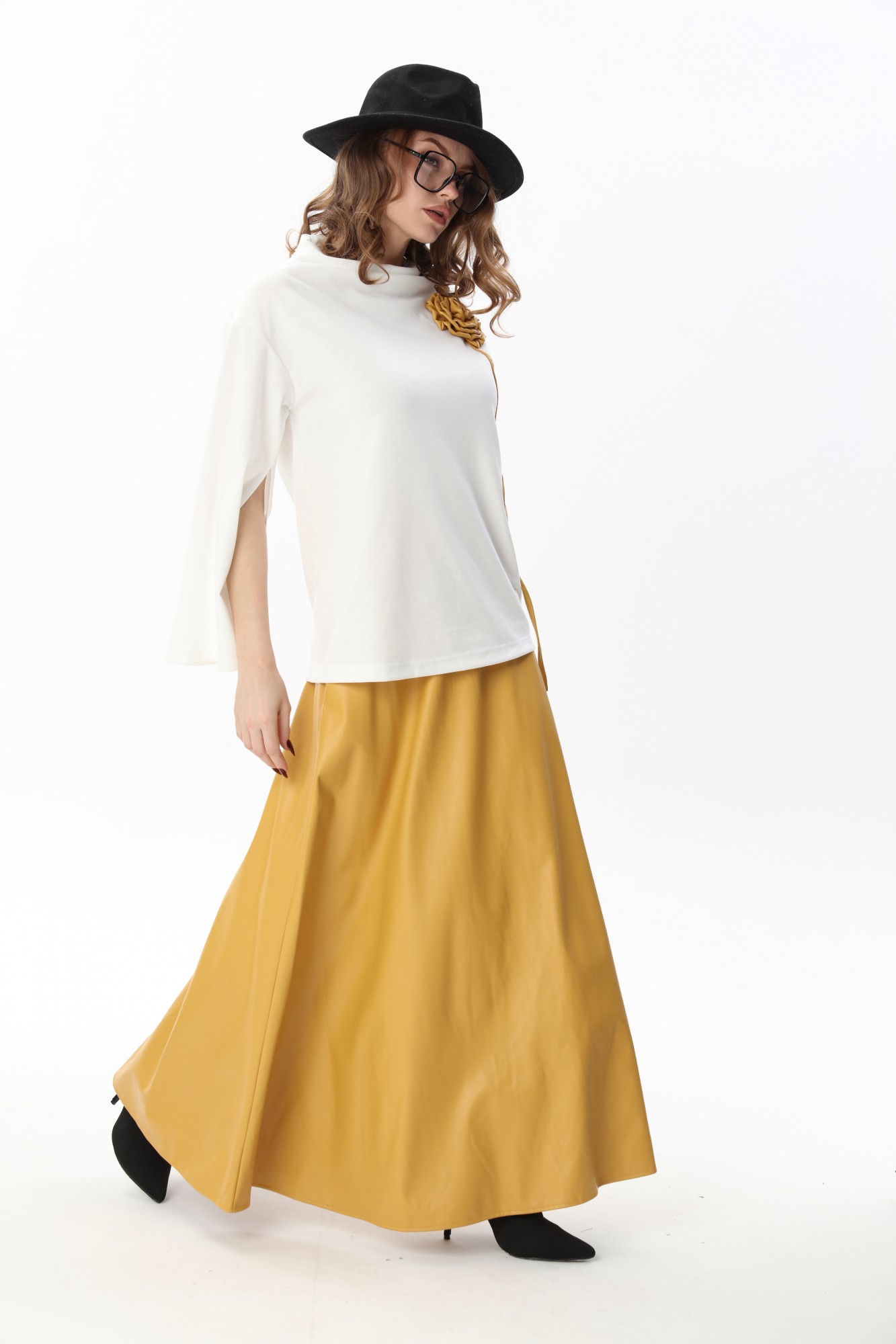 Костюм двухпредметный: состоит из джемпера и юбки. Джемпер-кейп прямого свободного силуэта. Горловина с цельнокроеным воротником-стойкой. Рукав втачной широкий, от линии локтя до запястья есть дополнительное отверстие для рук. Декорирован цветком из контрастной ткани. Юбка - солнце с узким поясом. В боковых швах расположены карманы. Застёжка на петлю и пуговицу и молнию по спинке.