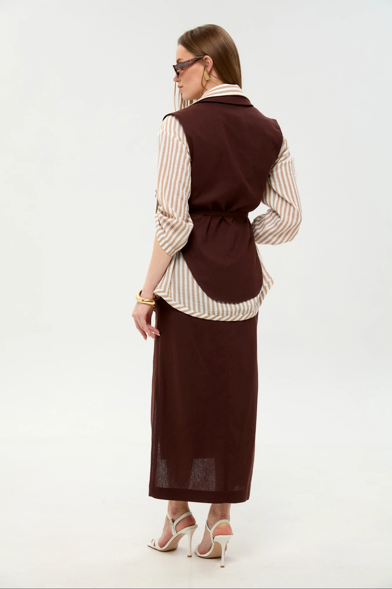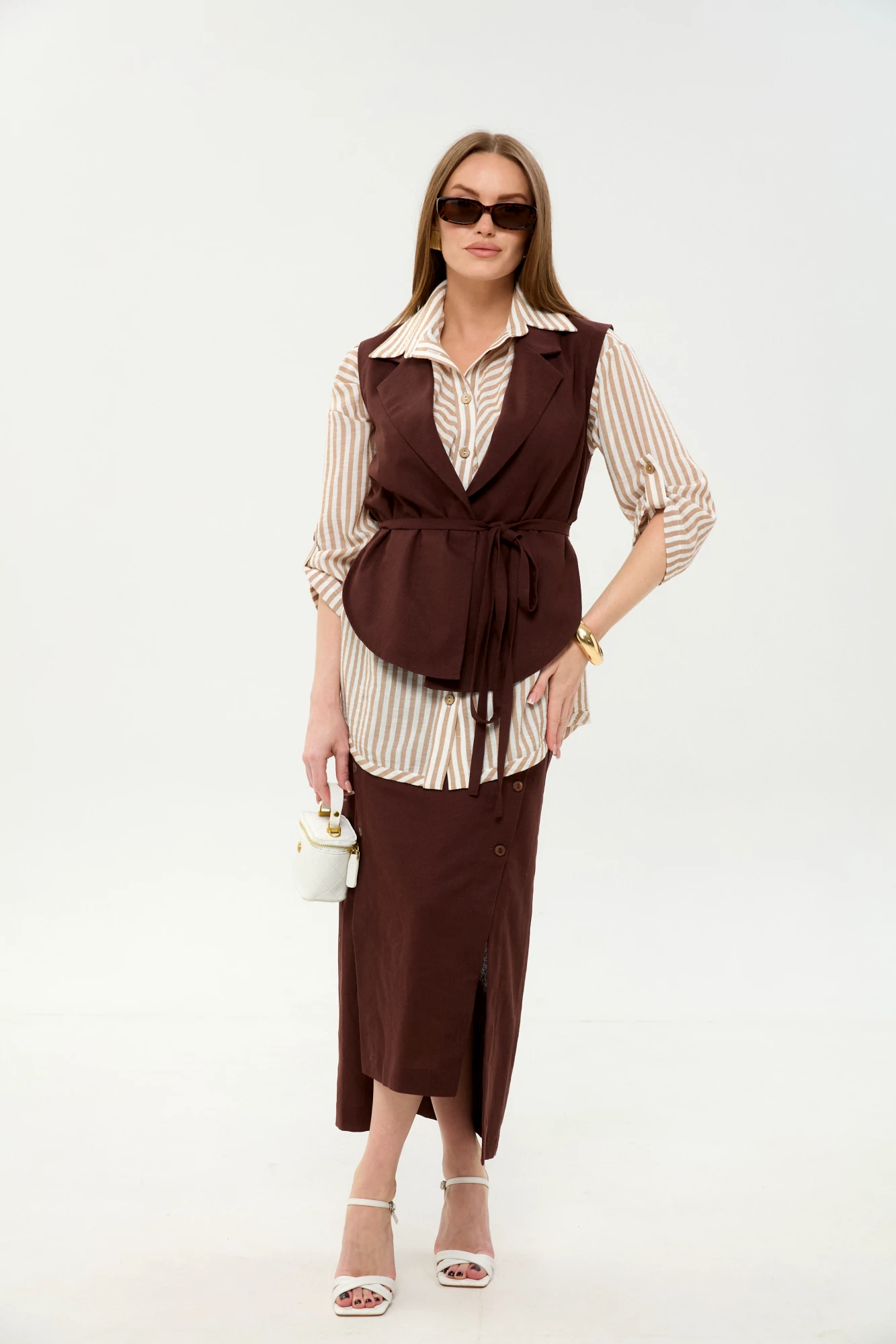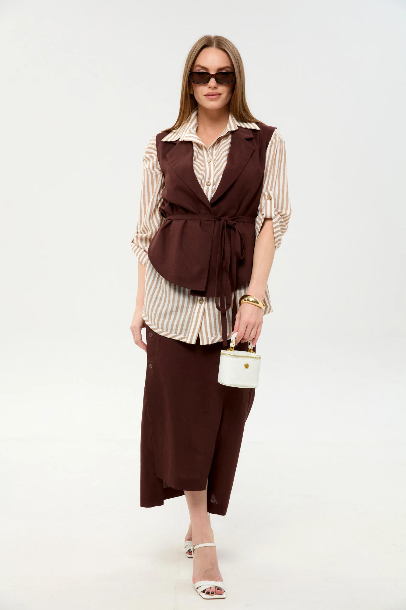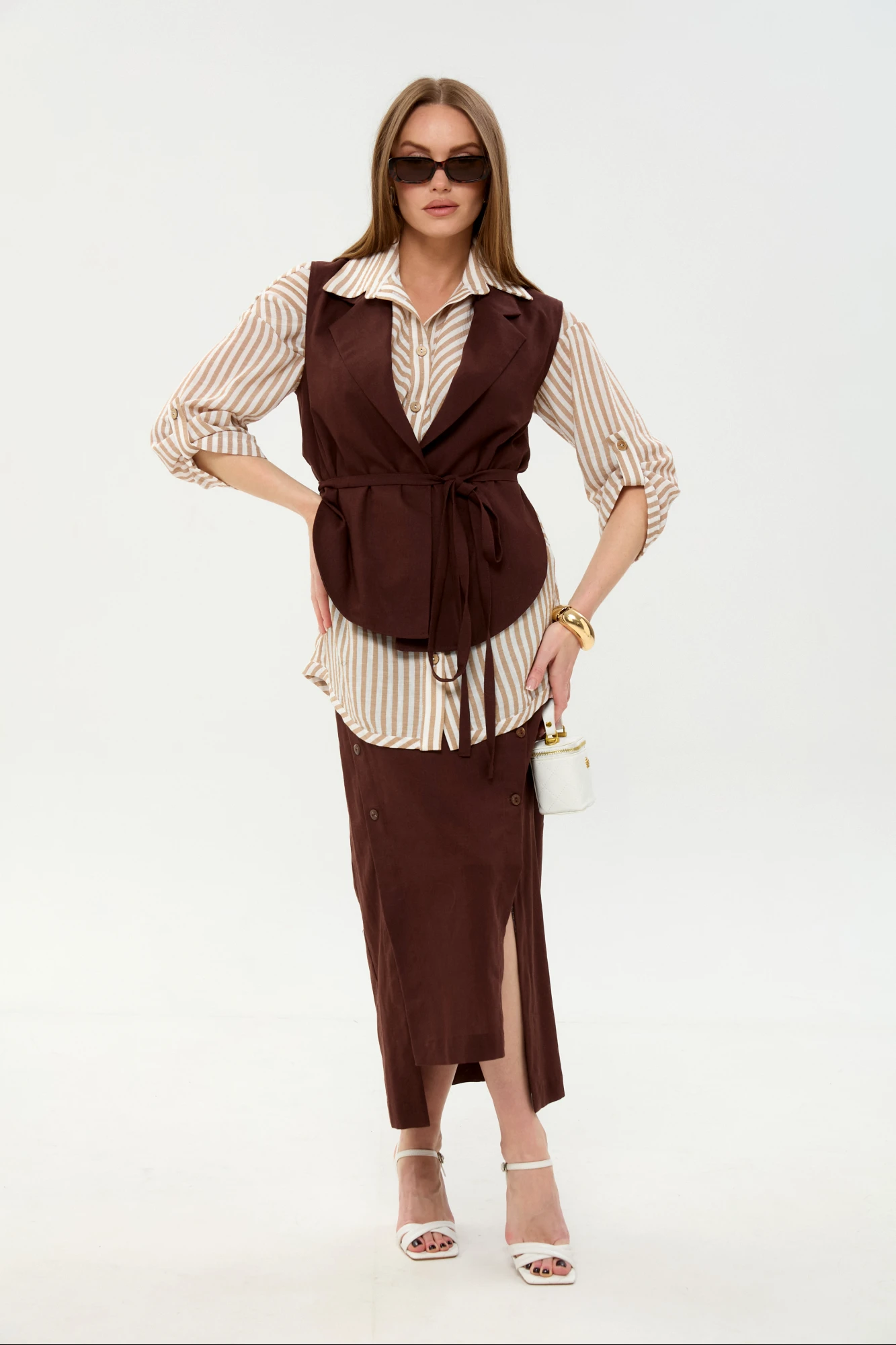 Юбочный костюм NikVa н957 -3 тройка шоколад и песочные полосы