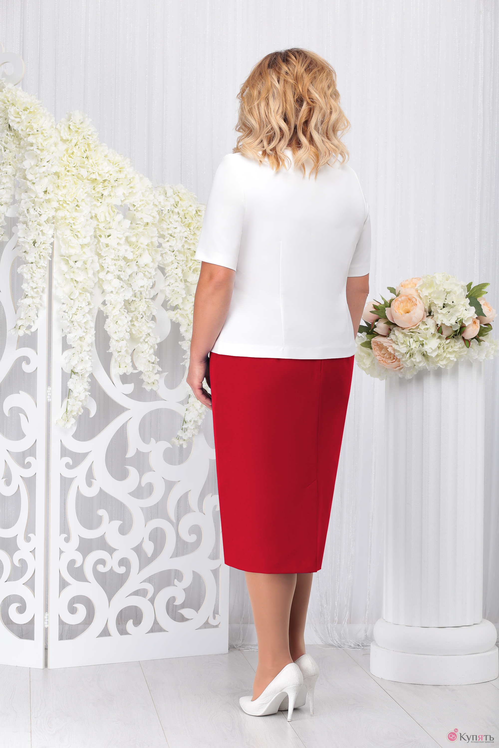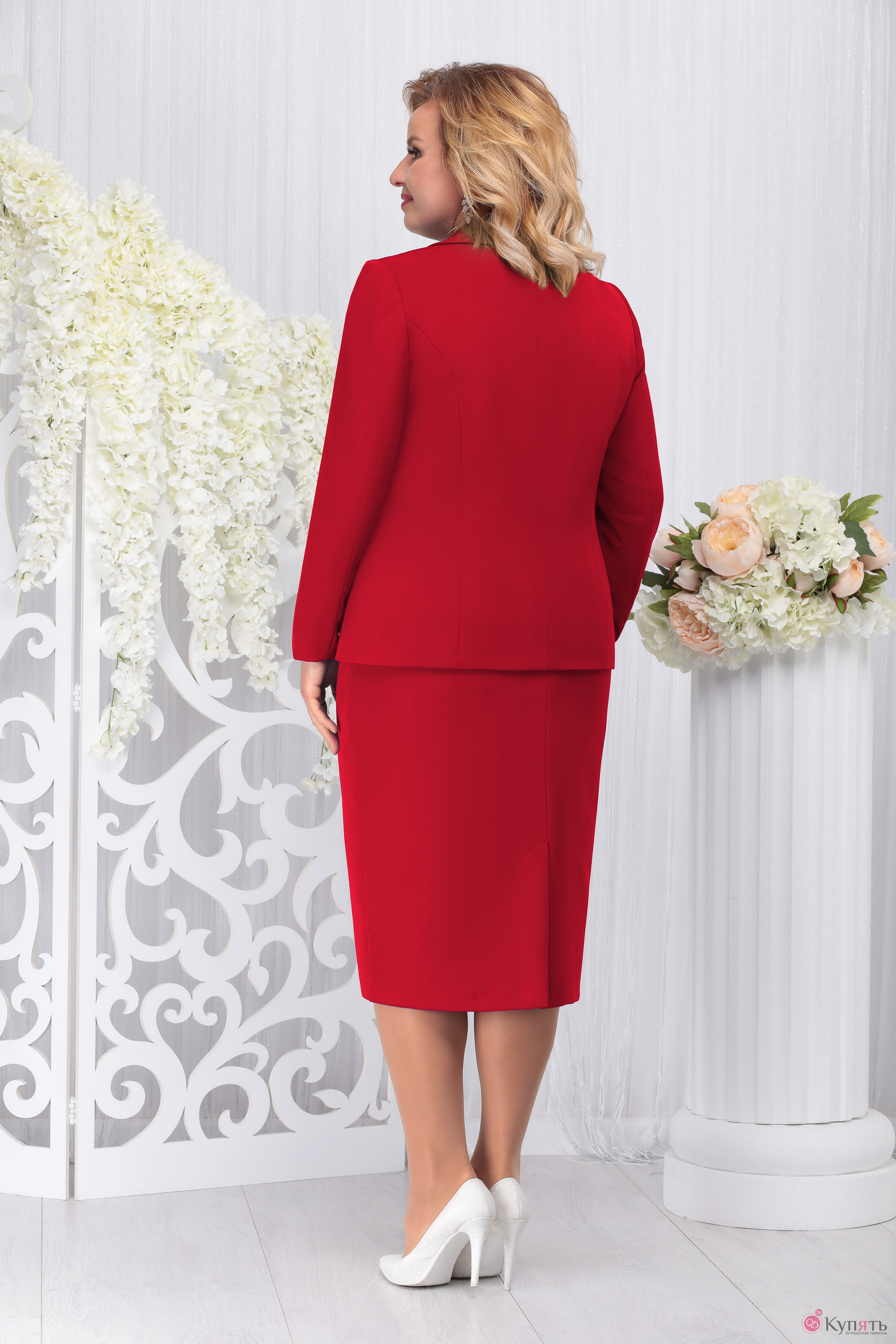 Простой и элегантный женский комплект выполнен в деловом стиле. Приталенный жакет с воротником пиджачного типа и V-образным вырезом подчеркнет грудь и сделает фигуру визуально стройнее. Прорезные карманы, прикрытые клапанами, и три изящных пуговицы – неброские элементы декора, украшающие модель. Классическая прямая юбка длиной до колена чуть заужена книзу, что позволит обратить внимание на стройные ноги и красивые колени. Дополняет комплект белая блуза с круглой горловиной, которая является контрастным акцентом. Туфли-лодочки – отличный выбор для завершения нарядного образа. Комплект женский, состоящий из жакета, блузки и юбки. Жакет полуприлегающего силуэта, на подкладке. Длина по среднему шву спинки 61,0 см. На полочках рельефы выходят из проймы, проходят через центр груди вниз. В нижней части полочек обработаны прорезные карманы в рамку с двумя обтачками и обтачным клапаном. Спинка со средним швом и рельефами, выходящими из проймы вниз. Рукава втачные, двухшовные, длиной 62,0 см. Застёжка однобортная, центральная, на 3-и петли и 3-и пуговицы, борта закруглённые. Воротник пиджачного типа с прямыми углами и с отрезными лацканами. Изделие с плечевыми накладками. Блузка полуприлегающего силуэта. Длина посередине спинки 57,0 см. На детали переда из горловины вниз выходят 4-е выточки. Спинка с талевыми выточками. Горловина обтачная, углублённая спереди, круглая. Рукава втачные, одношовные, длиной 30,0 см. Изделие с плечевыми наладками. Классическая юбка прямого силуэта, чуть зауженная к низу, на подкладке. Длина по боковому шву 69,0 см. от шва притачивания пояса. Модель на притачном поясе, с внутренней резинкой по бокам и с застёжкой на петлю пуговицу. По задней и по передней части талевые вытачки. В заднем среднем шве обработана застёжка на потайную тесьму молнию и шлица.