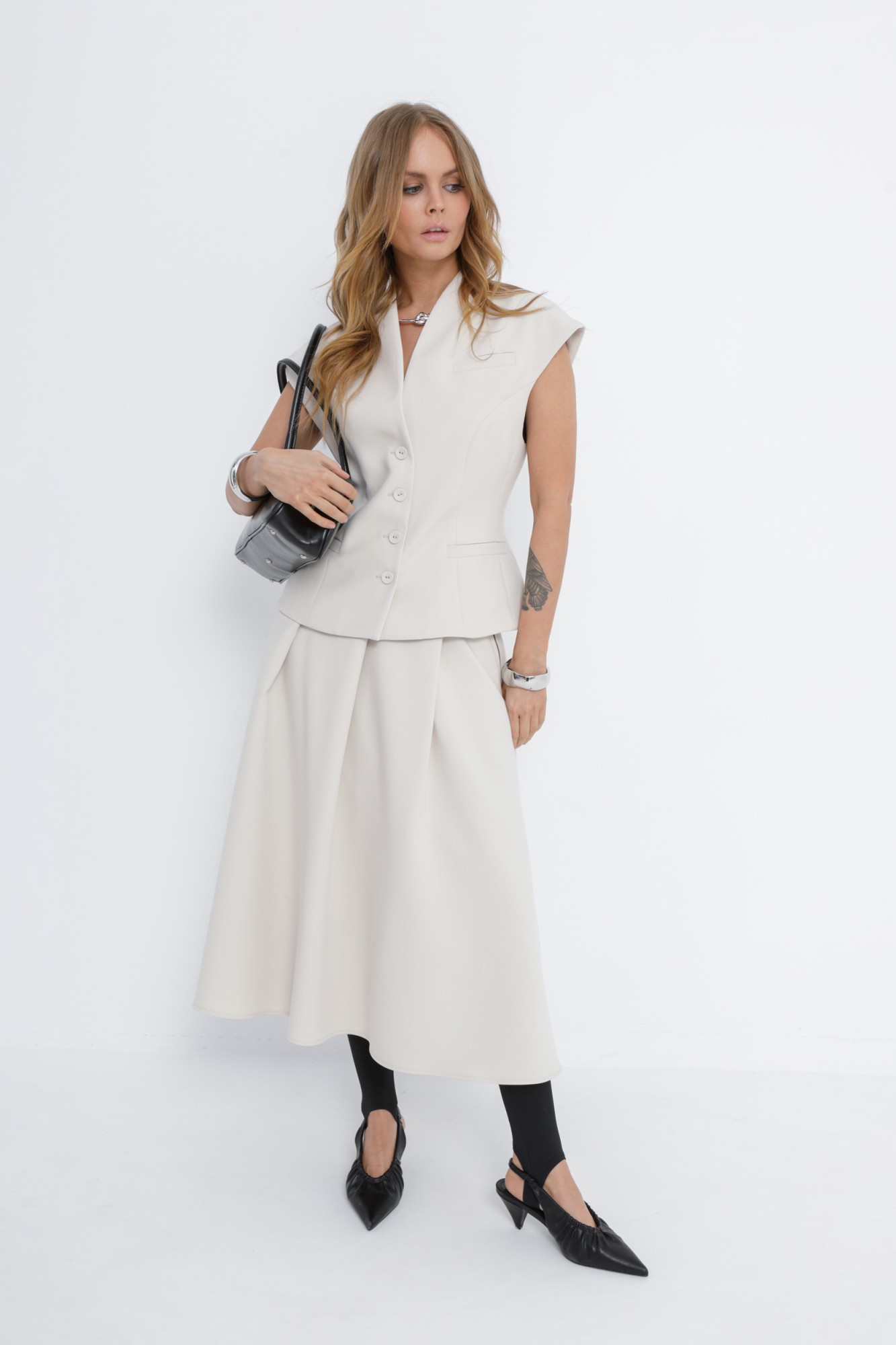Текстильный костюм-двойка из приталенного жилета с воротником-стойкой и миди-юбки со складками. Детали: жилет полуприлегающего силуэта, цельнокроеный воротник-стойка, рельефные швы переда и спинки, функциональные карманы, застежка на петли и пуговицы, жилет на подкладке. Юбка на притачном поясе со шлевками, прорезные карманы, застежка на потайную молнию в левом боковом шве, юбка на подкладке.