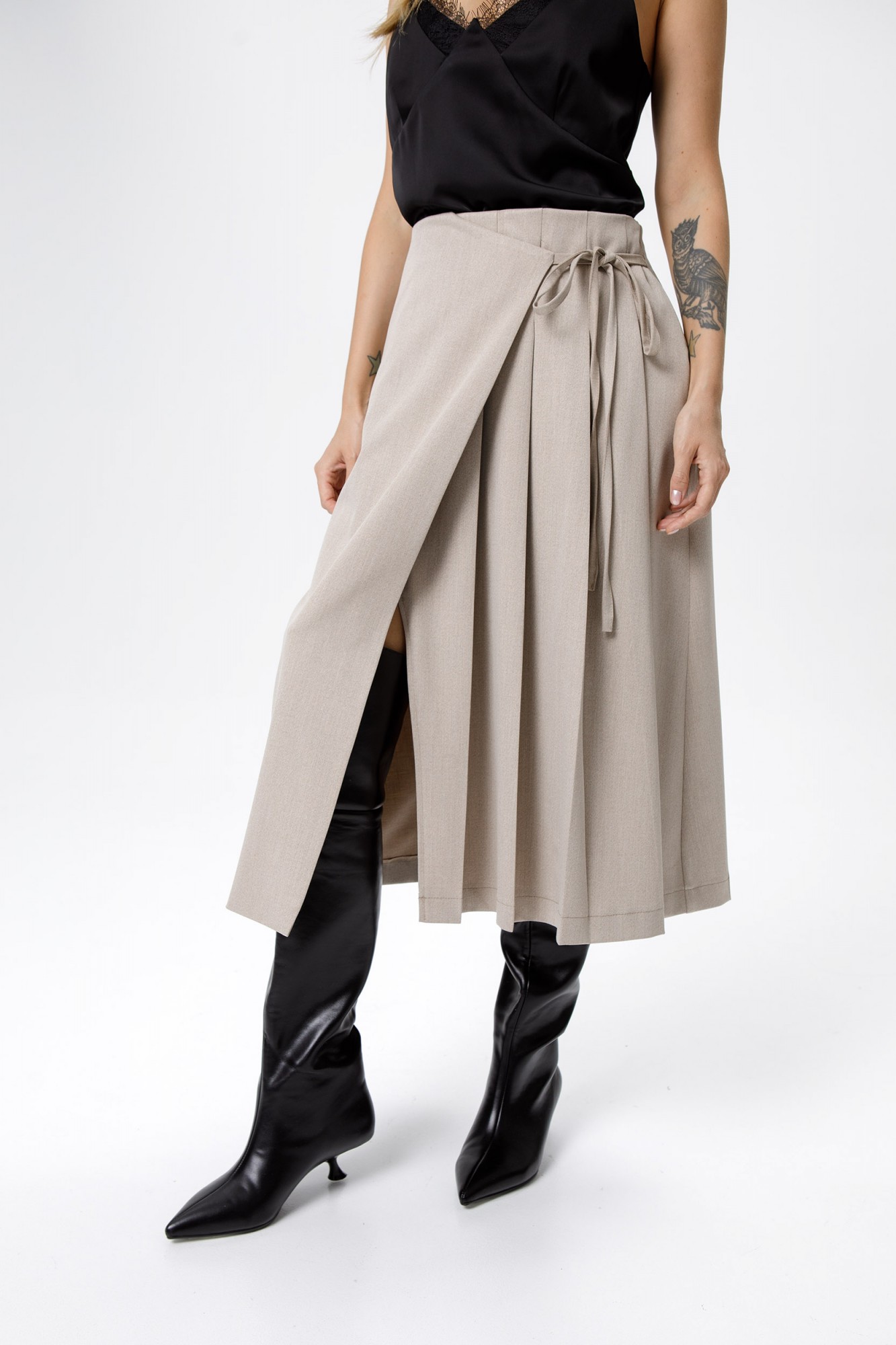 Костюм-двойка из укороченного приталенного жакета с акцентными карманами и асимметричной юбки со складками.