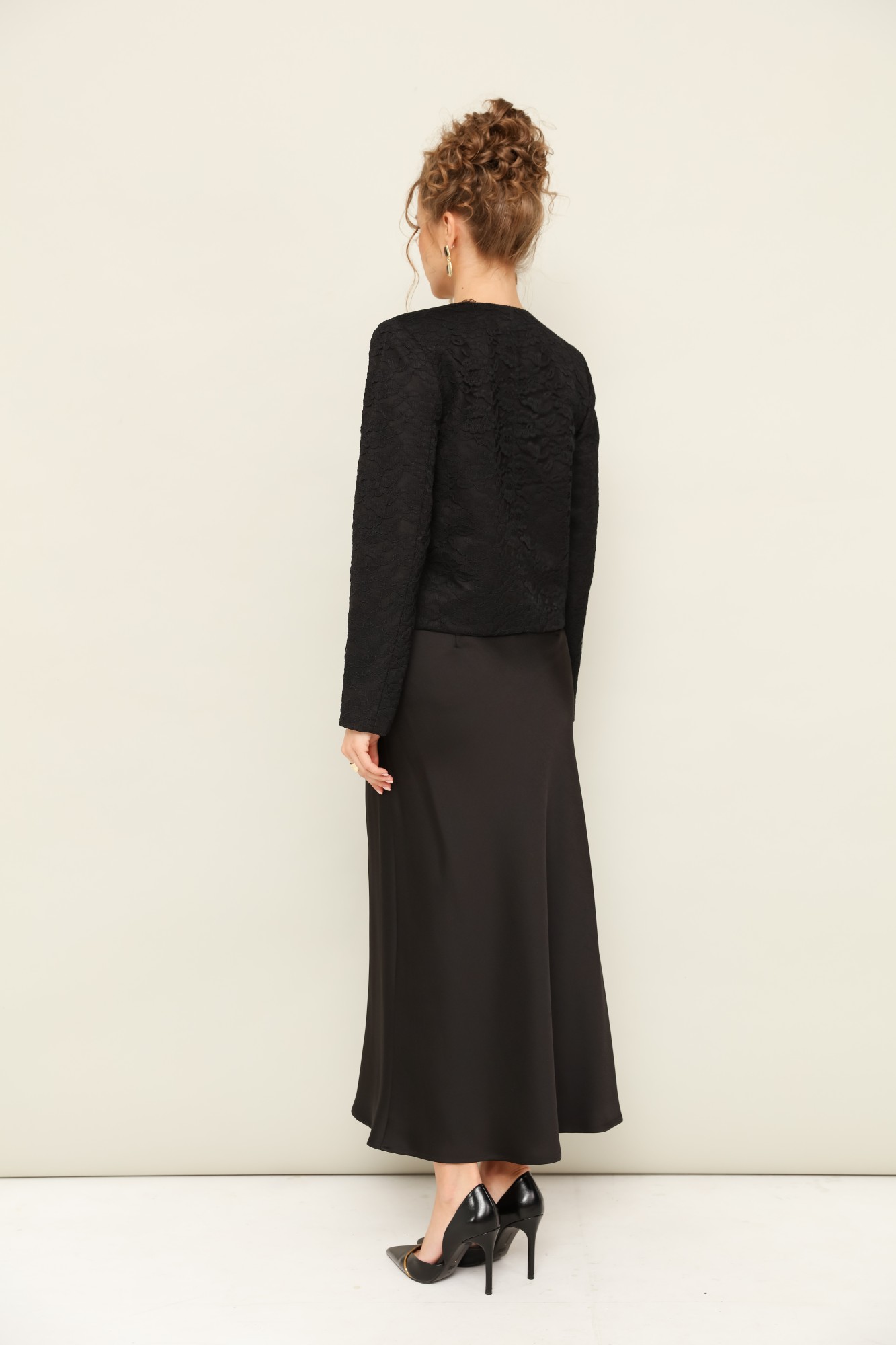 Элегантный комплект состоит их укороченного жакета и юбки. Жакет укороченный, застегивается на пуговицы, выполнен из двух тканей: ажурное кружево и сатин. Юбка полуприлегающего силуэта, застегивается на потайную молнию сбоку, выполнена из великолепного гладкого сатина.