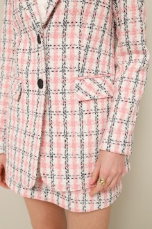 Стильный 2-предметный комплект, состоящий из жакета и юбки-шорт, выполненный из твидовой ткани в клетку. Жакет полуприлегающего силуэта, однобортный, с застежкой на петли и пуговицы. Воротник пиджачного типа с отложными лацканами. Спереди обработаны карманы с клапанами. Рукава втачные двухшовные. Спинка со средним швом. Жакет на подкладке. Юбка-шорты в длине мини, на обтачке по поясу спереди и с притачным поясом по спинке. Застежка на пуговицу и потайную тесьму-молнию в среднем шве спинки.