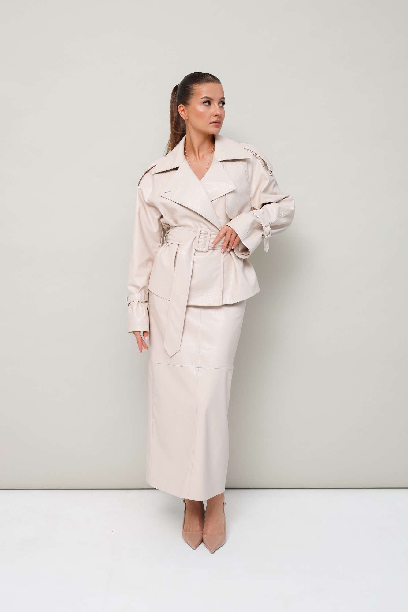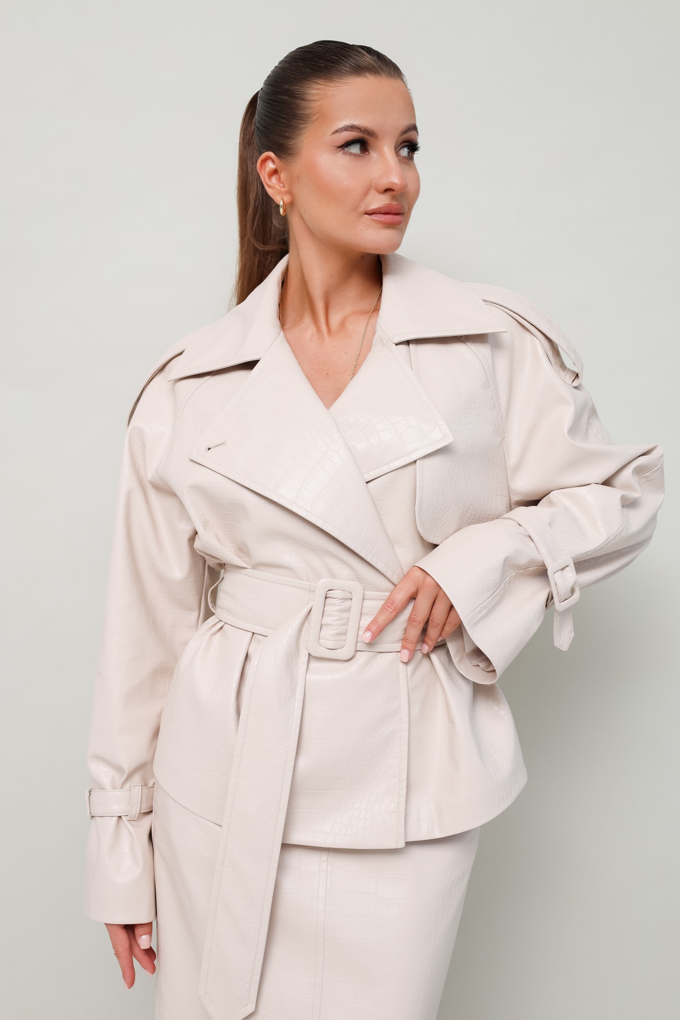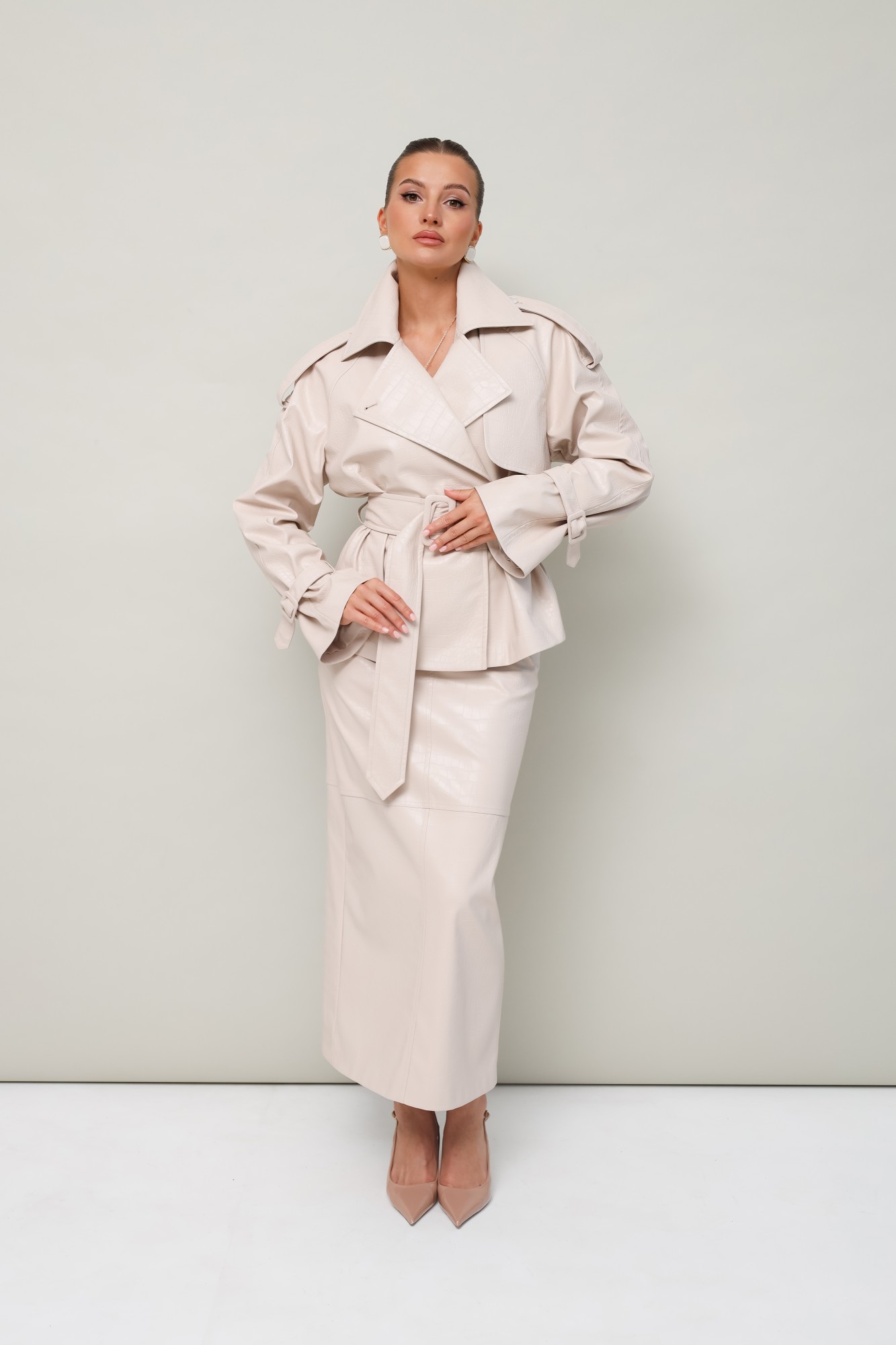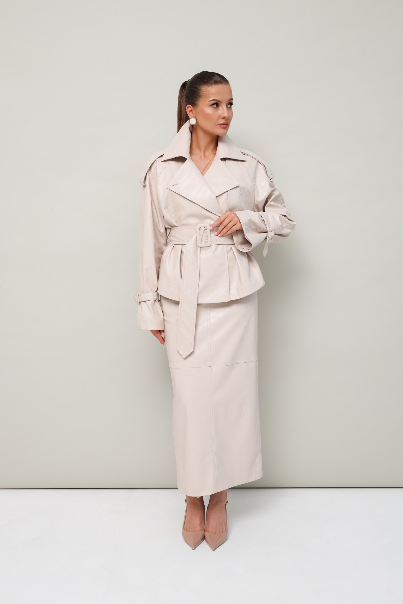 Стильный 2-предметный комплект, состоящий из жакета и юбки, выполненный из экокожи. Жакет современного прямого силуэта, двубортный с застежкой на петли и пуговицы. По плечевому шву обработаны погоны. Воротник пиджачного типа с отложными лацканами. Спереди отлетная кокетка. Рукава кроя реглан, с патами по низу, с фиксацией на пряжки. Спинка со средним швом. Изделие на подкладке. В комплекте пояс из основной ткани с пряжкой. Юбка на подкладке в длине миди с боковыми наклонными карманами. Притачной пояс с застежкой в среднем шве на потайную молнию. Для удобства движения сзади обработана шлица.