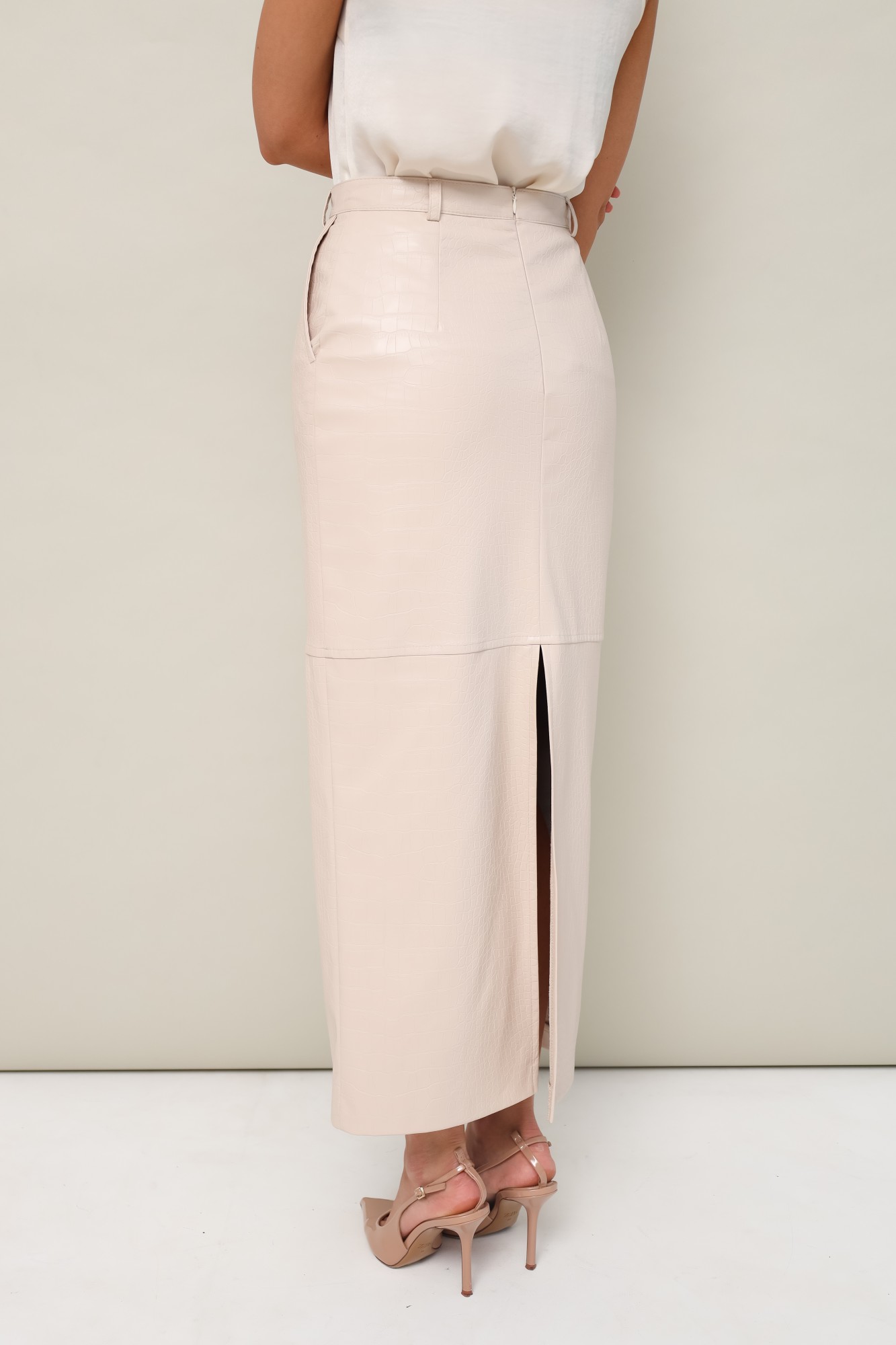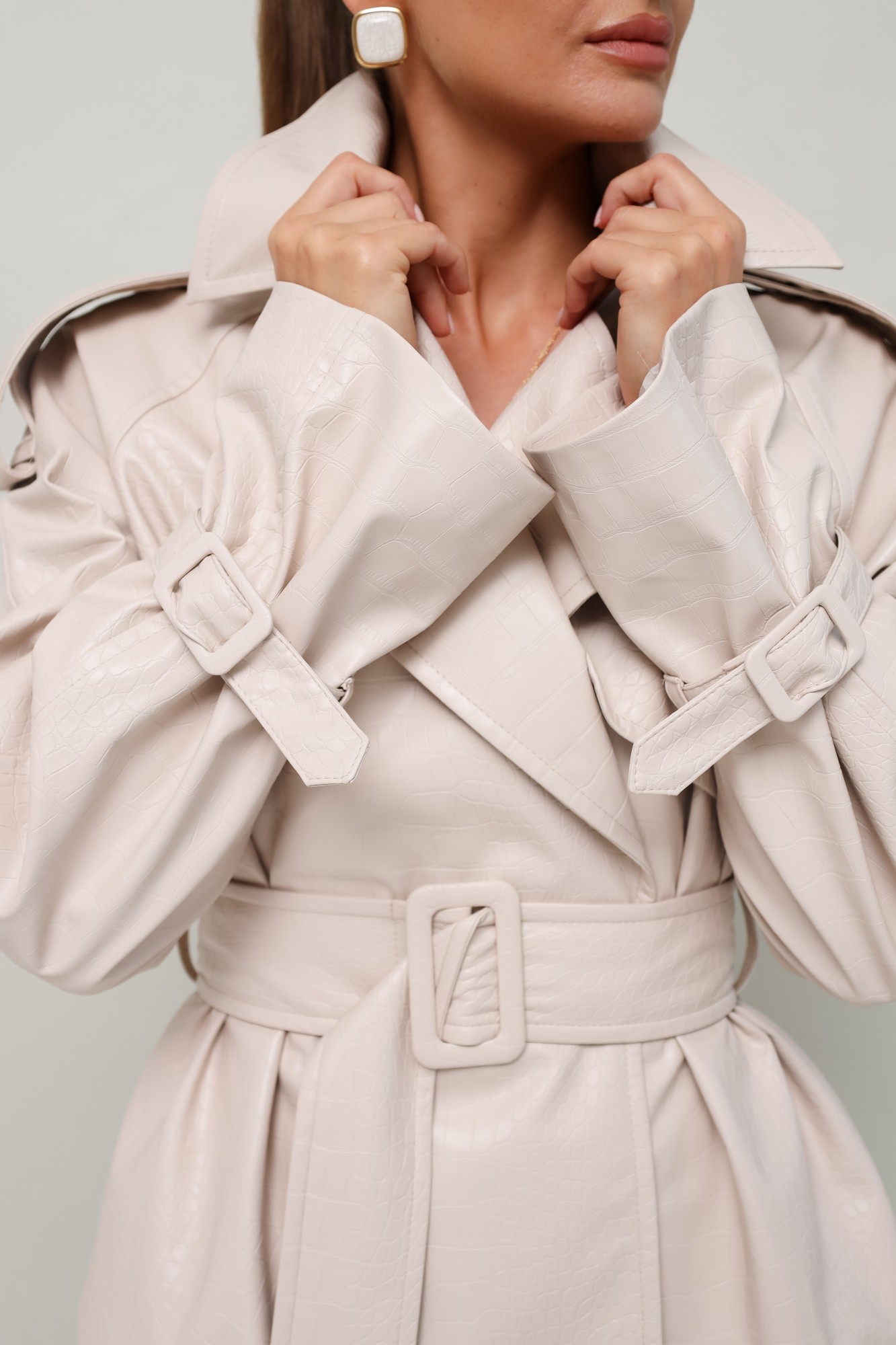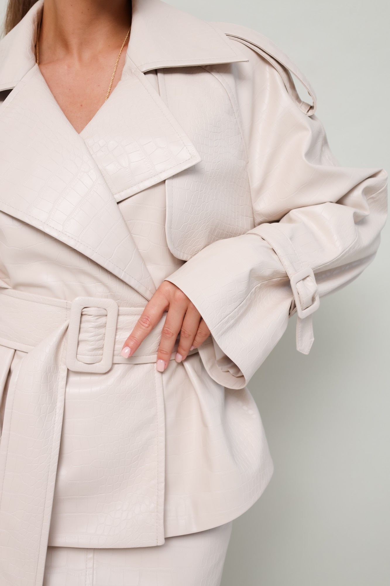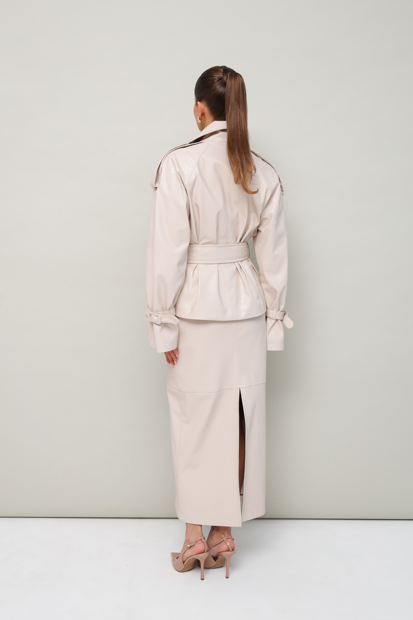 Стильный 2-предметный комплект, состоящий из жакета и юбки, выполненный из экокожи. Жакет современного прямого силуэта, двубортный с застежкой на петли и пуговицы. По плечевому шву обработаны погоны. Воротник пиджачного типа с отложными лацканами. Спереди отлетная кокетка. Рукава кроя реглан, с патами по низу, с фиксацией на пряжки. Спинка со средним швом. Изделие на подкладке. В комплекте пояс из основной ткани с пряжкой. Юбка на подкладке в длине миди с боковыми наклонными карманами. Притачной пояс с застежкой в среднем шве на потайную молнию. Для удобства движения сзади обработана шлица.