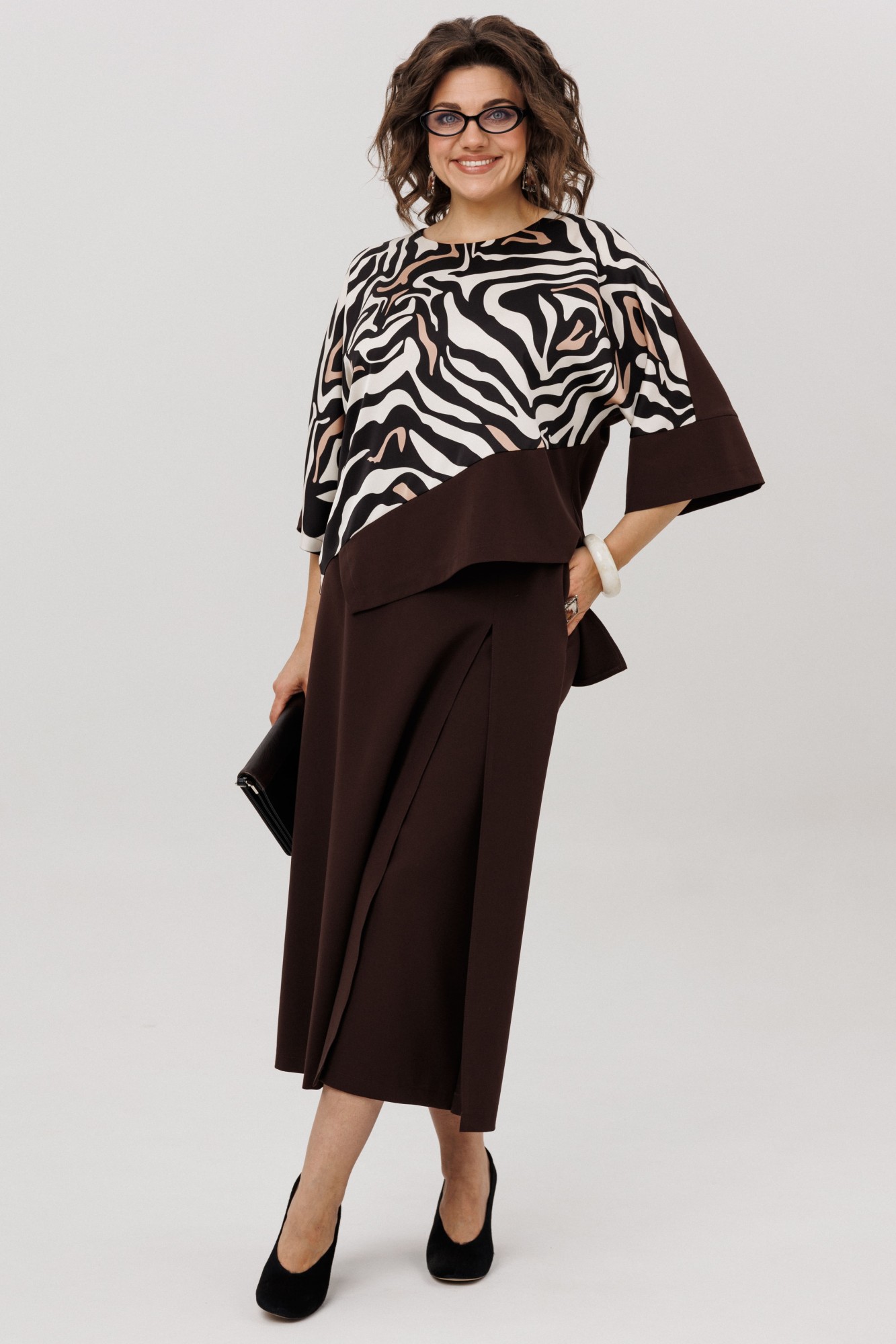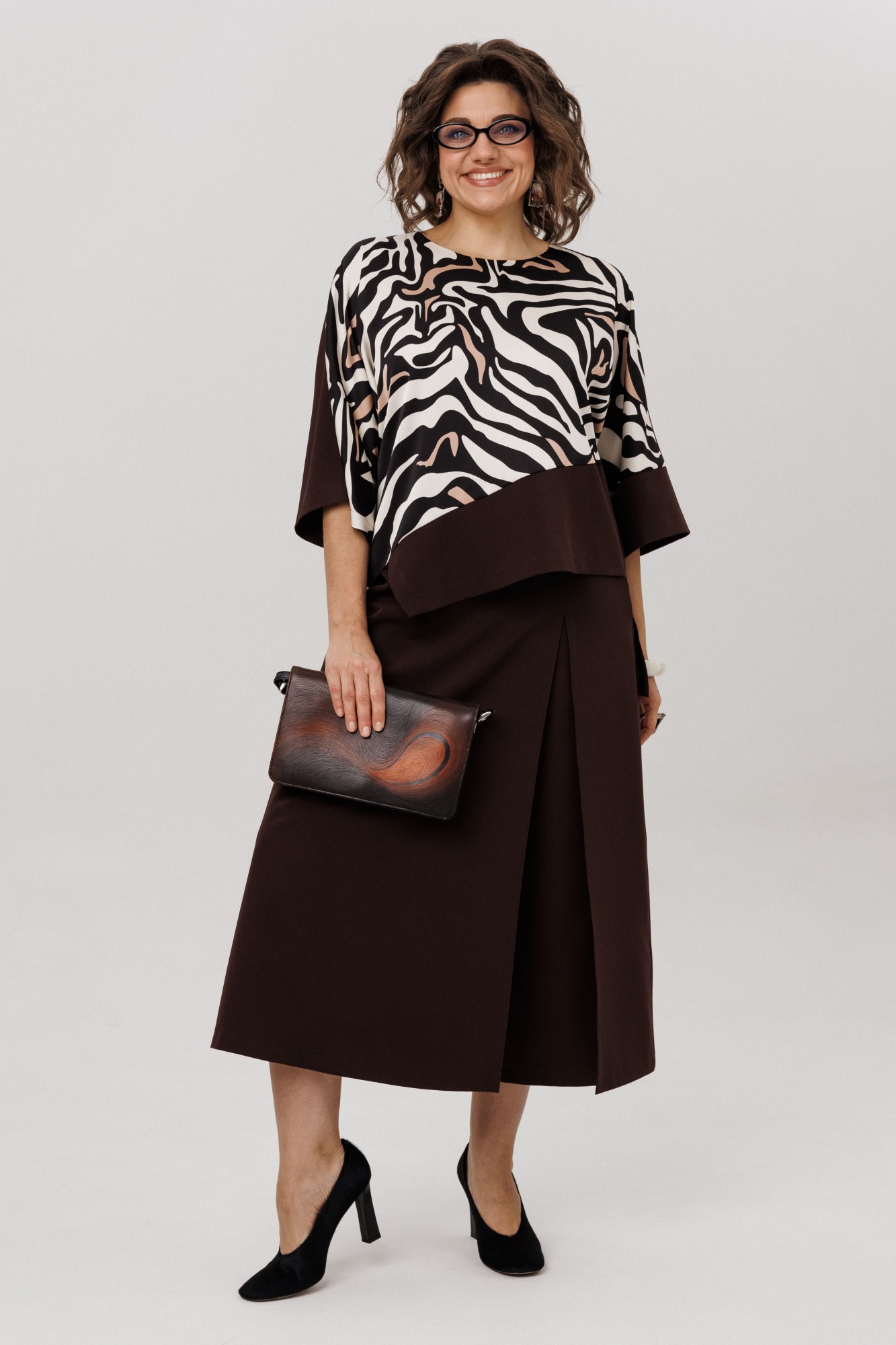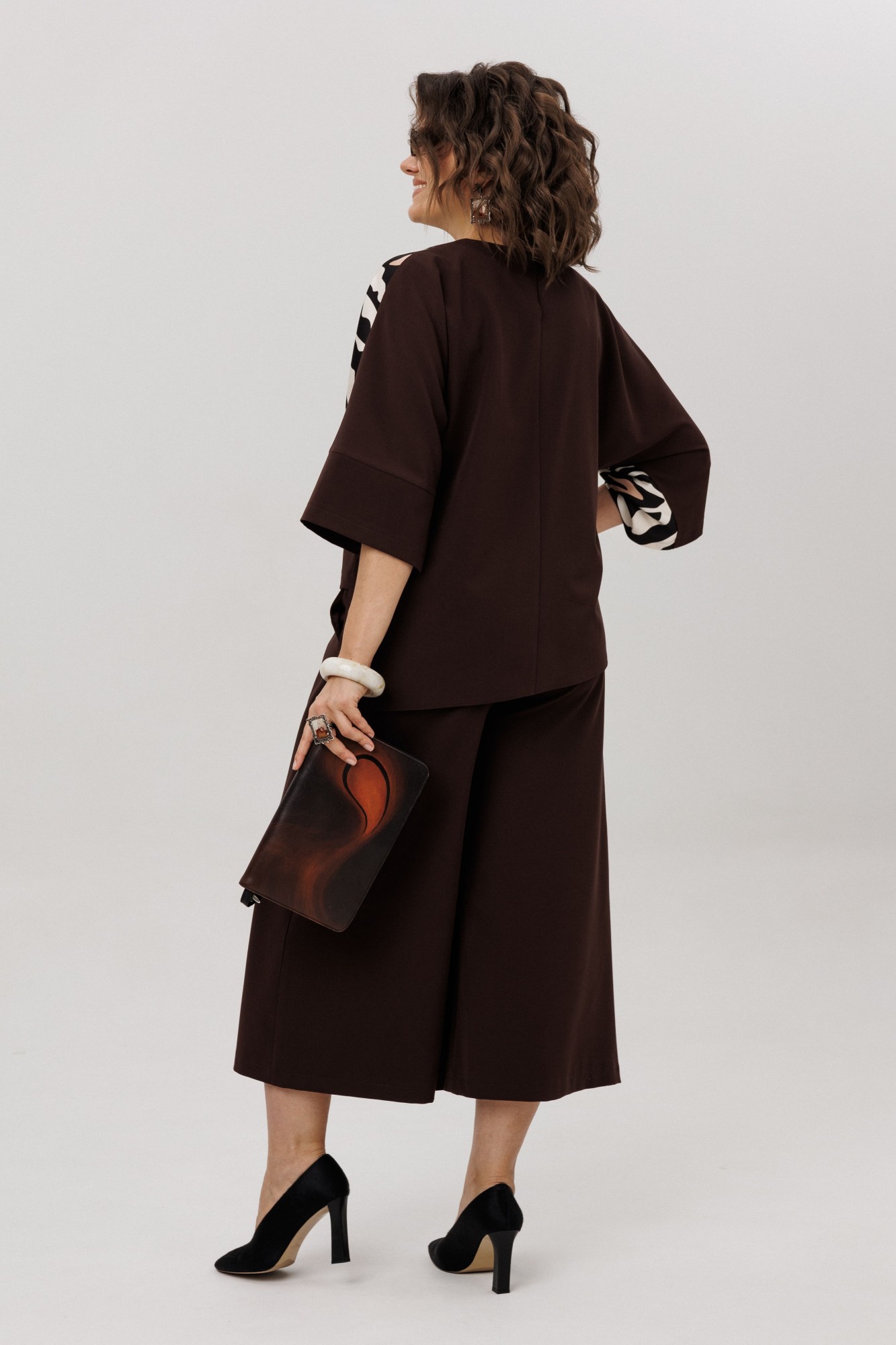 Вероятно, это именно тот костюм, который вы так долго искали. Сочетание строгого силуэта и лёгкой небрежности в цвете «каменные горы». Блузон свободно обрисовывает фигуру, смягчая линии цельнокроеными рукавами. А его главная деталь - фигурный, словно волной очерченный низ, который придаёт статичному крою неожиданную динамику. Низ костюма это юбка-брюки-кюлоты на высокой талии, струящиеся и расклешённые. Модель на запах с мягкими складками создаёт ощущение простора и лёгкости, а скрытые, фигурные карманы в швах берегут чистоту линий. Этот ансамбль от Анелли дышит той особой роскошью, что заключена в безупречной свободе и универсальности. Он готов стать центром вечернего праздника, но с той же уверенностью будет сопровождать вас в будни, будь то деловая встреча или прогулка по городу. И каждая вещь, самостоятельно сочетаясь с другими предметами гардероба, раскрывается с новой стороны, предлагая бесконечные возможности для стиля. Приобрести юбку-кюлоты можно отдельно, артикул 1783.