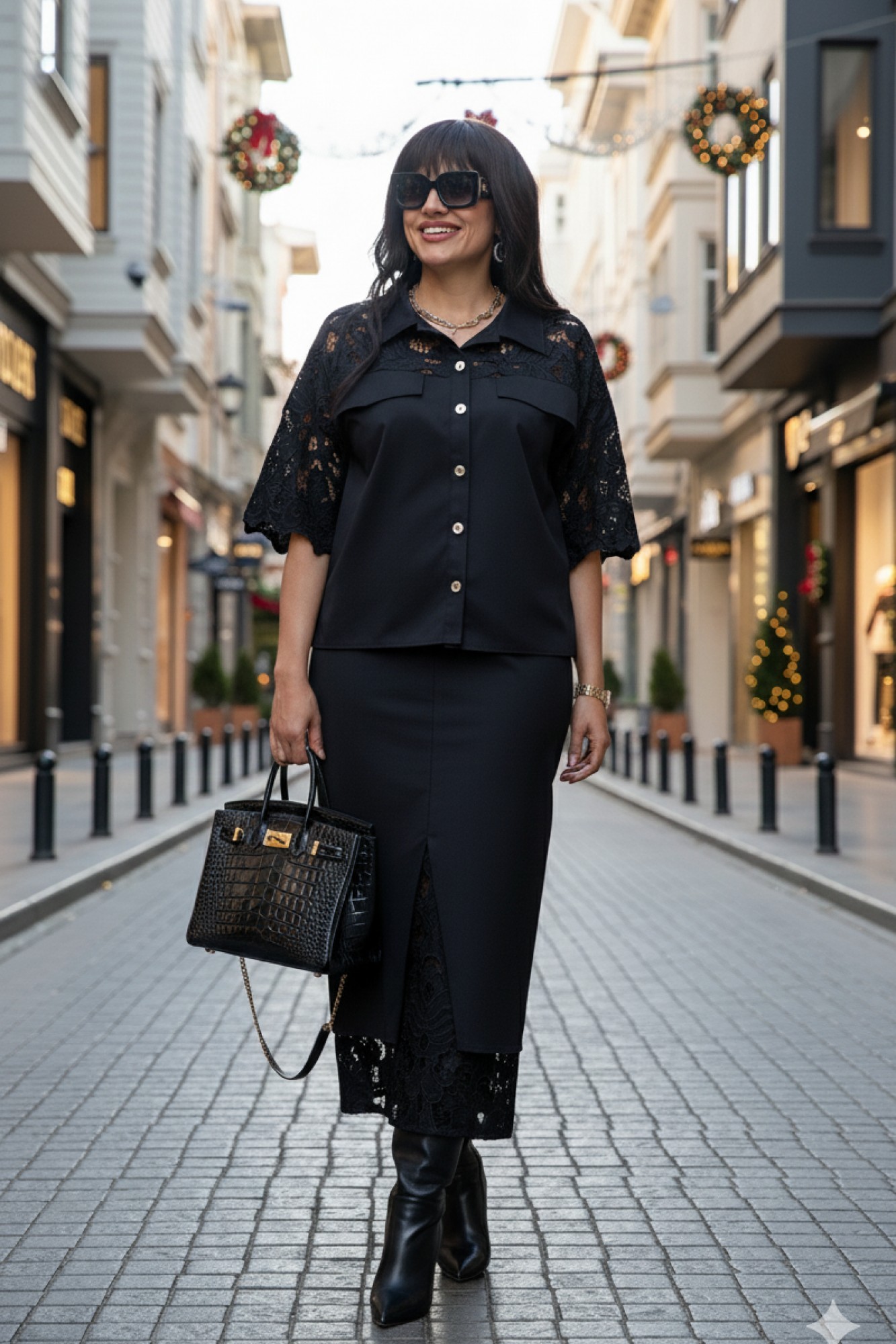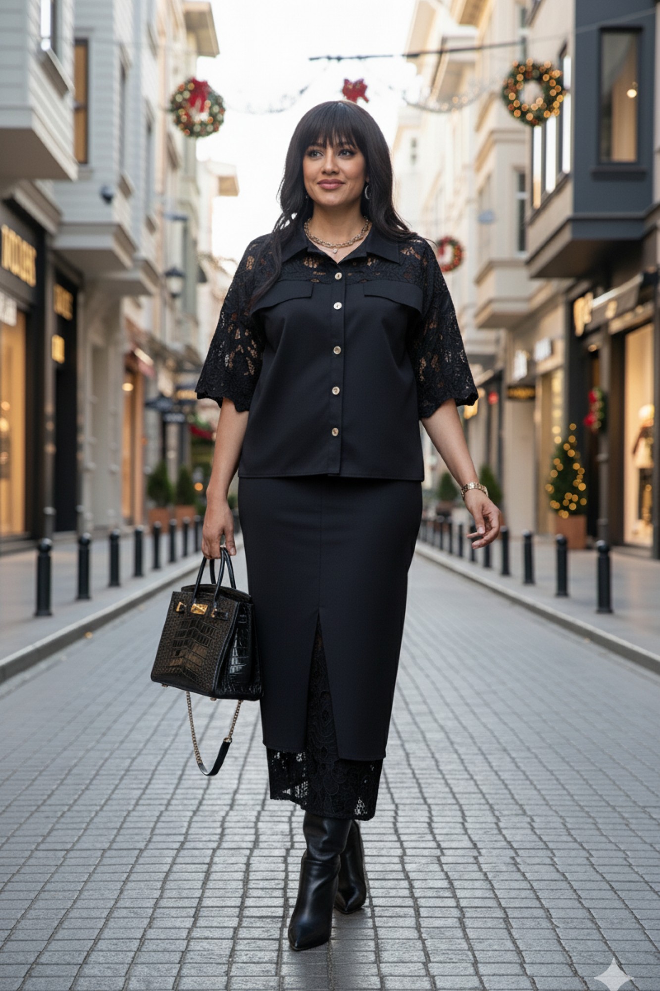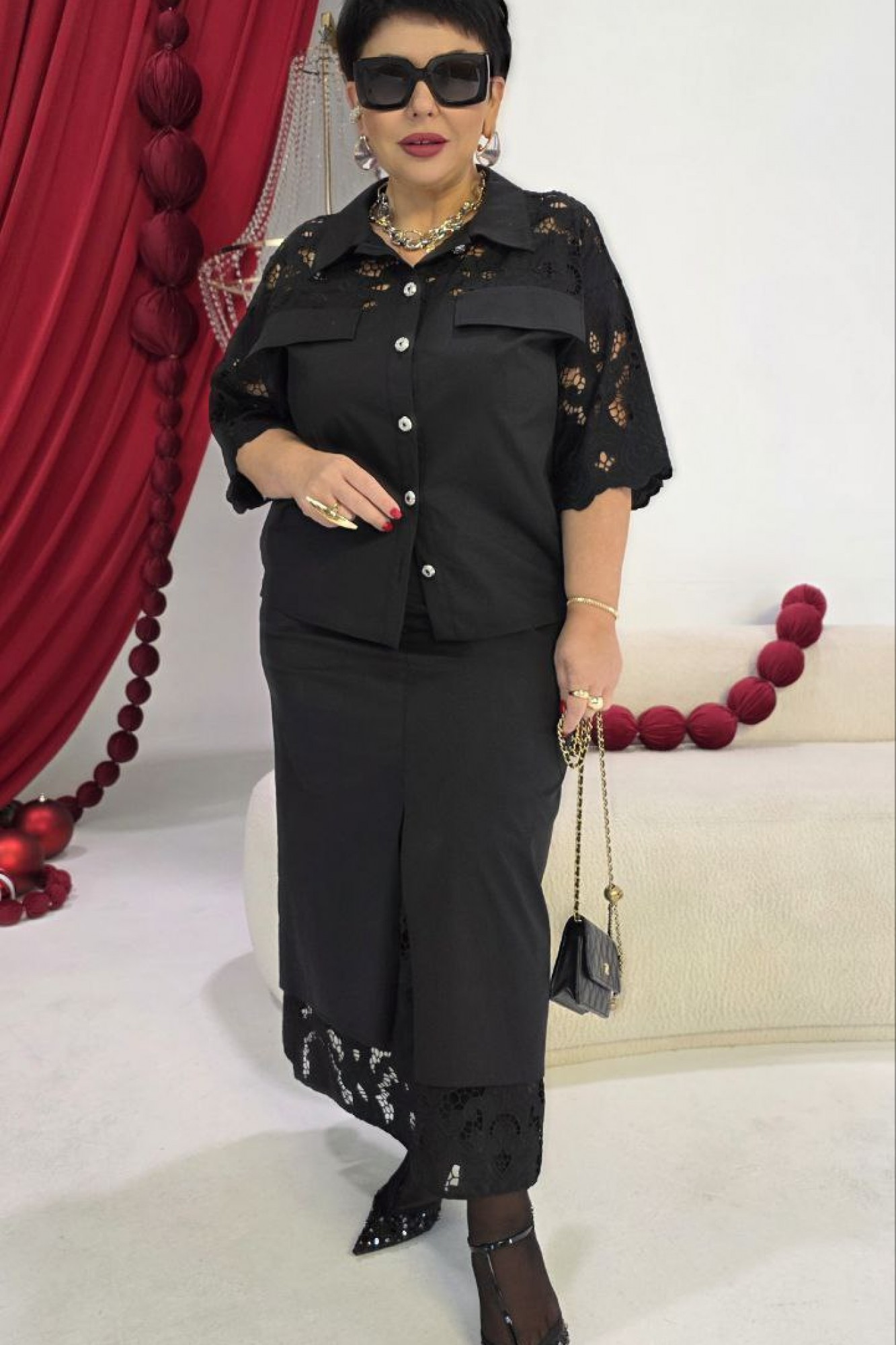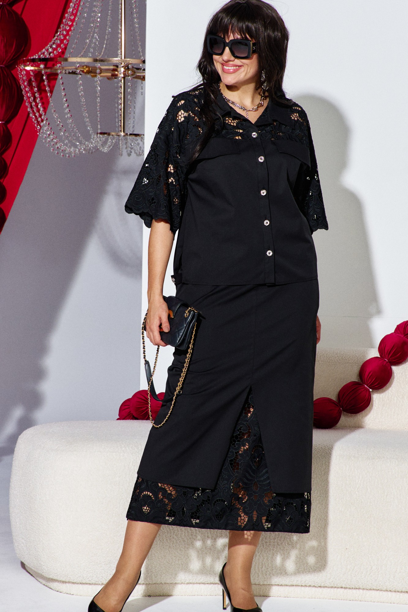 Костюм юбочный женский, состоящий из блузки и юбки. Комбинация однотонного хлопка и вышитого гипюра в тон создаёт ощущение монолитности и изысканности. Верх и низ костюма образуют единое целое: простая, сдержанная геометрия блузы подается как холст для элегантности юбки, превращая костюм в идеальный выбор для событий, где важна сдержанность и сила стиля. Блузка свободного силуэта, укороченная, с центральной застёжкой на петли-пуговицы по планке, низ в блузке ассиметричный. Воротник в блузе рубашечного типа. По переду блузки отрезные кокетки из отделочной ткани в тон- гипюра на просвет, декоративными клапанами. Спинка в блузке с отрезной кокеткой из отделочной ткани в тон-гипюра на просвет. В боковых швах блузки разрезы с декоративным элементом в виде паты, фиксирующейся отделочной пуговицей. Рукав в блузке втачной, длиной ¾, из отделочной ткани-гипюра с фестонами по низу. Юбка прямого силуэта, длины миди, с застёжкой на тесьму-молнию в гульфике и пуговицу в поясе, по переду юбки средний шов переходящий в разрез, и прорезные карманы. Заднее полотнище юбки со средним швом. Пояс притачной, со вставкой эластичной тесьмы-резинки в бочках. Юбка на подкладке, к подрезу подкладки притачивается деталь из отделочной ткани-гипюра в тон.