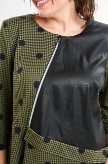 Комплект женский 2-х предметный, состоящий из юбки и блузы, блуза изготовлена из эластичного трикотажного полотна средней плотности, юбка из качественной экокожи. Блузка ассиметричная, со вставкой из экокожи и косой декоративной молнией, которые придают изысканность и шарм изделию. Перед блузки с нагрудными выточками и отрезной баской. Вырез горловины округлый. Спинка с талиевыми выточками и ассиметричной баской. Рукав одношовный втачной длиной 3/4. Юбка прямая из экокожи на подкладке. Перед юбки с подрезами и листочками, а спинка - со средним швом и молнией. Верх переда и спинки обработан обтачкой-кокеткой. Комплект подарит повседневный комфорт и сделает образ ярким, интересным и незабываемым.