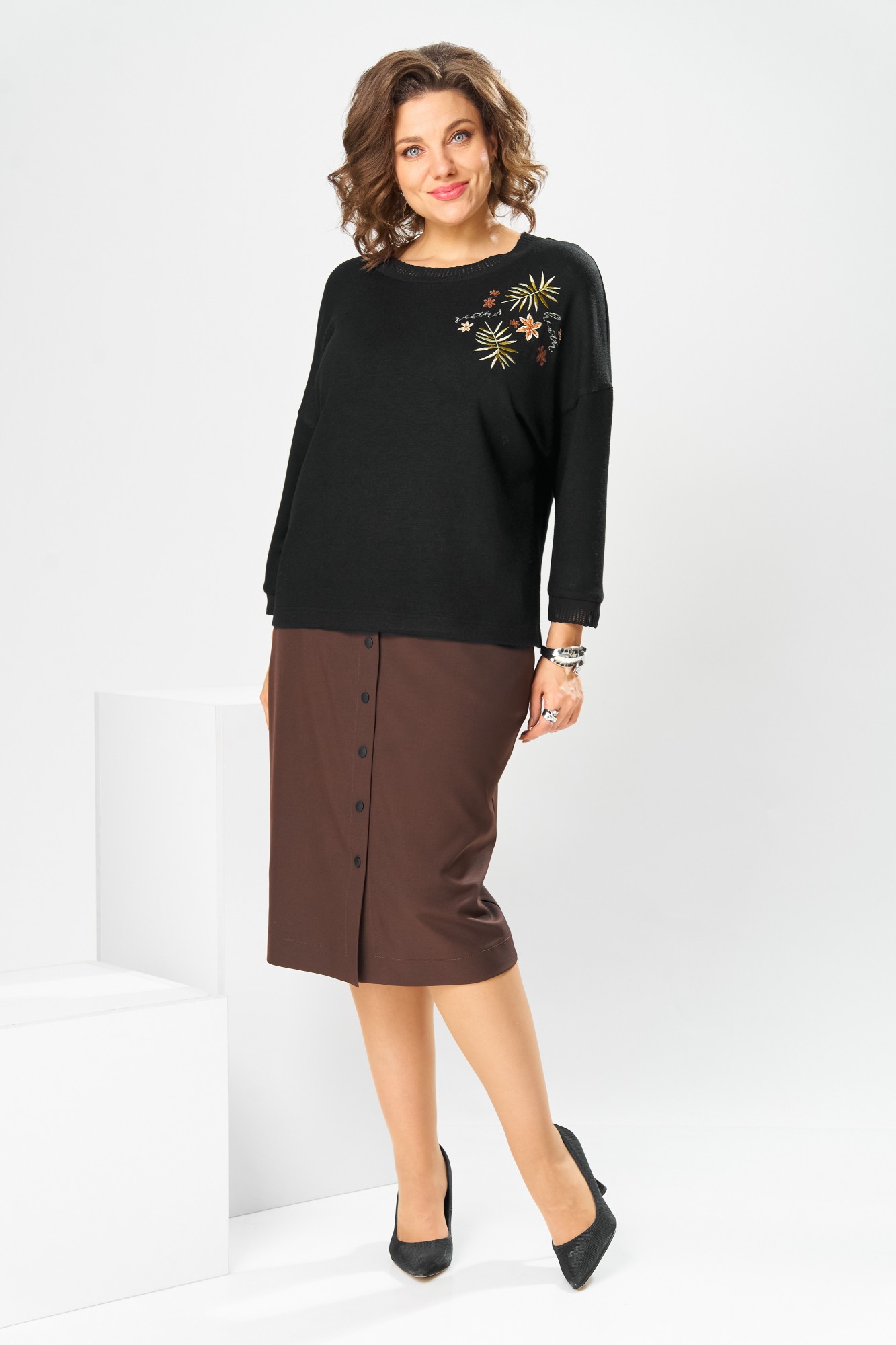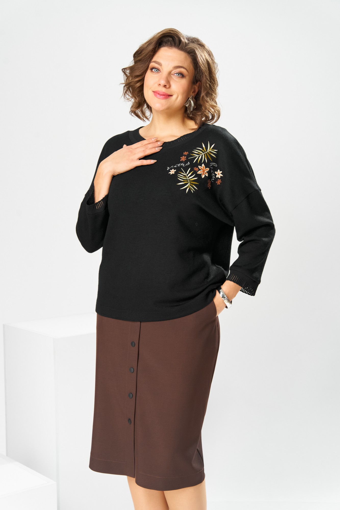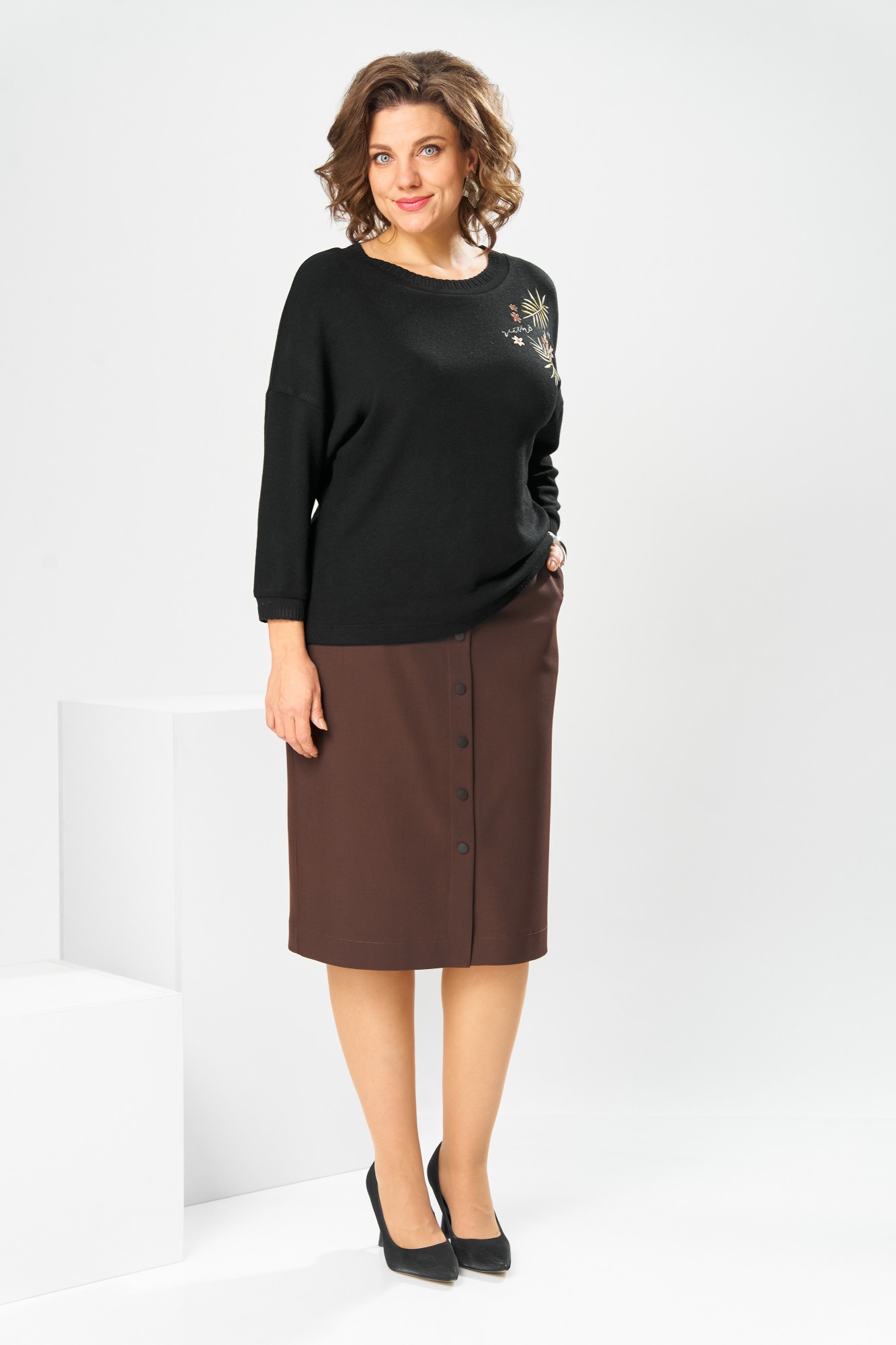 Костюм женский двух предметный: джемпер и юбка предназначен для повседневной носки. Джемпер прямого силуэта, длиной до линии бедер. Перед цельнокроеный, декорирован худ. Вышивкой. Спинка цельнокроеная. Горловина круглая, с втачной фигурной планкой из отделочной ткани. Джемпер со спущенной проймой. Рукав втачной, одно шовный, длиной 7/8. Юбка прямая, длиной ниже колена. Переднее полотнище с двумя боковыми фигурными карманами. Заднее полотнище с двумя таллиевыми вытачками. Застежка спереди на 8 металлических кнопок. Верхний срез с притачным поясом, с 4 надстрочными шлевками, между карманами и вытачками заднего полотнища пояс собран на эластичную тесьму. Юбка на подкладке.