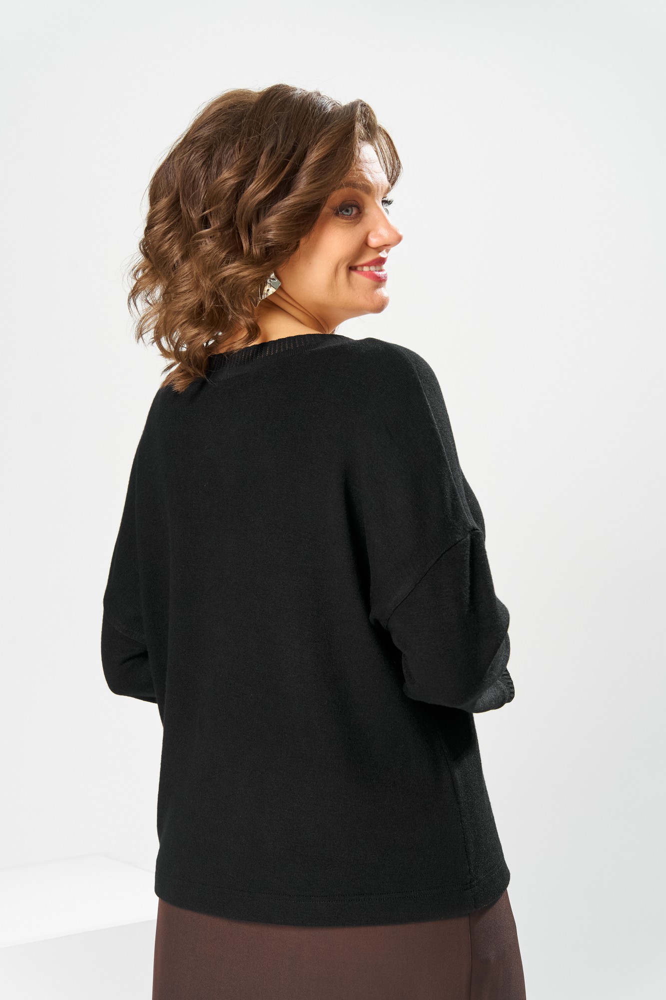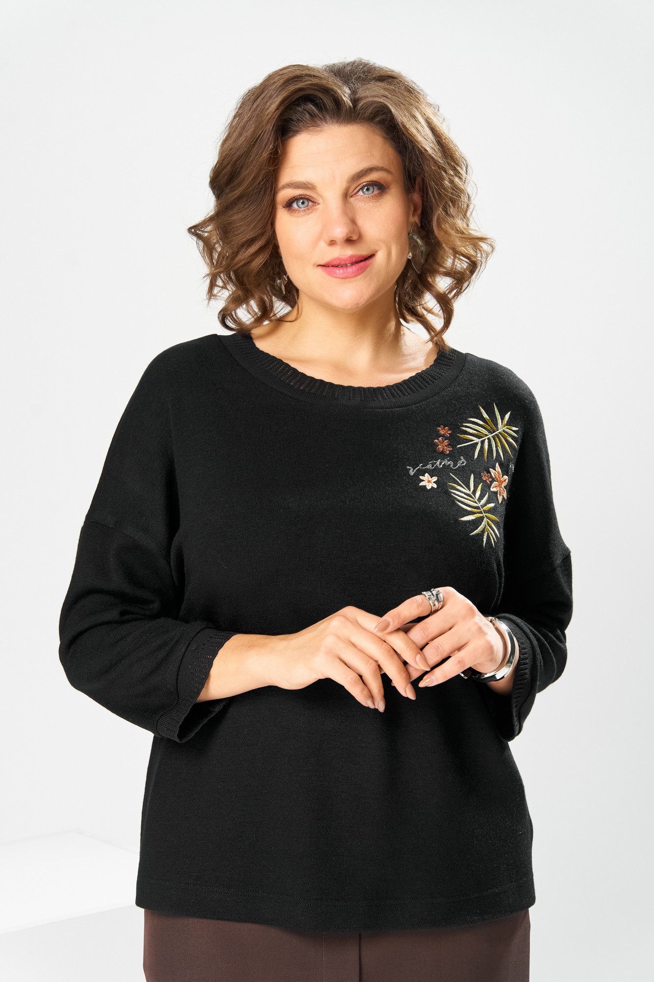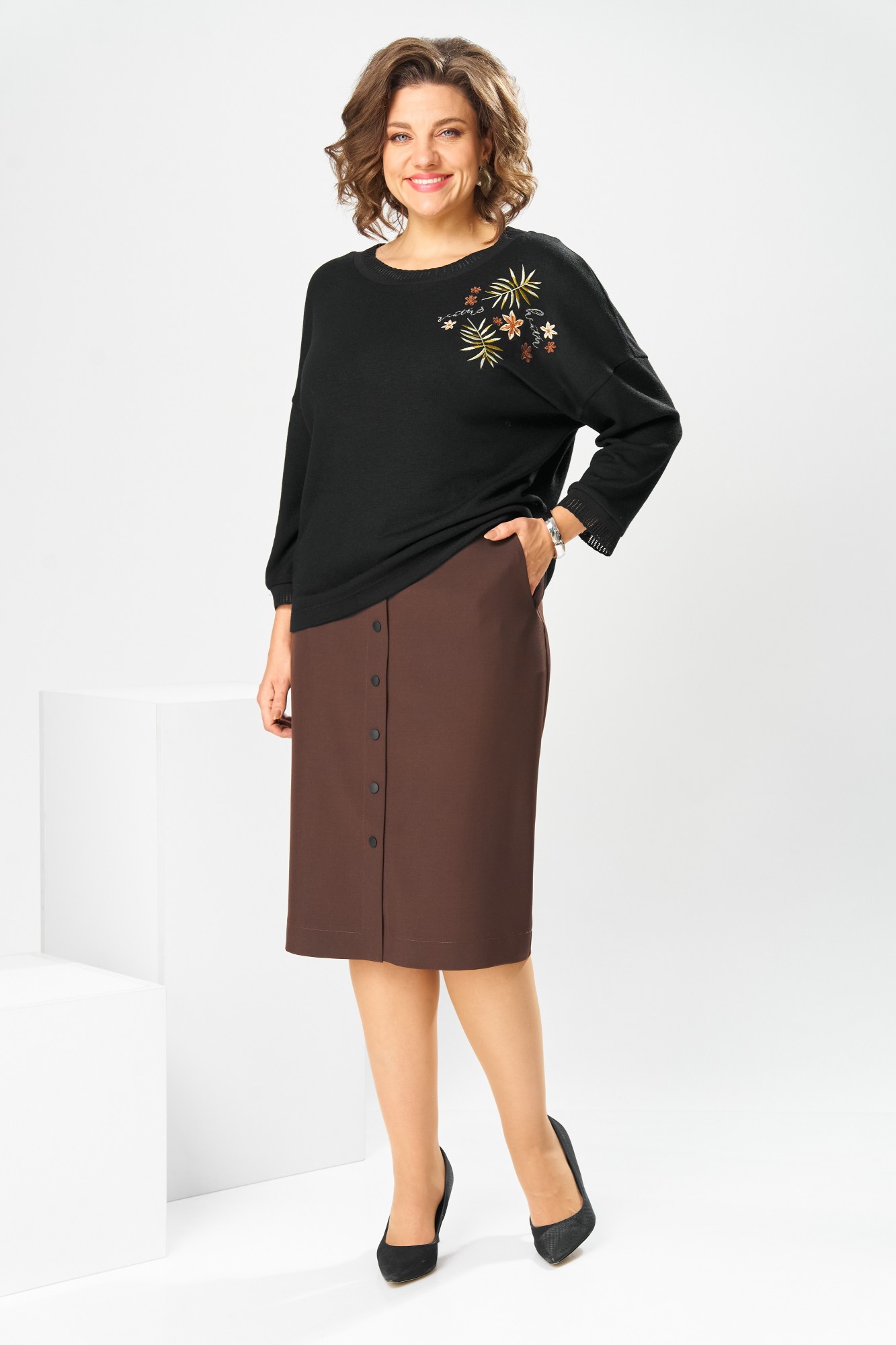 Костюм женский двух предметный: джемпер и юбка предназначен для повседневной носки. Джемпер прямого силуэта, длиной до линии бедер. Перед цельнокроеный, декорирован худ. Вышивкой. Спинка цельнокроеная. Горловина круглая, с втачной фигурной планкой из отделочной ткани. Джемпер со спущенной проймой. Рукав втачной, одно шовный, длиной 7/8. Юбка прямая, длиной ниже колена. Переднее полотнище с двумя боковыми фигурными карманами. Заднее полотнище с двумя таллиевыми вытачками. Застежка спереди на 8 металлических кнопок. Верхний срез с притачным поясом, с 4 надстрочными шлевками, между карманами и вытачками заднего полотнища пояс собран на эластичную тесьму. Юбка на подкладке.