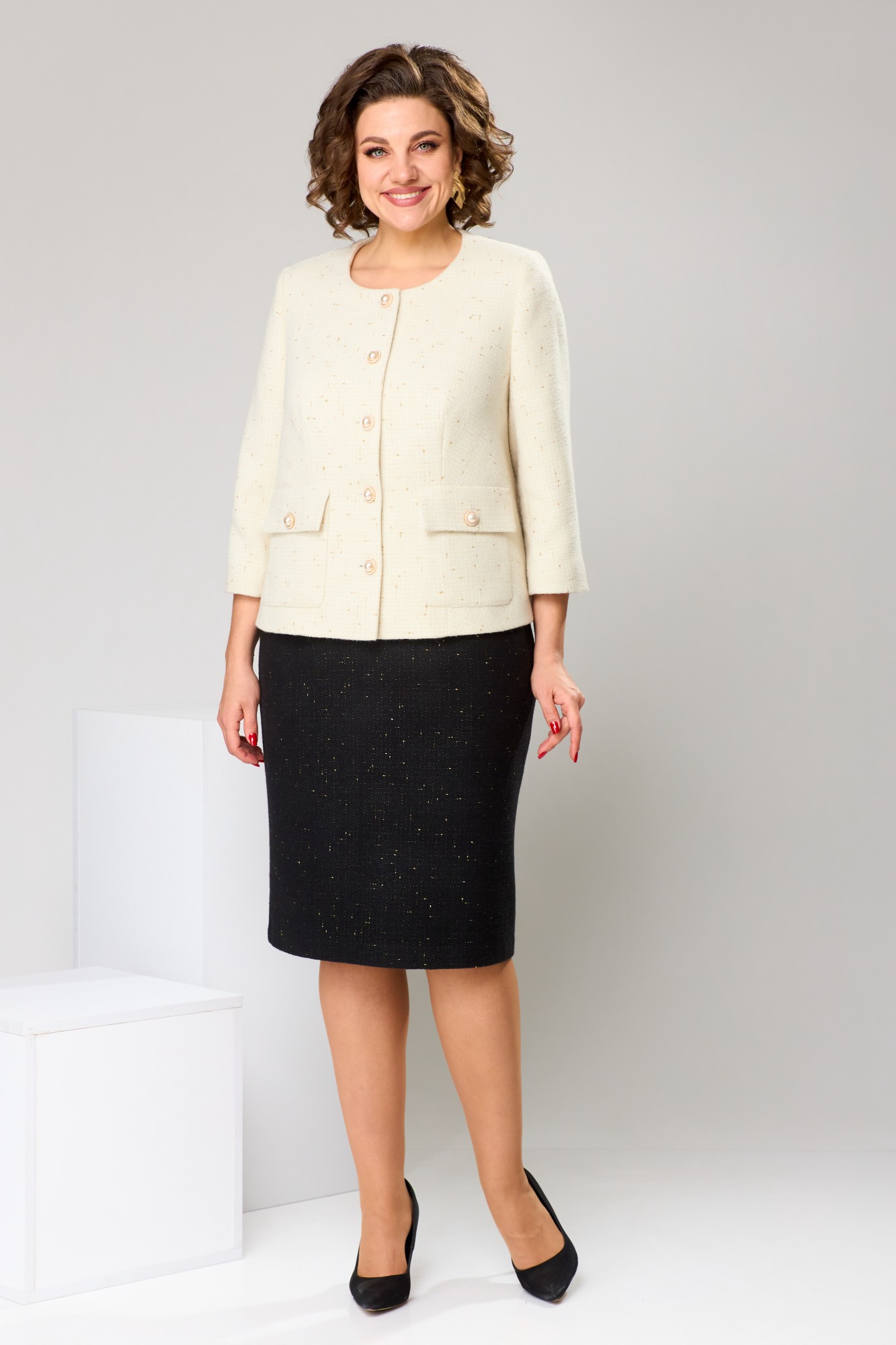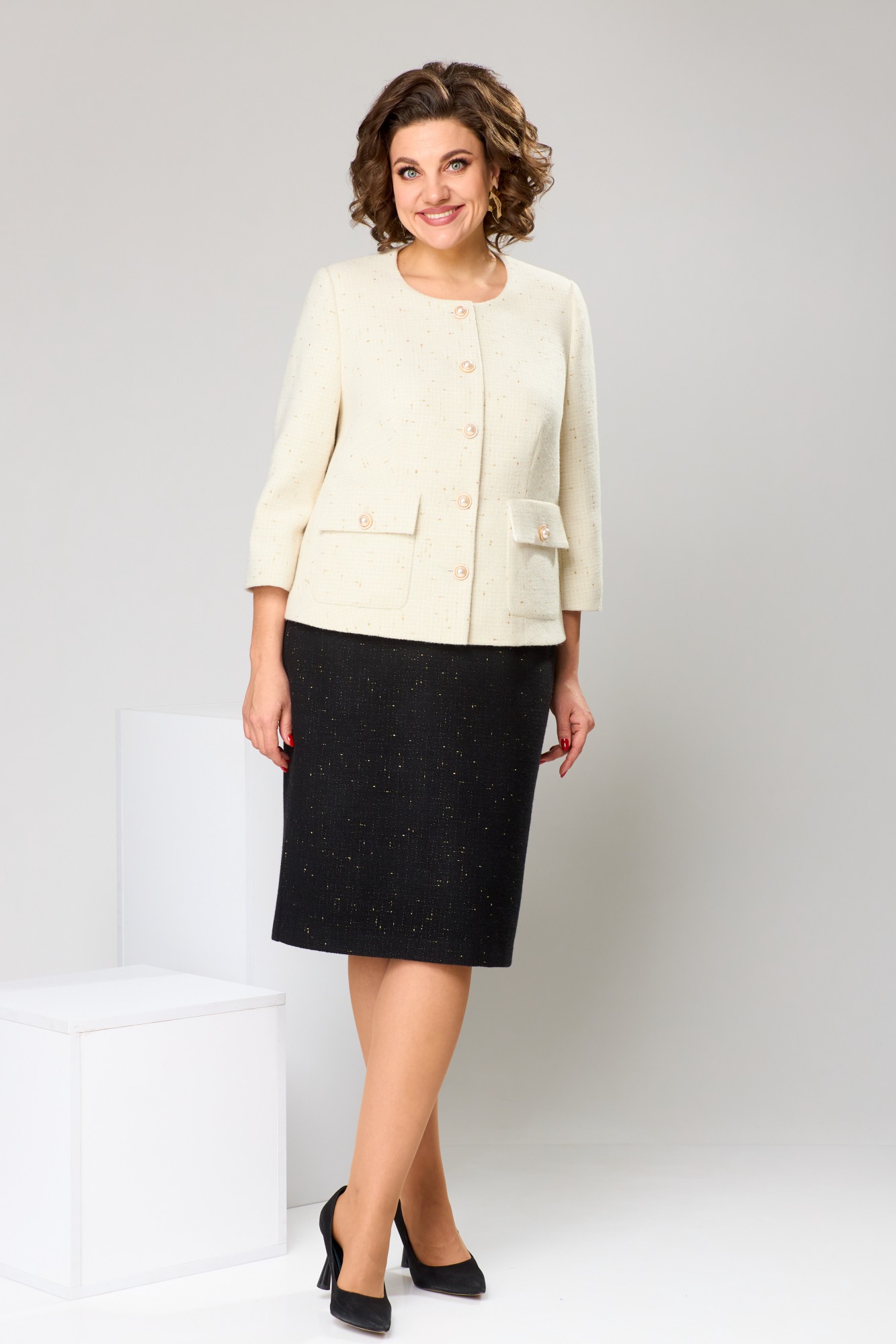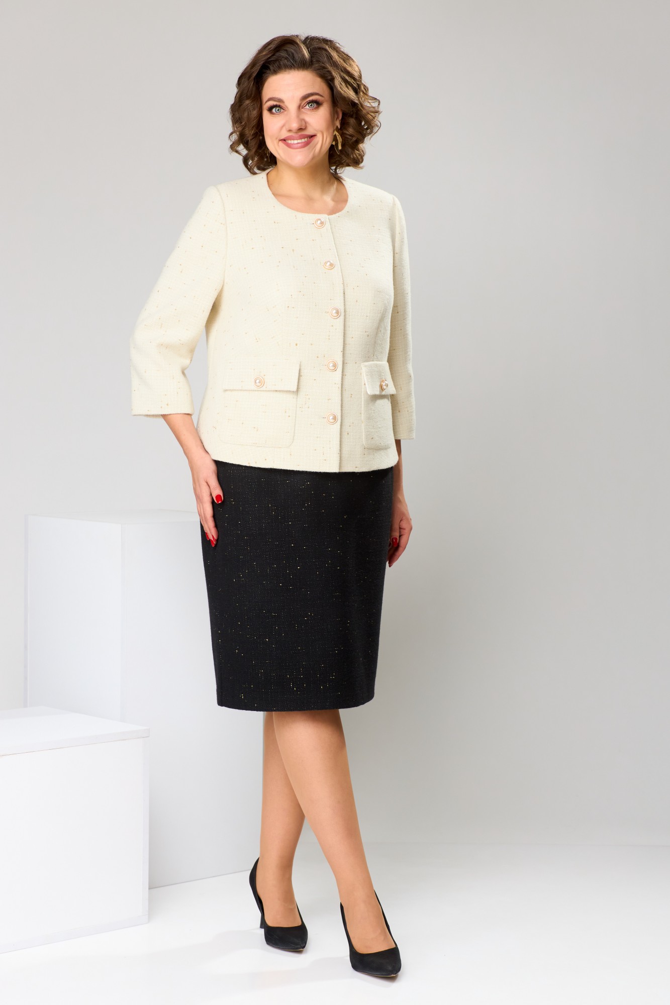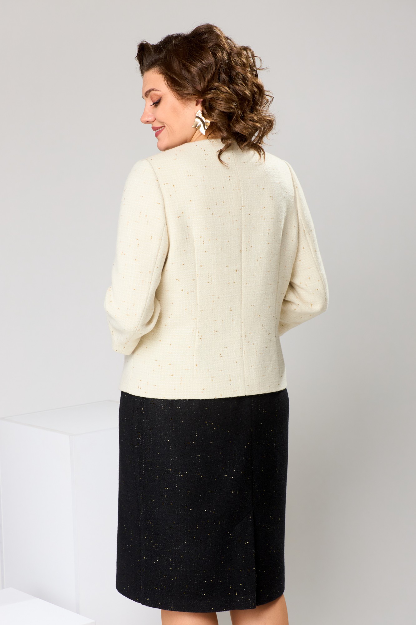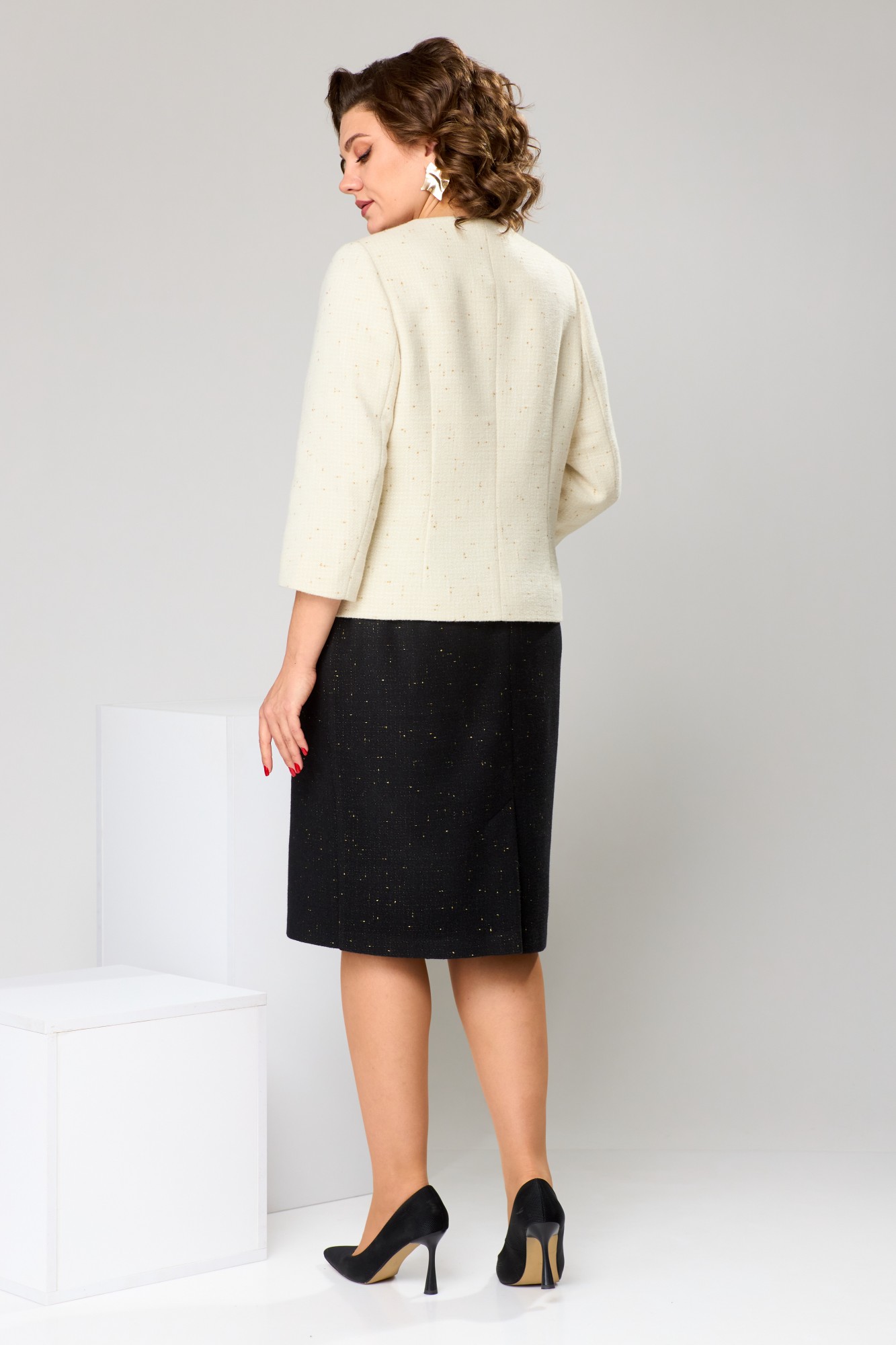 Длина спинки жакета 57 см, длина рукава 47 см, длина юбки по боковому срезу 61 см.