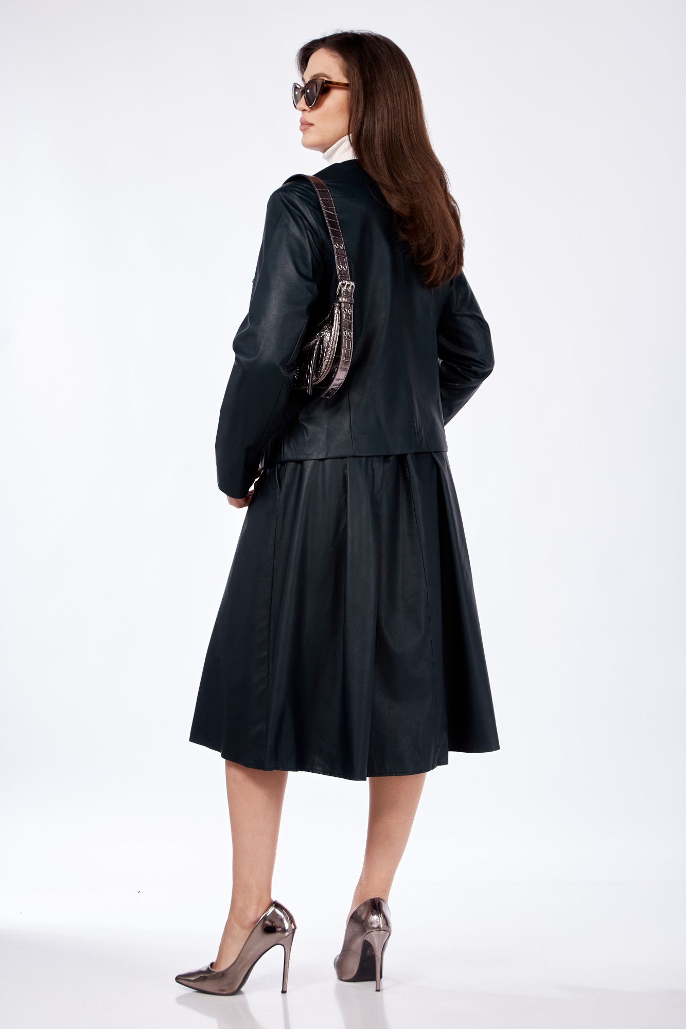 Комплект двойка .Жакет женский приталенного силуэта выполнен из экокожи. По переду обработаны рельефы с карманами. Отделкой служит застежка на декоративную железную молнию по диагонали изделия с заходом на кнопки. Спинка разрезная по центру. Рукав двухшовный. Изделие на подкладке. Юбка полуклеш с красиво оформленными двумя складками по передней и задней части изделия, но при этом не создающую объёма по линии талии. Выполнена из экокожи. на притачном поясе. По спинке застежка потайная молния. Украшением служит пришивная брошь на поясе (может отличаться от фото).Юбка на подкладке с двумя действующими карманами. Деликатная стирка при 30 градусах!