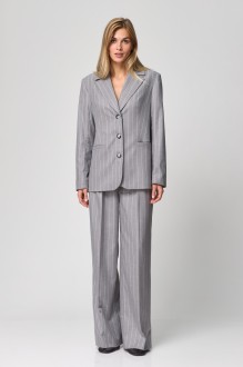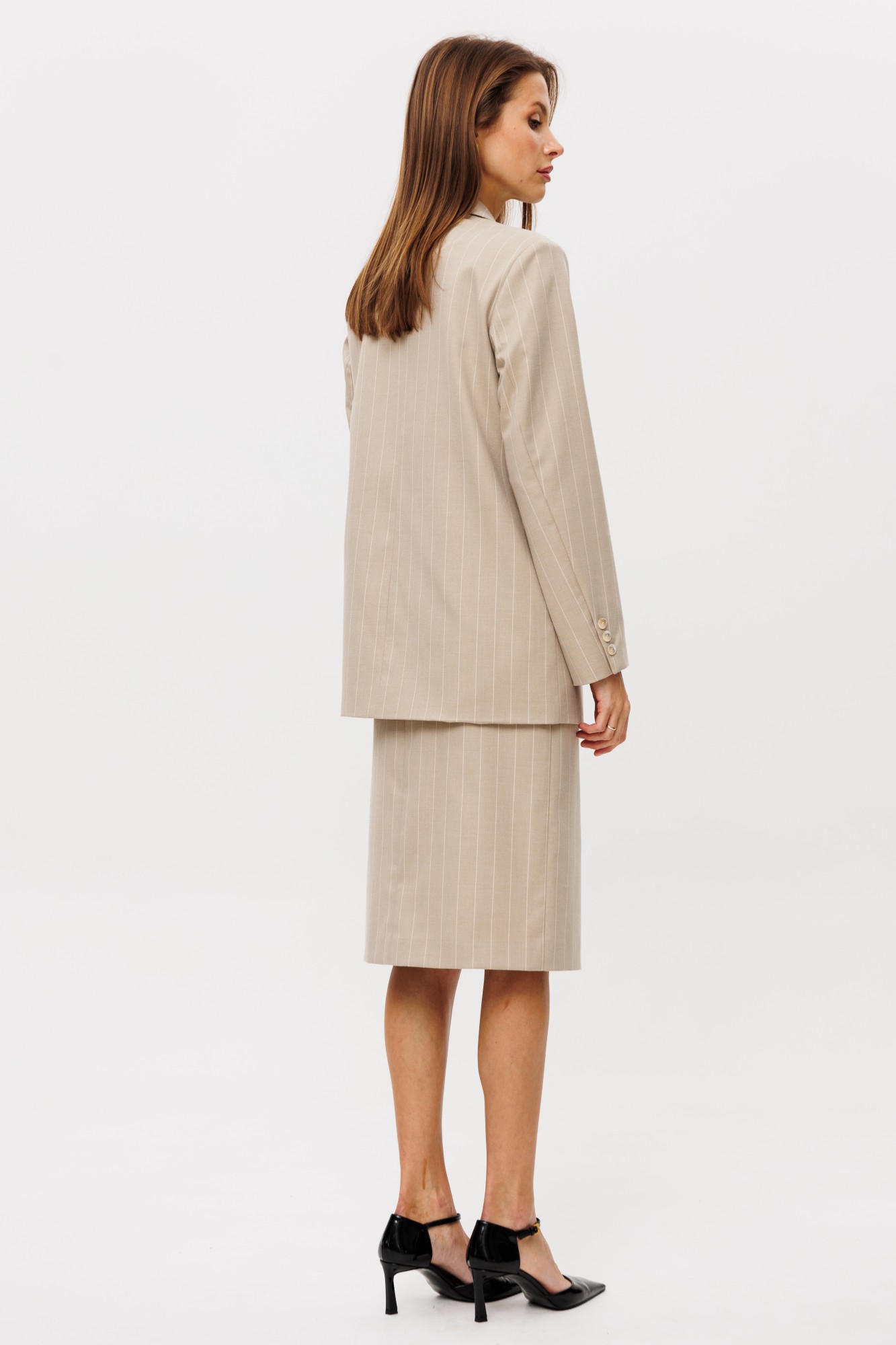Костюм двухпредметный из жакета и юбки. Жакет пошит таким образом, чтобы в нем было комфортно женщине любого возраста, с любыми формами. Жакет двубортный, с нагрудными выточками, прорезные карманы в рамку с клапанами, застежка на петли и пуговицы, спинка со средним швом, втачные двухшовные рукава, с тремя отделочными пуговицами, жакет на подкладке. Выполнен из премиальной ткани костюмной группы. Классическая повседневная юбка прилегающего силуэта на притачном поясе со шлевками, с боковыми функциональными карманами,, юбка на подкладке, сзади застежка на молнию и петлю-пуговицу. По переду и спинке вытачки. Выполнена из ткани костюмной группы. В среднем шве переднего полотнища разрез.