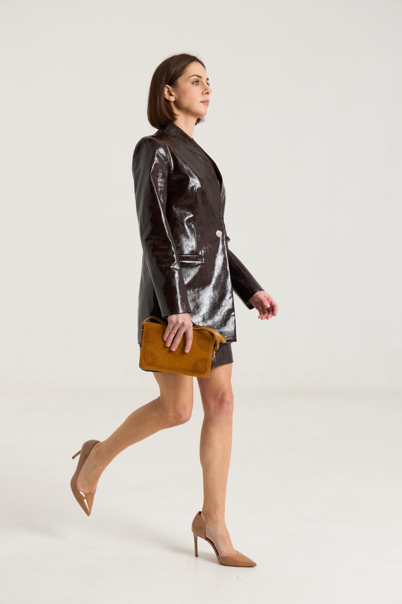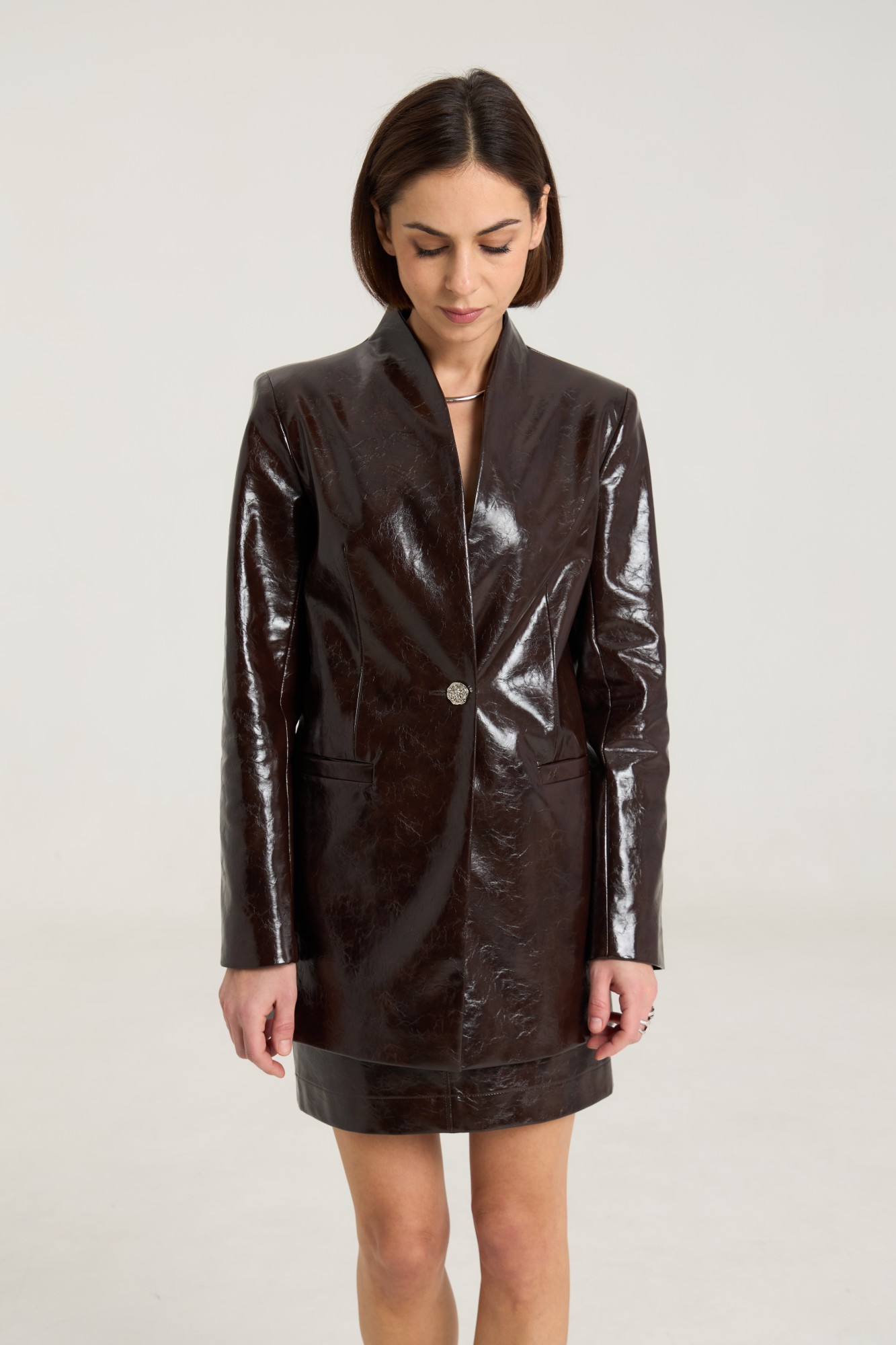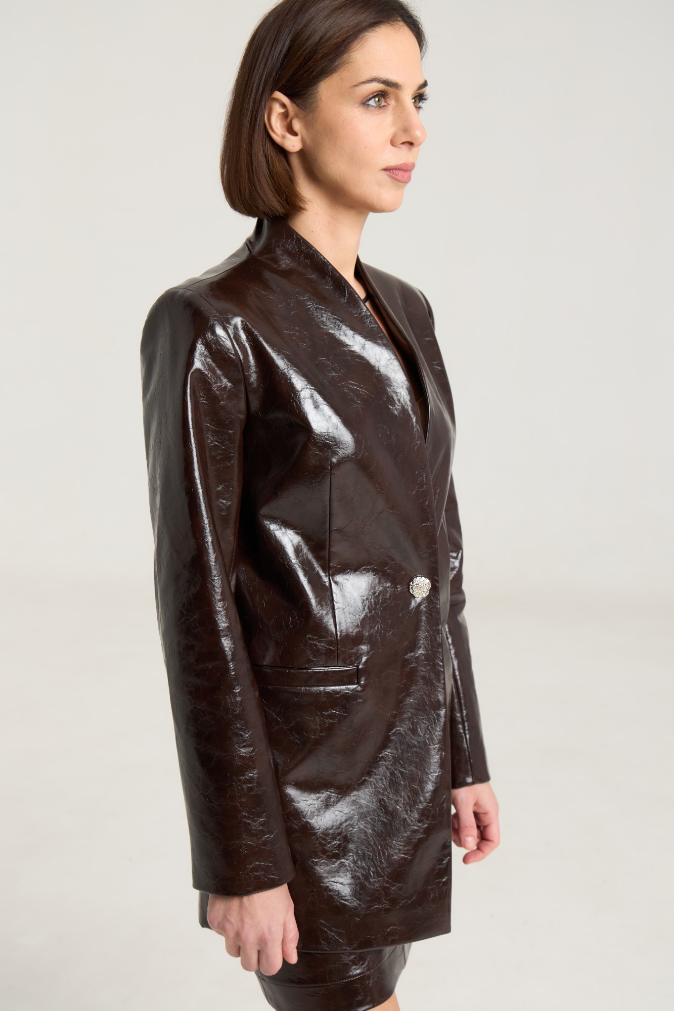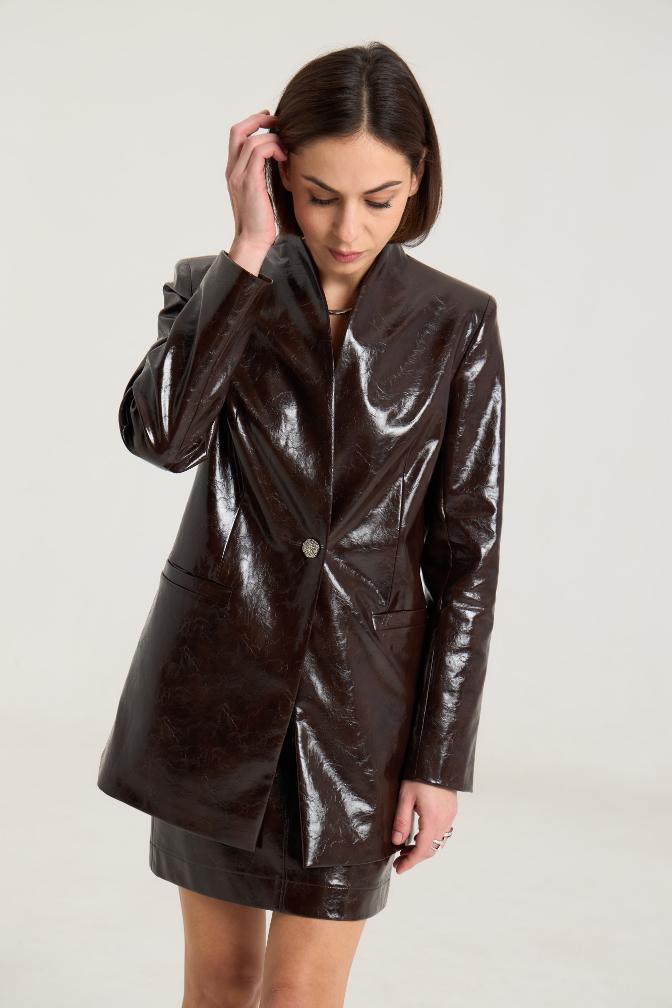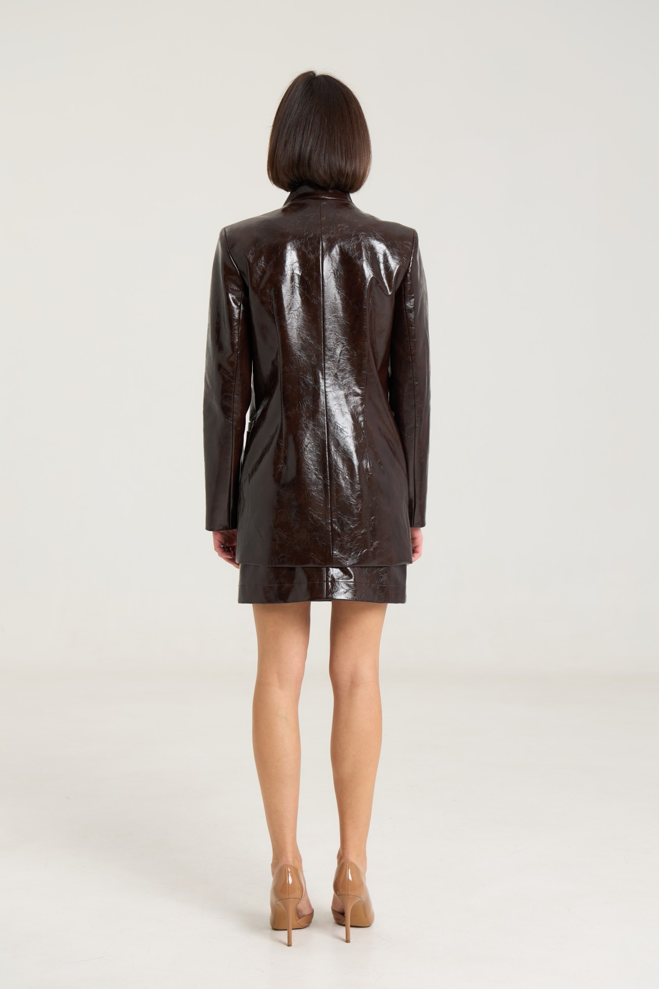 Комплект двухпредметный, состоит из жакета и юбки. Жакет однобортный на одну центральную петлю-пуговицу, на подкладке, полуприлегающего силуэта с прорезными карманами в рамку по переду. Воротник втачной-стойка, рукав двухшовный, спинка жакета разрезная по центру с таллиевыми выточками. Жакет выполнен их плотной лаковой экокожи премиум качества шоколадного цвета. Юбка прилегающего силуэта на притачном поясе, посадка высокая , юбка на подкладке, изделие имеет центральный шов спереди и сзади. В среднем шве застежка на потайную молнию. Юбка выполнена из плотной лаковой экокожи шоколадного цвета.