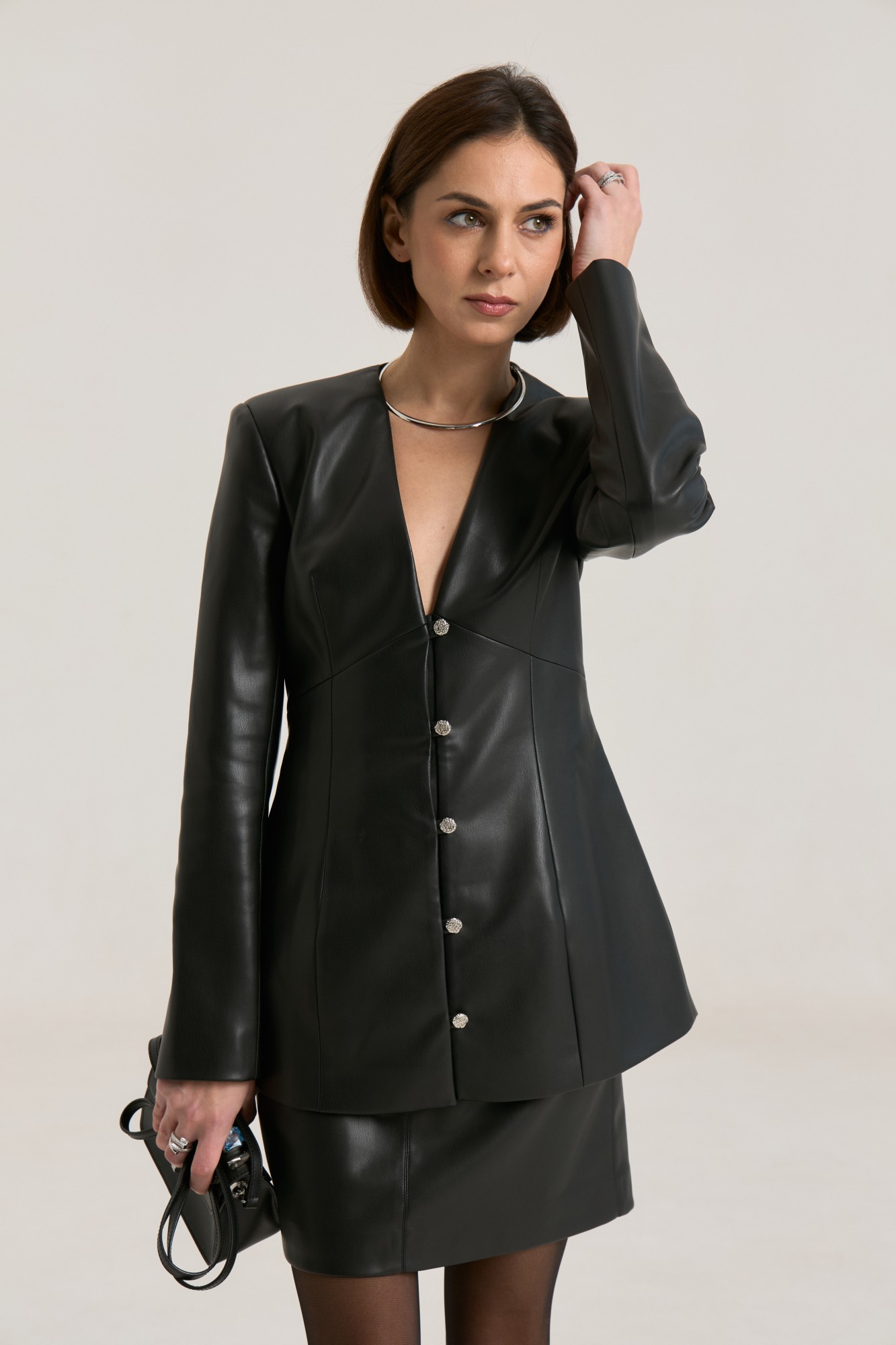 Комплект из жакета и юбки в черной экокоже. Жакет прилегающего силуэта с глубоким V-м вырезом, застежка центральная на навесные петли. Талия отрезная, полочка и спинка верхней части с выточками, нижняя часть полочки с выточками и рельефами. Жакет выполнен из мягкой экокожи черного цвета. Рукав втачной, двухшовный с плечевой накладкой. Жакет на подкладке. Юбка прилегающего силуэта на притачном поясе, посадка высокая , юбка на подкладке. В среднем шве застежка на потайную молнию.