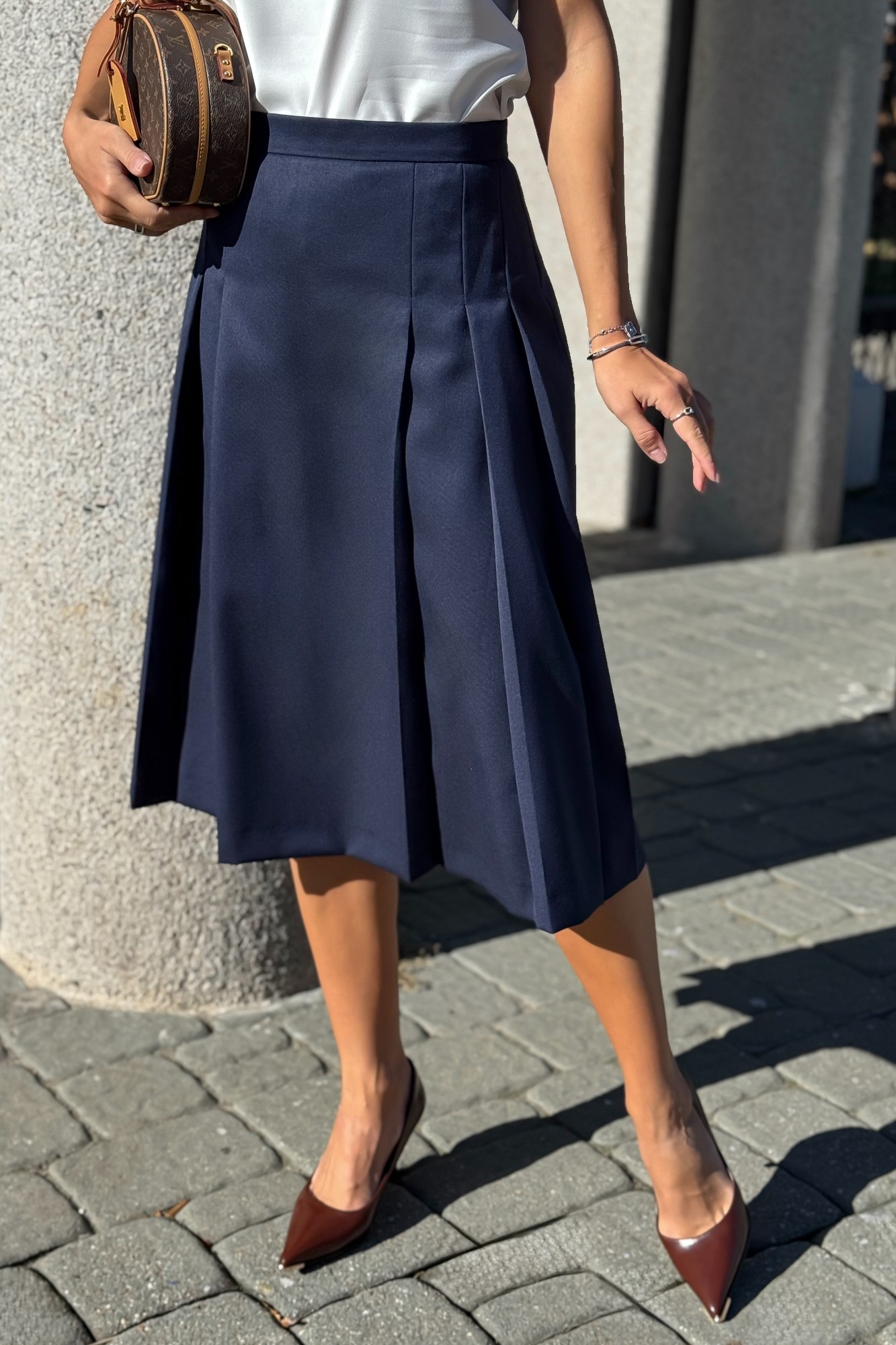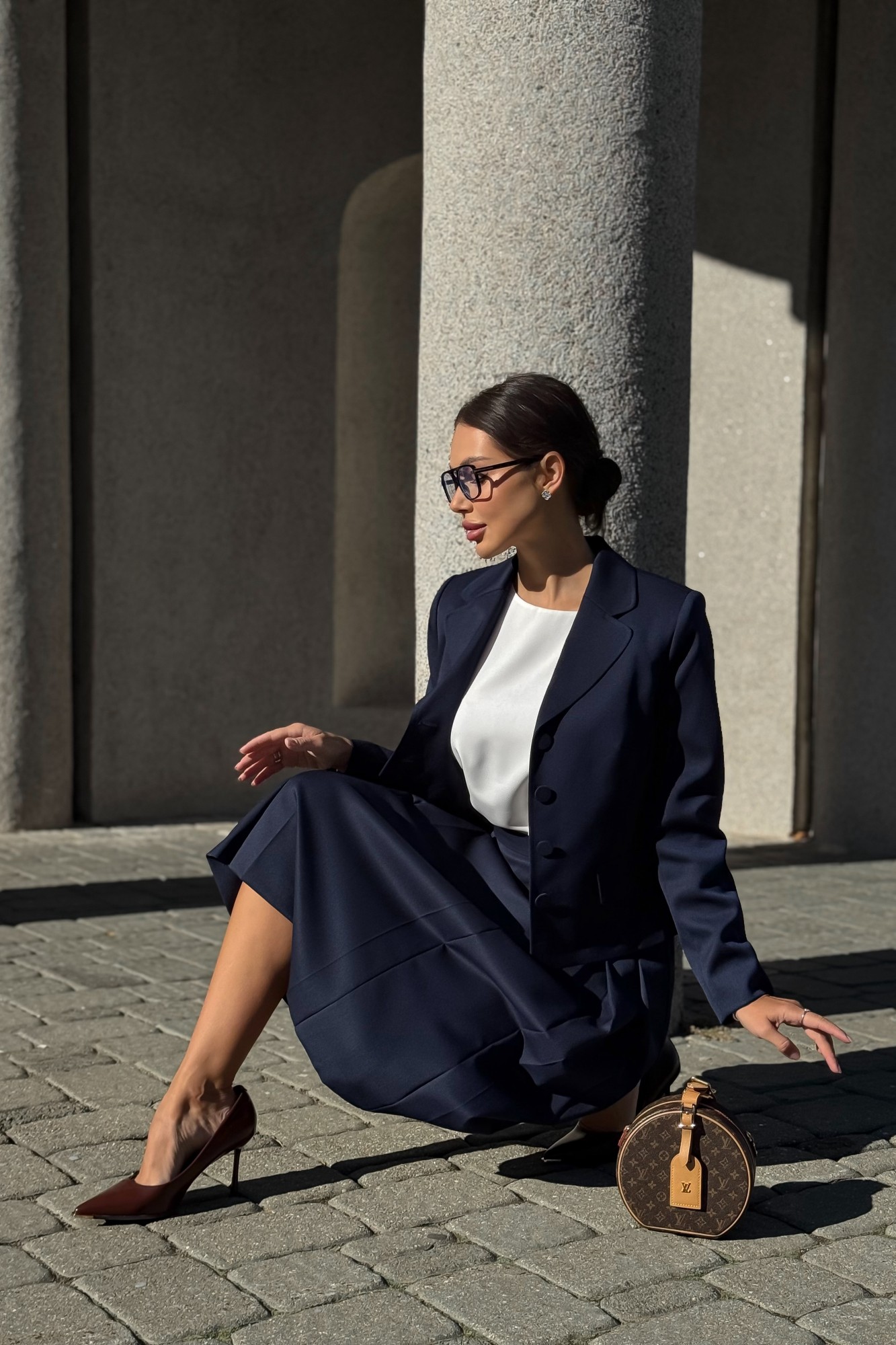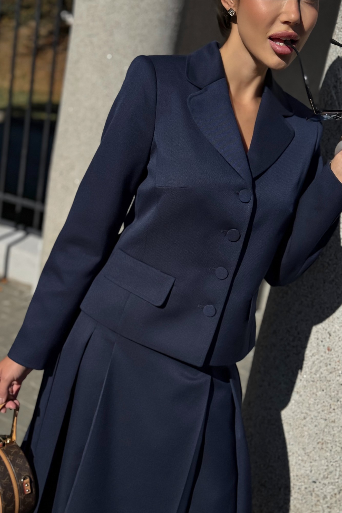 Классический костюм женский с юбкой от URS / ЮРС — безупречный выбор для тех, кто ценит элегантность, строгость и комфорт. Этот деловой костюм состоит из жакета и юбки миди, выполнен из качественной ткани с добавлением шерсти. Костюм женский 2-х предметный, состоящий из жакета и юбки выполненных из костюмно-плательной ткани, предназначен для повседневной носки. Жакет полуприлегающего силуэта, на подкладке, с центральной бортовой застежкой на 4 петли и 4 пуговицы (размер и цвет фурнитуры может незначительно отличаться от фото). Перед со смещенными рельефными швами, идущими из пройм вниз, с нагрудными вытачками, выходящими из рельефных швов к центрам, в нижних частях с прорезными карманами с клапанами. Спинка с рельефными швами и средним швом. Рукава втачные, двухшовные, длинные. Горловина оформлена воротником пиджачного типа. Концы воротника и лацканов закруглены. По воротнику, лацканам, бортам, клапанам прострочена отделочная строчка ш. 0,7 см. Жакет с плечевыми накладками. Юбка расклешенная к низу, на отлетной подкладке, на притачном поясе, застегивающимся на 1 петлю и пуговицу. Переднее полотнище с тремя парами складок. Складки частично застрочены от пояса и заутюжены до низа. Заднее полотнище с таллиевыми вытачками, со средним швом, в верхней части которого обработана застежка на потайную тесьму-молнию. В 50,52,54 размерах в поясе предусмотрены резинки для лучшего прилегания по талии.