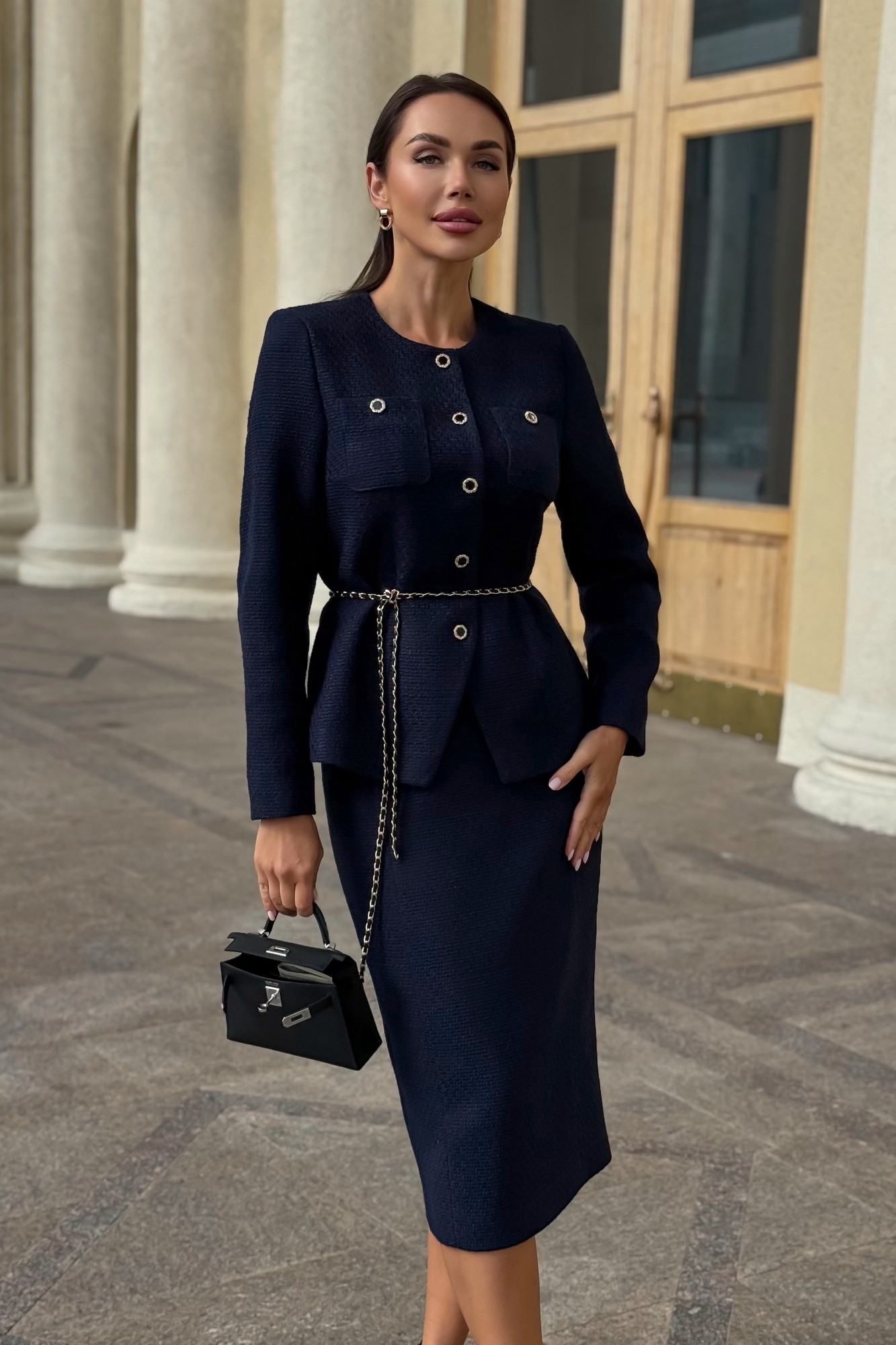Элегантный синий твидовый костюм женский с юбкой от бренда URS создан для тех, кто ценит безупречный стиль, утонченную классику и современный деловой образ. Эта модель воплощает лучшие традиции женской одежды из твида, сохраняя узнаваемую эстетику твидовых костюмов, вдохновленных стилем Chanel, и при этом полностью соответствует требованиям современной моды, дресс-кода и офисного этикета. Костюм женский 2-х предметный, состоящий из жакета и юбки, из костюмной ткани рогожка. Костюм может быть как нарядный, так и для повседневной носки. Жакет полуприлегающего силуэта, на подкладке, с центральной бортовой застежкой до верха на 5 петель и 5 декоративных пуговиц (размер и цвет фурнитуры может незначительно отличаться от фото) с фигурными к низу бортами. Перед с полурельефами и с нагрудными вытачками. В верхних частях с накладными карманами закругленной формы, застегивающимися на 1 петлю и пуговицу. Спинка со средним швом, с рельефами. Рукава втачные, двухшовные, длинные. Горловина круглая, обтачная. Жакет с плечевыми накладками и декоративным поясом – цепочкой. Юбка зауженная к низу, на притачном поясе, застегивающимся на 1 петлю и пуговицу. Переднее полотнище с рельефными швами. Заднее полотнище с таллиевыми вытачками, со средним швом, в верхней части которого обработана застежка на потайную тесьму-молнию, в нижней – шлица. Юбка на притачной по низу подкладке. В размерах 50,52,54 в поясе на уровне боковых швов предусмотрены резинки, для лучшего прилегания по талии.