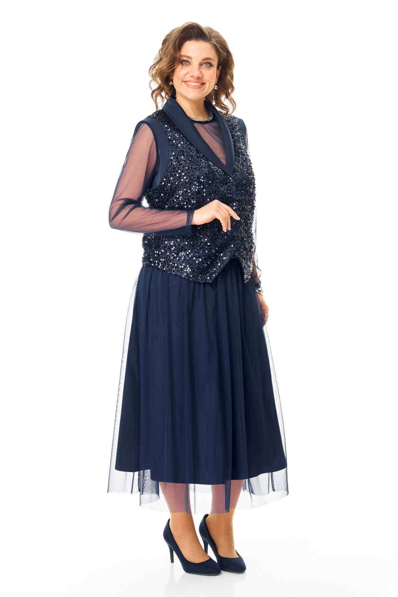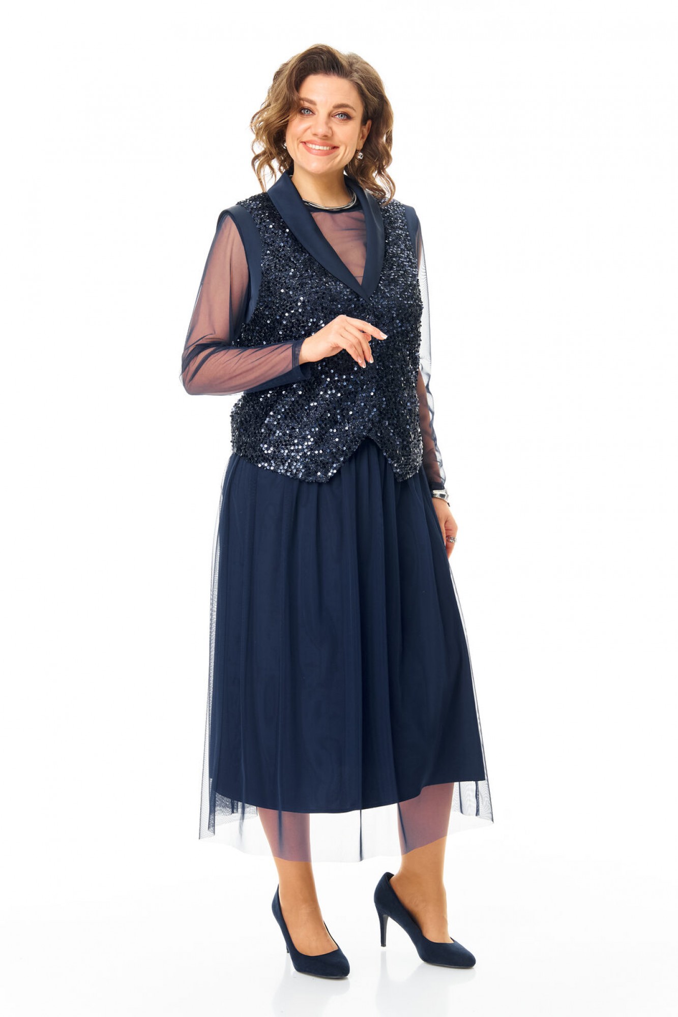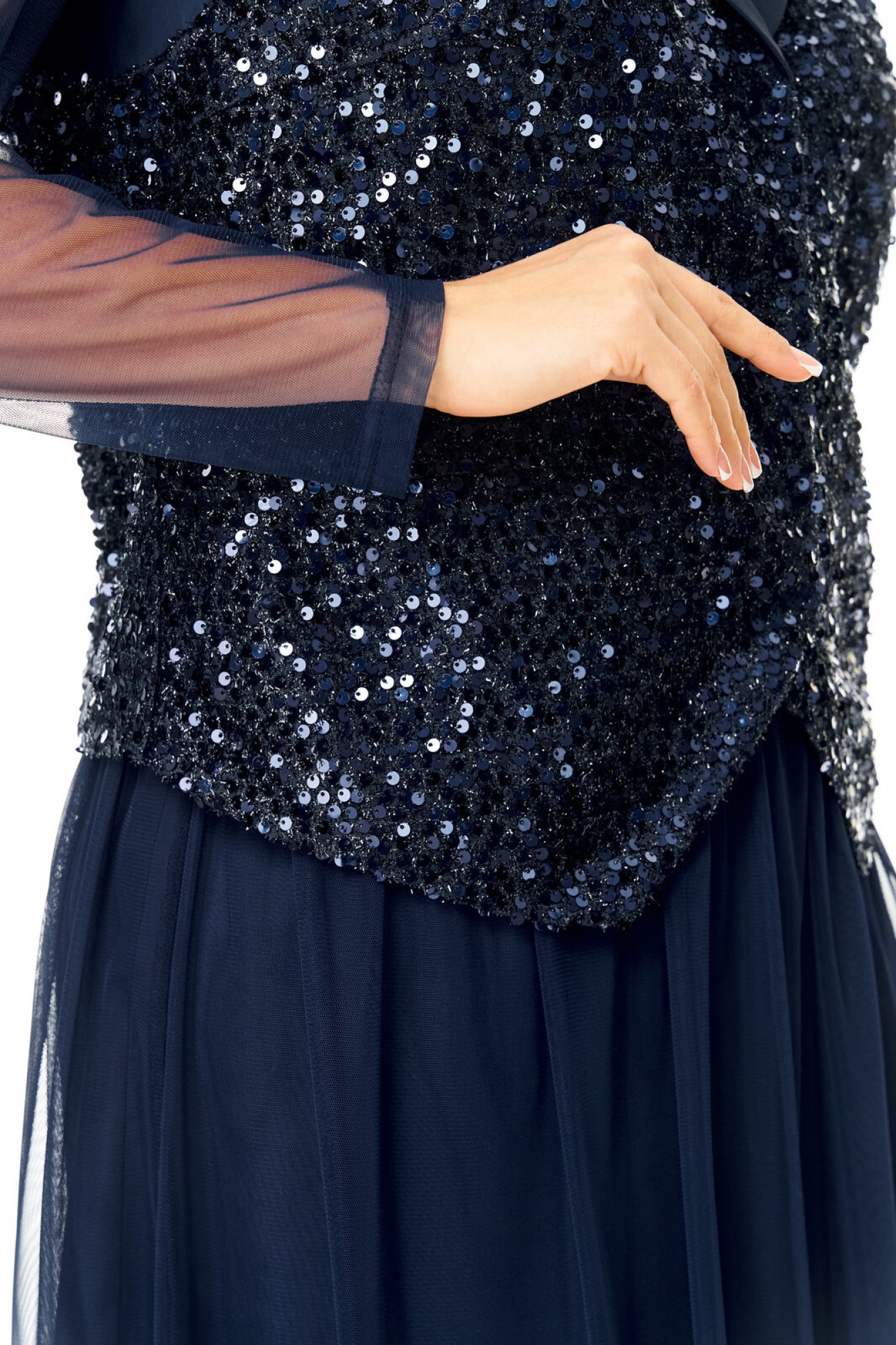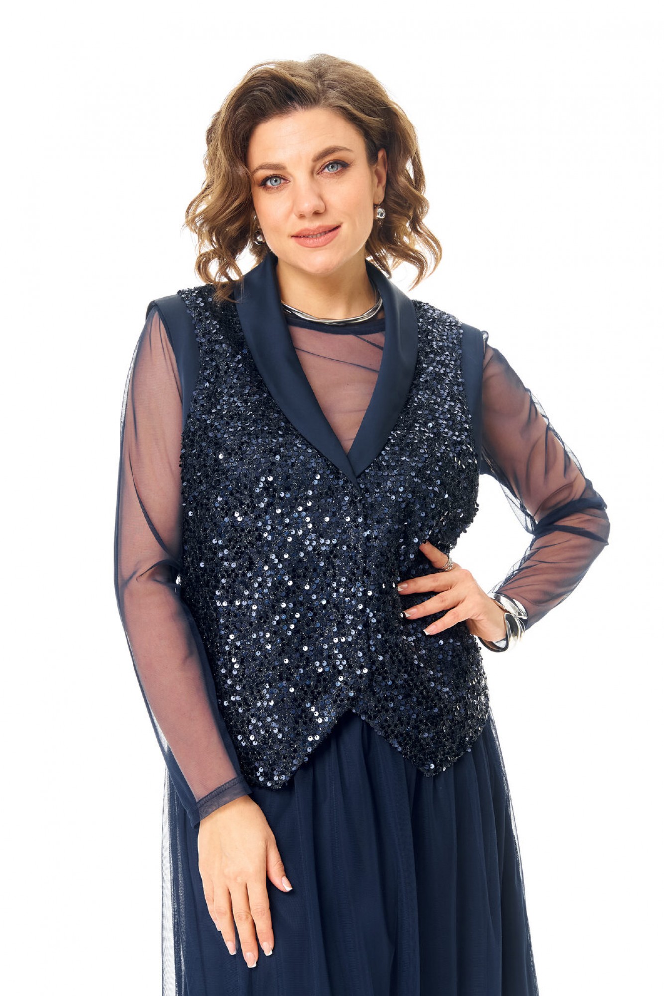 Комплект женский состоит из жилета, топа и юбки. Жилет полуприлегающего покроя на подкладке из шелковой атласной ткани. Перед и спинка выполнены из полотна с пайетками. По проймам выполнены бейки из атласной ткани. Низ жилета фигурной формы. Застёжка однобортная на потайные кнопки. Воротник отложной типа "шаль" из атласной ткани. Топ свободного покроя из полотна сетка. Горловина округлой формы, окантована. Рукав длинный. Юбка расширенная к низу длинной миди, двух слойная и двух уровневая. Нижний слой из шелковой атласной ткани, верхний из полотна сетка. Для удобства и свободы движения пояс на круговой резинке.