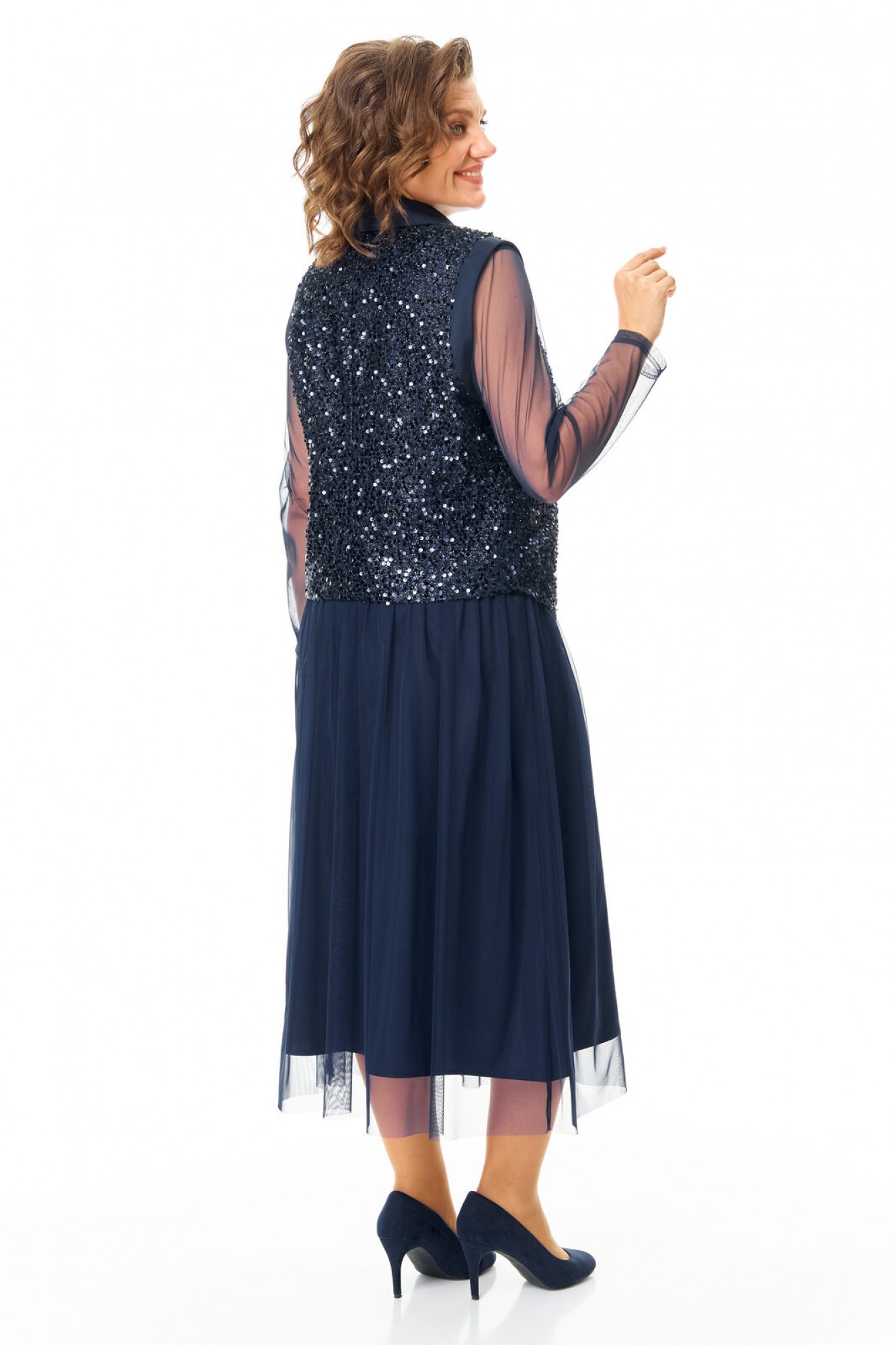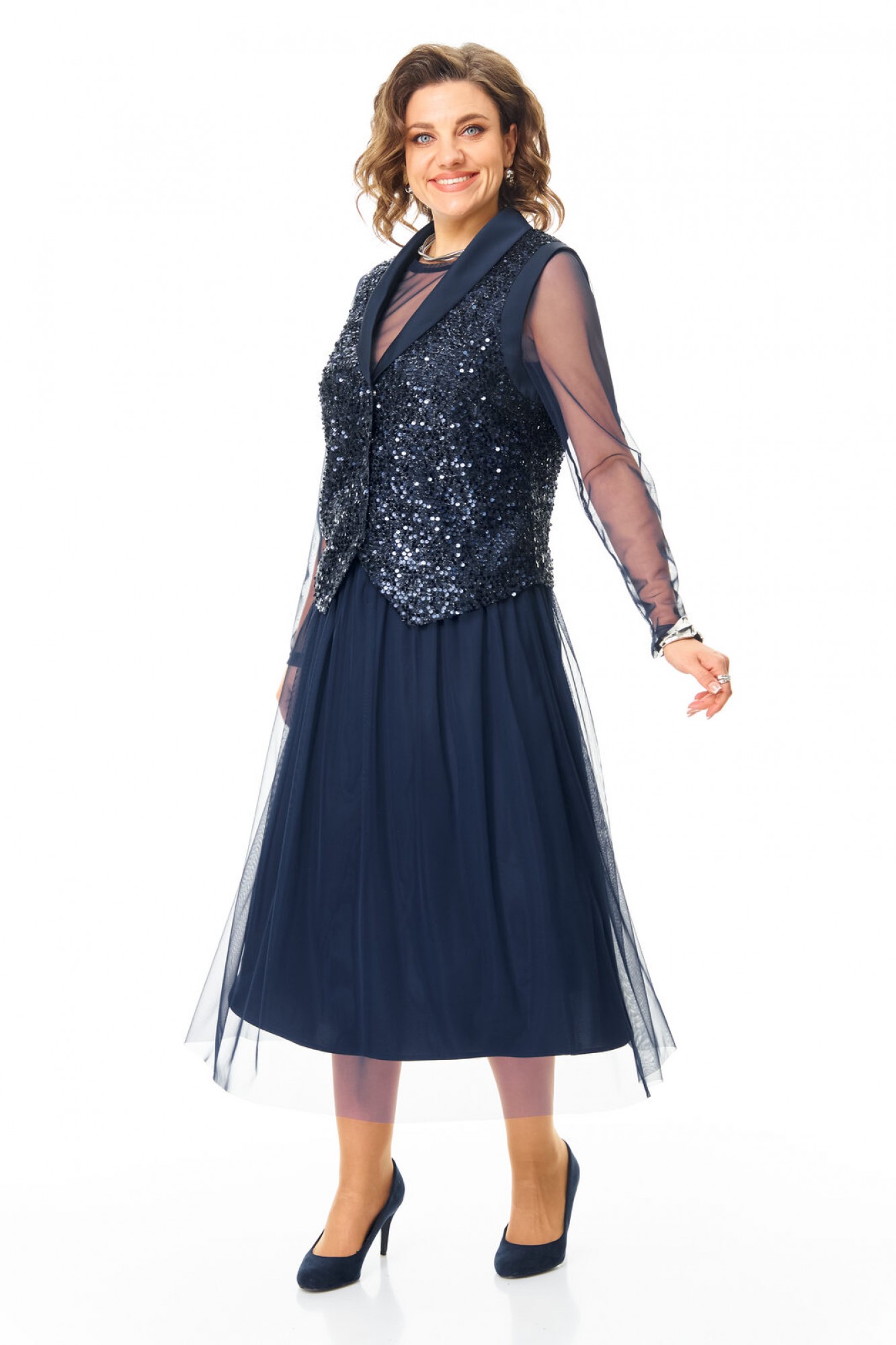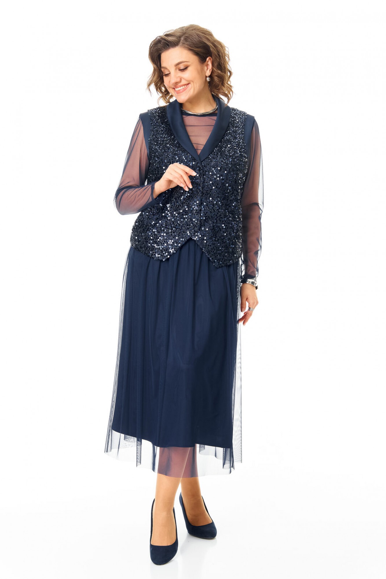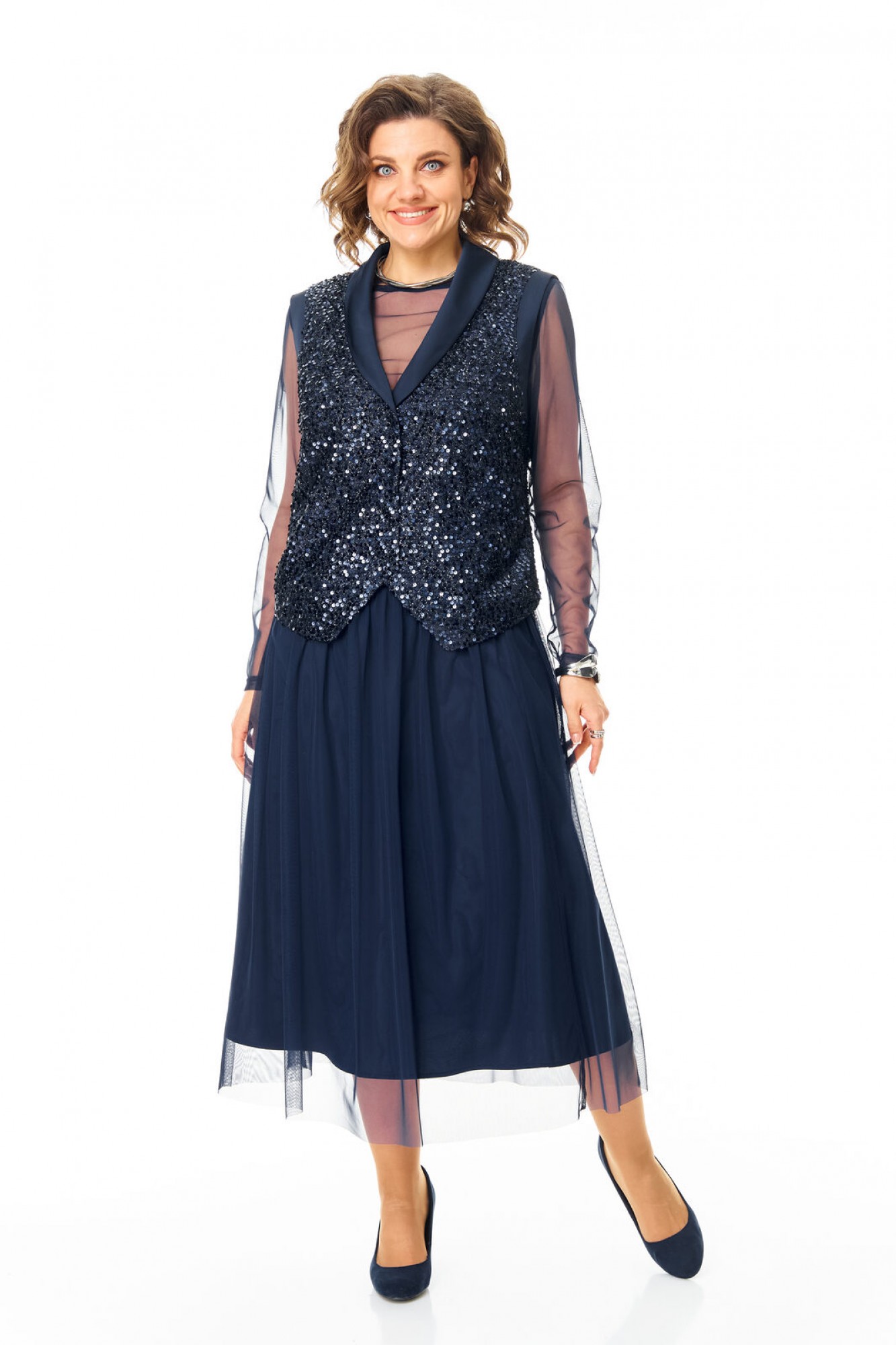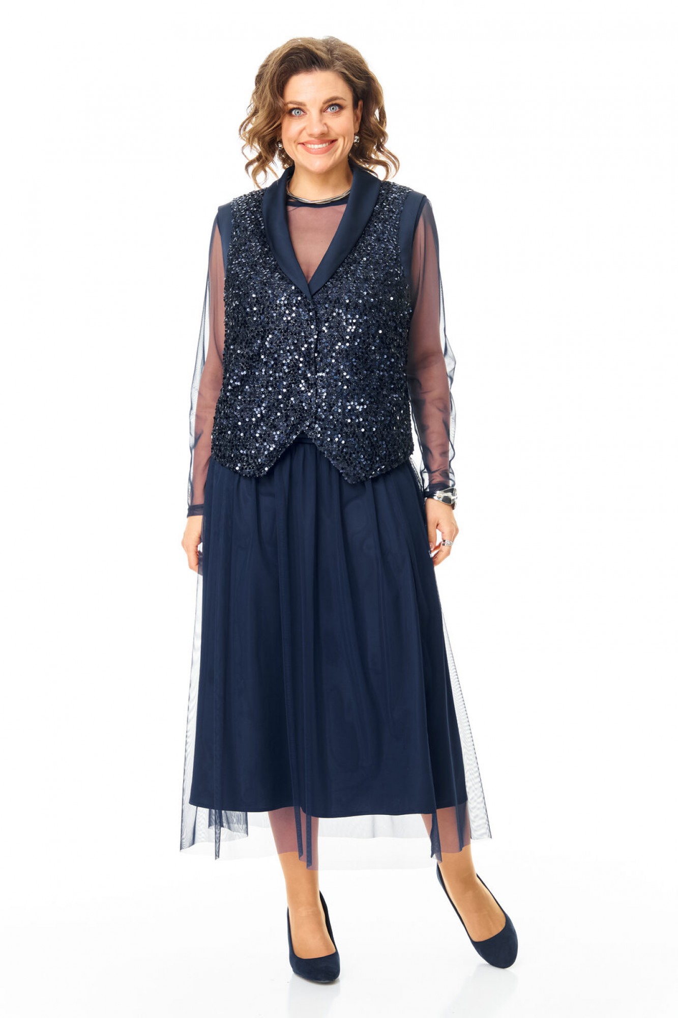 Комплект женский состоит из жилета, топа и юбки. Жилет полуприлегающего покроя на подкладке из шелковой атласной ткани. Перед и спинка выполнены из полотна с пайетками. По проймам выполнены бейки из атласной ткани. Низ жилета фигурной формы. Застёжка однобортная на потайные кнопки. Воротник отложной типа "шаль" из атласной ткани. Топ свободного покроя из полотна сетка. Горловина округлой формы, окантована. Рукав длинный. Юбка расширенная к низу длинной миди, двух слойная и двух уровневая. Нижний слой из шелковой атласной ткани, верхний из полотна сетка. Для удобства и свободы движения пояс на круговой резинке.