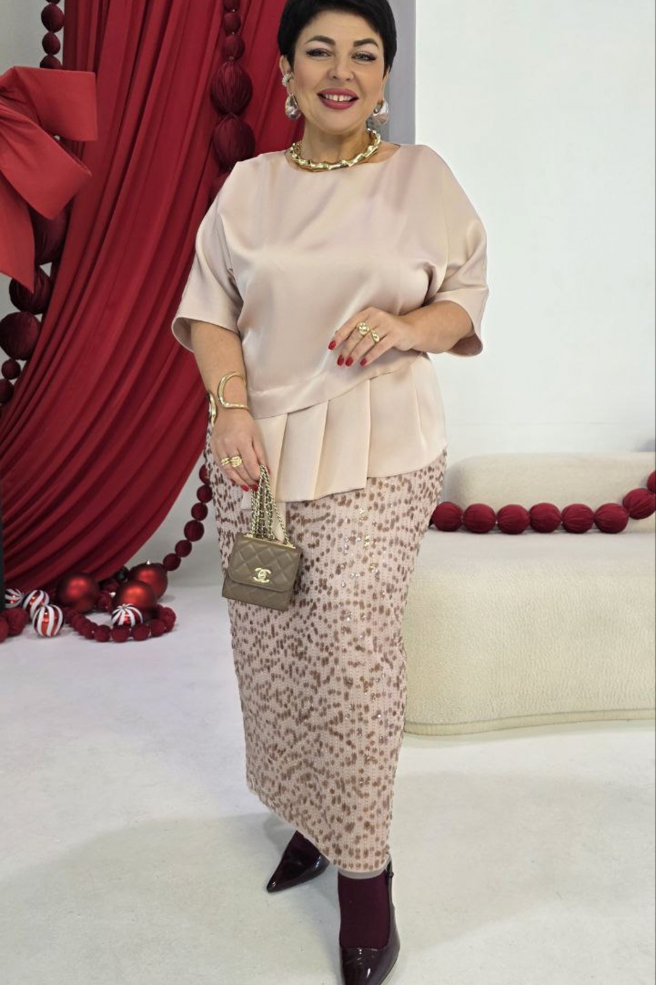 Комплект женский юбочный, состоящий из блузы и юбки. Комплект идеально подходит для вечерних торжеств, где важна каждая деталь, чтобы подчеркнуть изысканную женственность и уверенность в себе — светлый, элегантный и чуть волнующий наряд, который оставляет за собой шепот восхищения. Сочетание матового атласа и зеркального блеска пайеток создает идеальный дуэт. Блуза свободного силуэта, горловина округлой формы. По переду джемпера декоративная отлетная складка, с воланом с заложенными декоративными складками, он живет своей жизнью, колышется при каждом шаге, добавляя динамики и легкости верху. Он не пришит намертво, он «отлетает», создавая ощущение незавершенности и художественного хаоса. Рукав в блузе цельнокроеный, длиной ¾. Спинка в блузе со средним швом. Низ в блузе ассиметричный. Юбка прямого силуэта, длины миди с притачным поясом с эластичной тесьмой-резинкой в круговую, что обеспечивает максимально удобную посадку на любой тип фигуры. В среднем шве юбки разрез от низа.