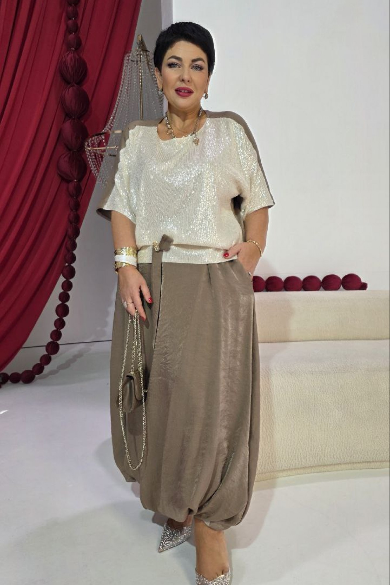 Комплект женский юбочный, двух-предметный, состоящий из блузы и юбки-балон. Комплект держится в гармонии за счёт контраста фактур: гладкая блуза с акцентной вставкой из отделочной ткани- светлой пайетки по переду и фактурным балоном юбки за счёт лёгкого перекрута по низу. Общий силуэт создаёт ощущение движения даже в статичном кадре. Этот наряд идеально подходит для торжественных мероприятий: он подчеркивает женственность, оставаясь при этом светлым и уверенным. Блуза свободного силуэта, с округлой формой горловины. Линия плеча в блузе переходит на перёд. По переду вставка из отделочной ткани- пайетки, от низа в качестве декоративного элемента заложена складка фиксирующаяся при помощи отделочной пуговицы и декоративной ленты из основной ткани. По спинки блузы отрезная кокетка. Рукав цельнокроеный, длиной ¾. В качестве дополнительного конструктивного элемента в блузе фигурные вставки « бочки». Юбка баллон, конической формы, расширяется к низу. По переднему и заднему полотнищу юбки фигурные подрезы переходящие в декоративные складки от низа, тем самым создавая необычный силуэт. Пояс в юбке притачной, со вставкой декоративной эластичной тесьмы-резинки в бочках. В среднем шве юбки застёжка на тесьму молнию и пуговицу по центру пояса. В боковых швах юбки карманы. Юбка на подкладке.