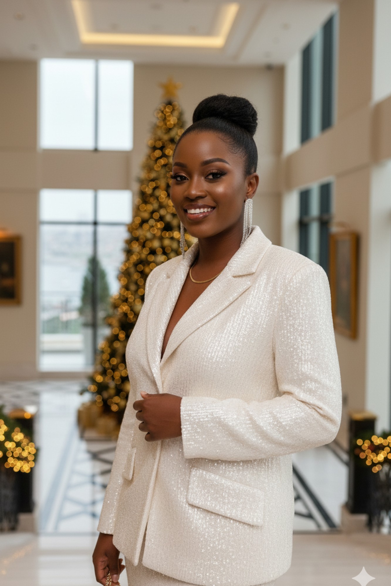 Это не просто женский юбочный костюм — это будто вторая кожа, сотканная из ночных огней и лунной пыли. Пайетки, бесчисленные и плотно прилегающие друг к другу, словно чешуя диковинной рыбы, не просто сверкали. Они жили своей собственной, мерцающей жизнью, рождая на своей поверхности целую вселенную из бликов. Костюм женский, двухпредметный, состоящий из жакета и юбки. Жакет однобортный, «оверсайз» силуэта, с акцентом на ровную линию плеч, с цельнокроеными отложными лацканами и потайной застёжкой на пришивные кнопки по краю борта. По переду жакета нагрудные вытачки и декоративные клапана карманов. Спинка в жакете со средним швом. Рукав в жакете втачной, одношовный, длинный. Жакет на подкладке. Юбка длины «миди», обтачная по верхнему срезу подкладкой. В среднем шве заднего полотнища юбки застёжка на декоративную тесьму-молнию в среднем шве. От низа юбки в среднем шве разрез. Юбка на подкладке.