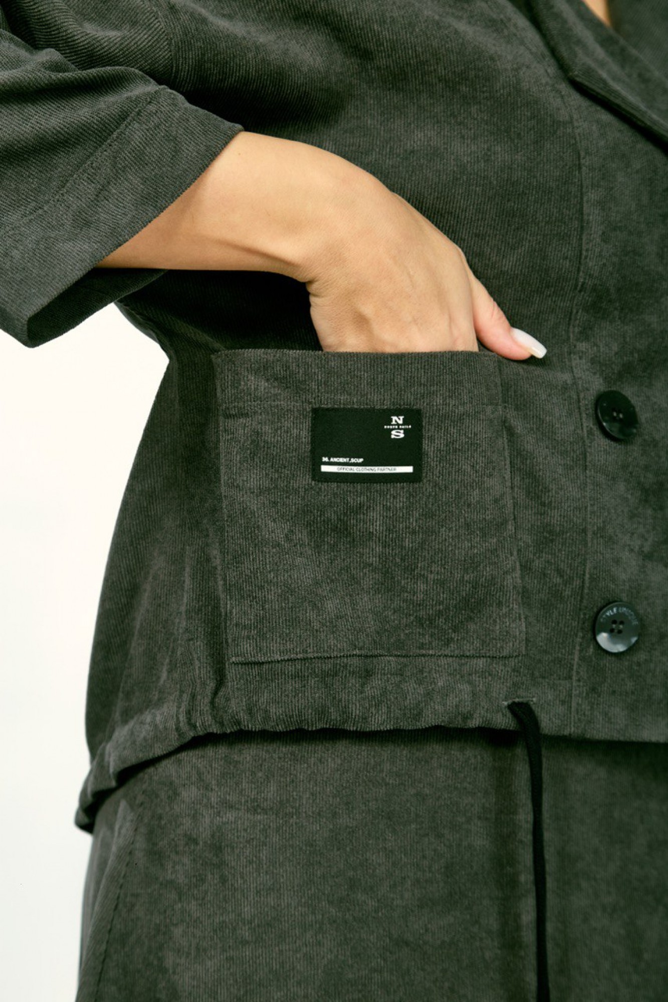 Жакет прямого силуэта со спущенной линией плеча и рубашечным рукавом добавляет характер. На полочке расположен вертикальный рельеф от линии плеча и настрочен накладной карман. Низ жакета обработан тройной обтачкой на которой расположена петля и протянут шнур. Низ рукава с притачной манжетой. Воротник пиджачного типа. Застежка двухбортная на петли и пуговицы.