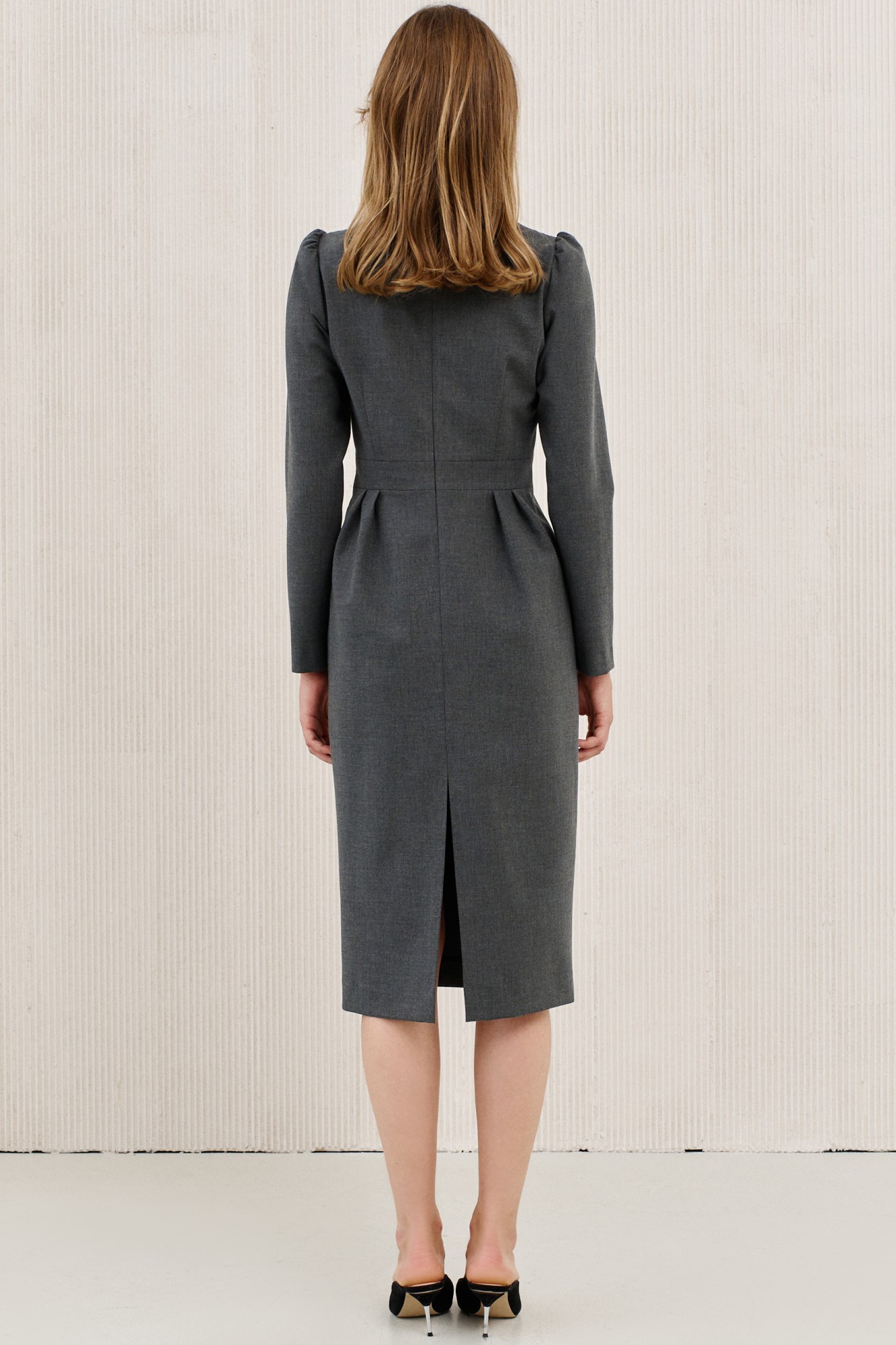 Платье женское приталенное длиной ниже линии колена на нежной эластичной подкладке. Вырез V-образный. Отрезное по линии талии. По переду ниже линии груди подрез с возвышение по центру, от горловины до подреза средний шов, на уровне вытачек от подреза вверх и вниз заложены по две односторонние складки. По плечевому срезу переда -сборка. Спинка со средним швом, с талиевыми вытачками выше линии подреза и двумя складками ниже линии подреза. В среднем шве спинки застежка на потайную тесьму-молнию и разрез. Рукав одношевный, втачной со сборкой по окату. Это платье будем чудесным решением для торжественного мероприятия или будет радовать Вас своим удобством в повседневной носке.
