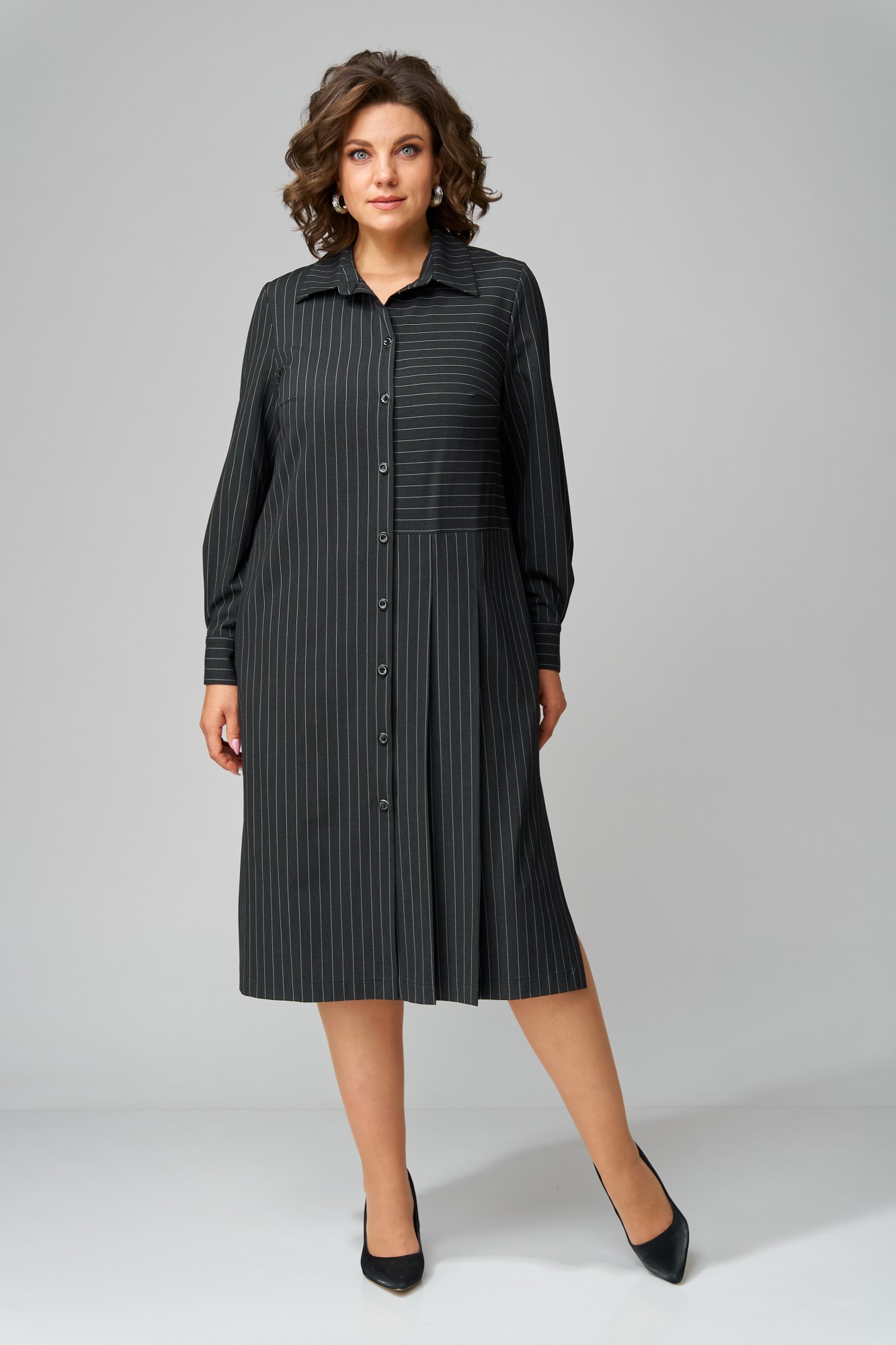 Платье женское, прямой силуэтной формы, к низу расширяется за счет складок. С центрально-бортовой застежкой, цельнокроеной планкой (на петли пуговицы). Горловина оформлена воротником стояче-отложным с отрезной стойкой. На переде расположены нагрудные вытачки, идущие от бокового шва. Перед ассиметричный, на правой части подрез, в котором расположены две складки, направленные к боковому шву и отстрочены отделочной строчной. В боковых швах обработаны карманы и разрезы. На спинке расположена встречная складка, отстроченная отделочной строчкой. К платью ремень не прилагается. Платье выполнено из ткани костюмно-плательной группы, по дизайну полоска.