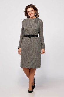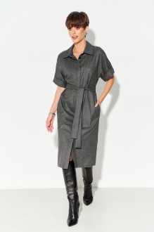 Платье женское, полуприлегающего силуэта. Горловина округлой формы, отрезная кокетка над линией груди. От линии груди до линии талии по центру изделия застрочены защипы. Под рельефами настрочены навесные карманы переходящий в шлевку для пояса. Низ платья прямого кроя. Спинка одношовная со шлицей, выточками по рельефами спинки. Рукав одношовный с защипами, втачной. Пояс из основной ткани, длинный.