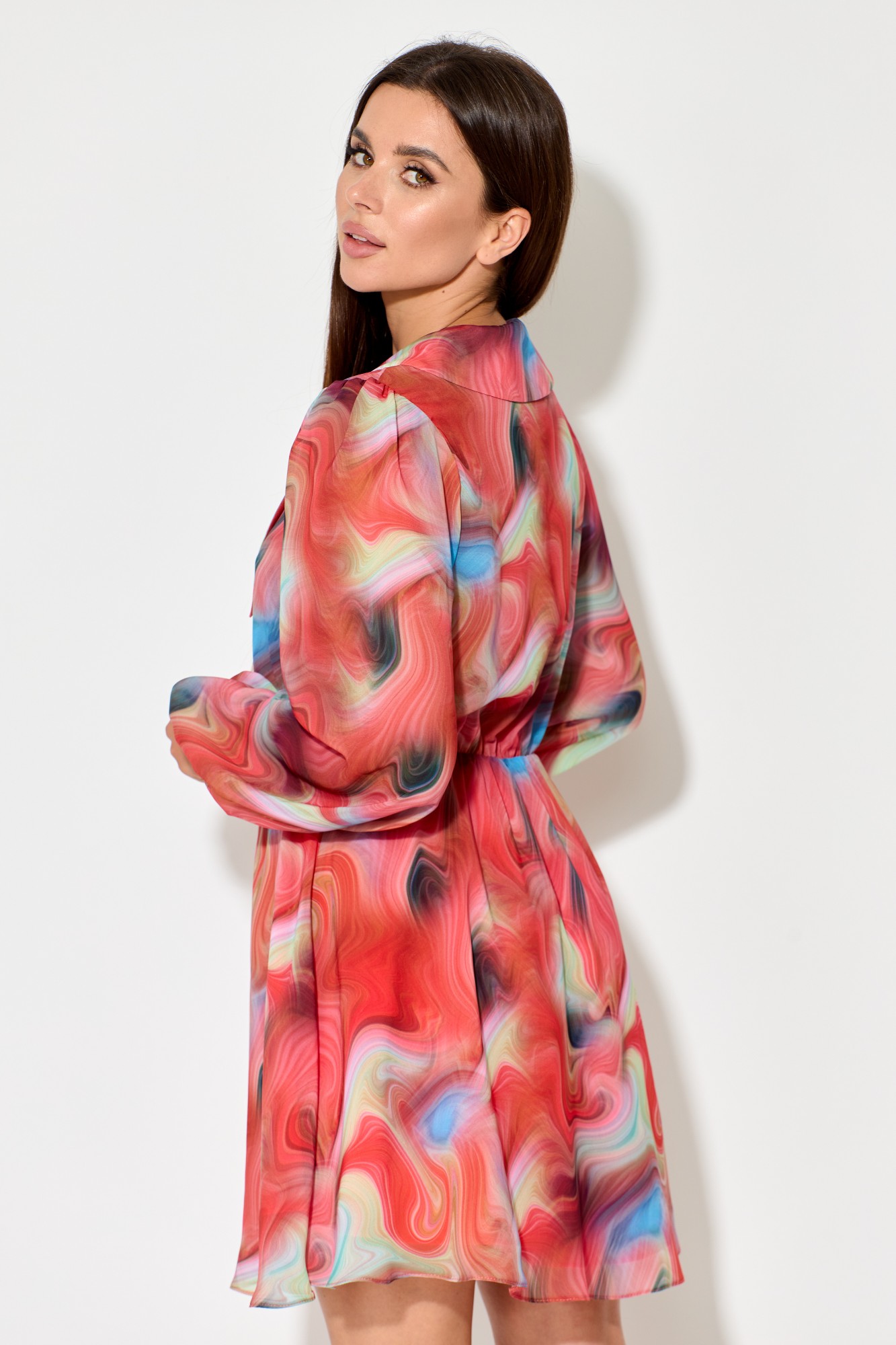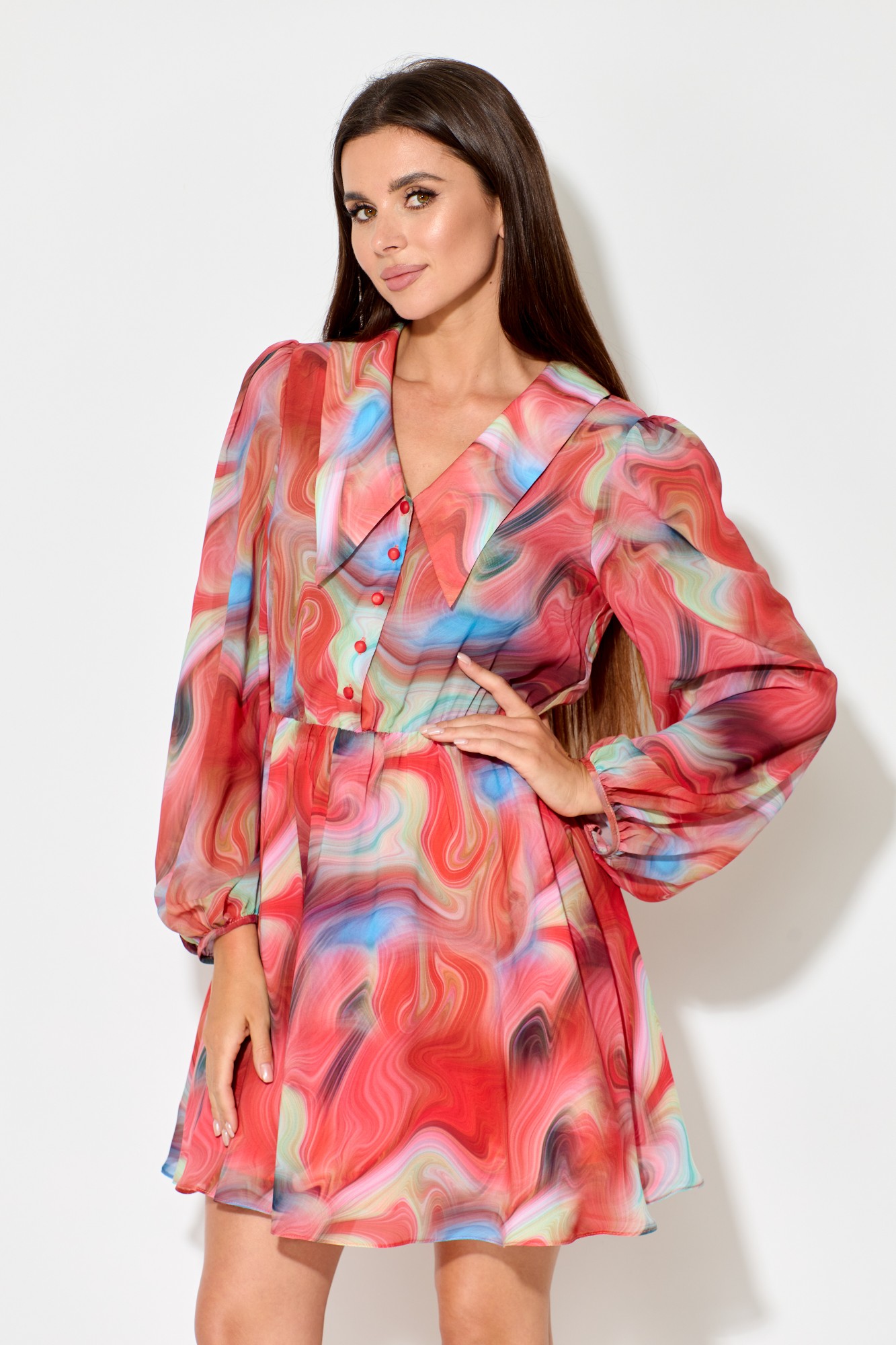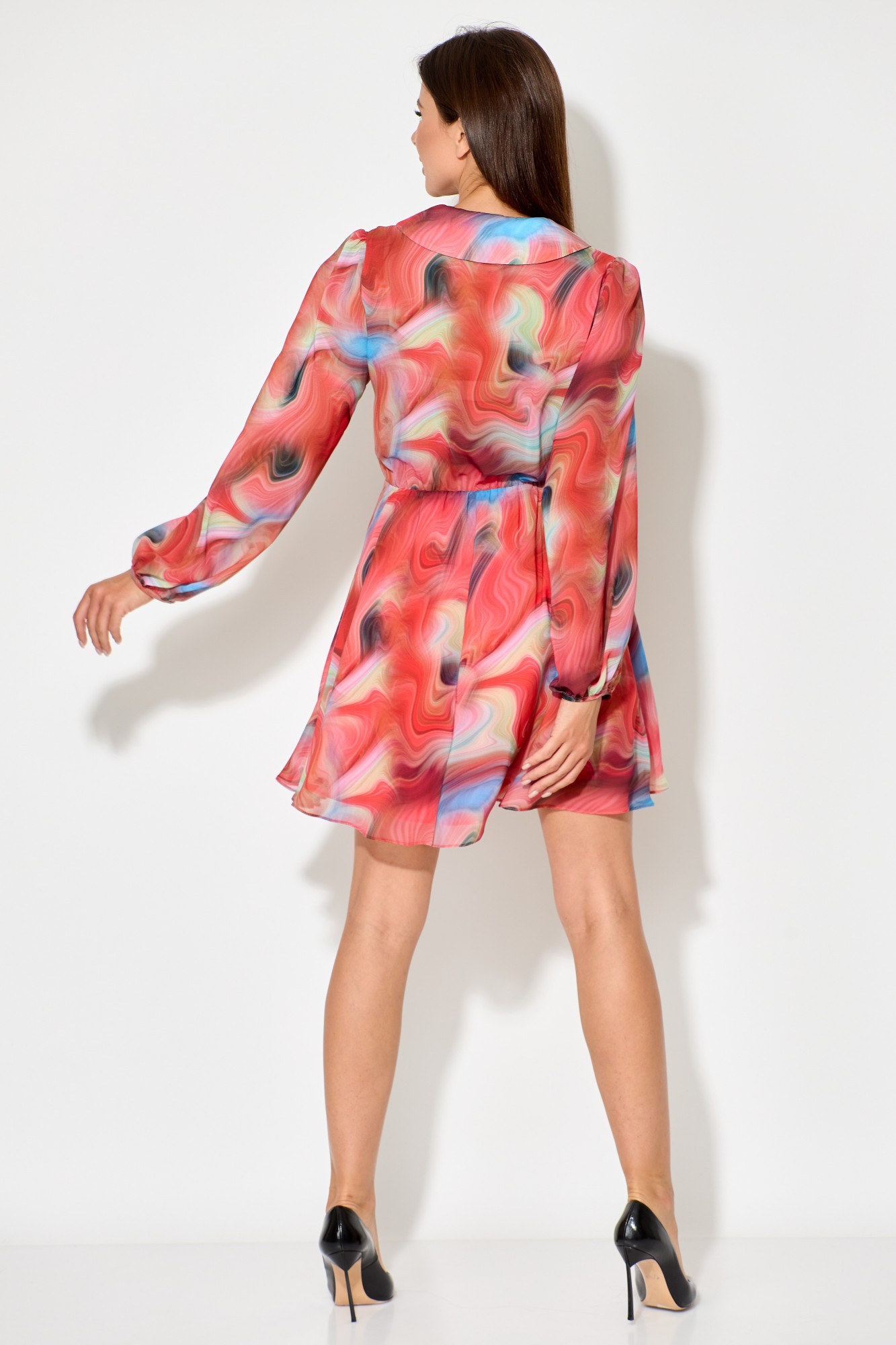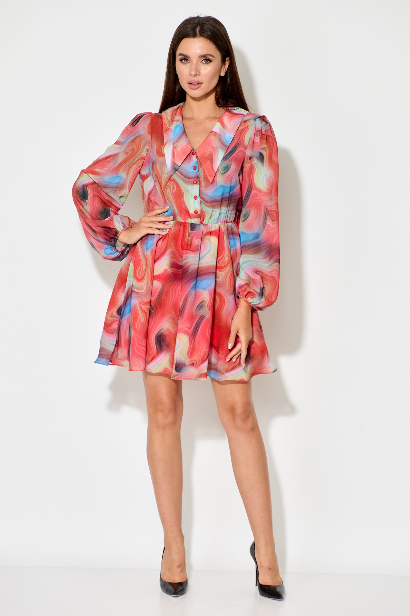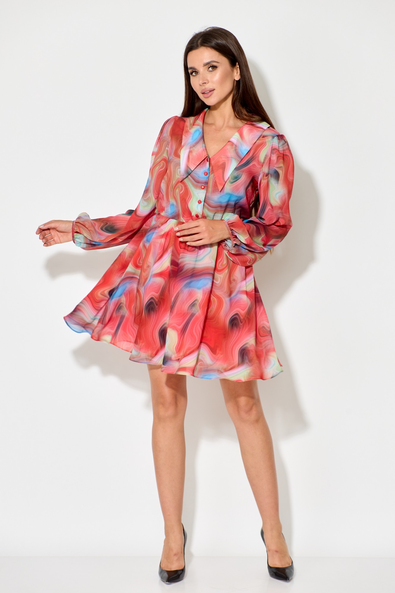 Платье женское, выполненное из легкого шифона в Х образном силуэте, с легкой хлопковой подкладкой. Оно отрезное по линии талии и имеет длину выше колена. Воротник втачной, плосколежащий с удлиненными концами, а рукав втачной, одношевный и расширенный с присобранным и окантованным низом.