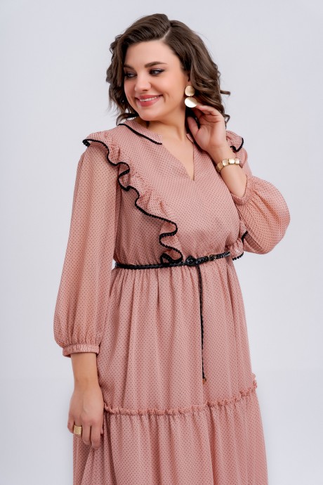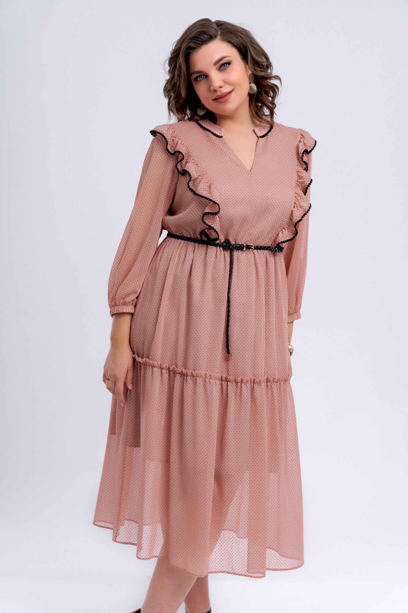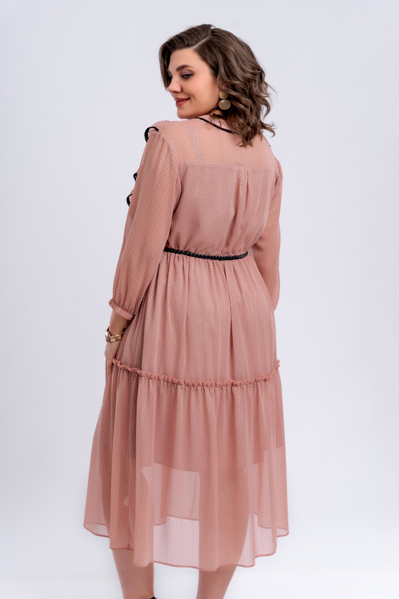 Платье женское полуприлегающего силуэта, расклешенного к низу от талии, на подкладке. Платье отрезное по линии талии, собранное на резинку. Верхняя часть переда со средним швом и с рельефами, выходящими из плечевого шва и до талии. В швах рельефов расположены рюши, собранные на сборку и задекорированы черной, отделочной тесьмой. Спинка с притачной кокеткой, в шве которой расположена встречная складка в нижней части. Вырез горловины V-образный. Нижняя часть платья состоит из двух частей, нижняя часть которой собрана на сборку. Воротник – плосколежащая стойка, шов притачивания которой, задекорирован отделочной, черной тесьмой. Рукав втачной, внизу на резинке. В качестве декора используется съемный, тонкий, черный ремень. Платье очень женственное, удобное, не сковывает движения, может подойти на все случаи в жизни, как для вечерних прогулок по городу, так и для торжеств.