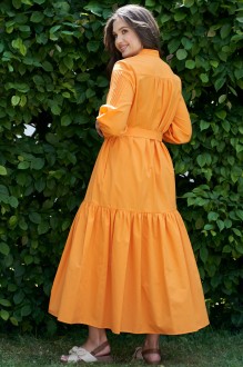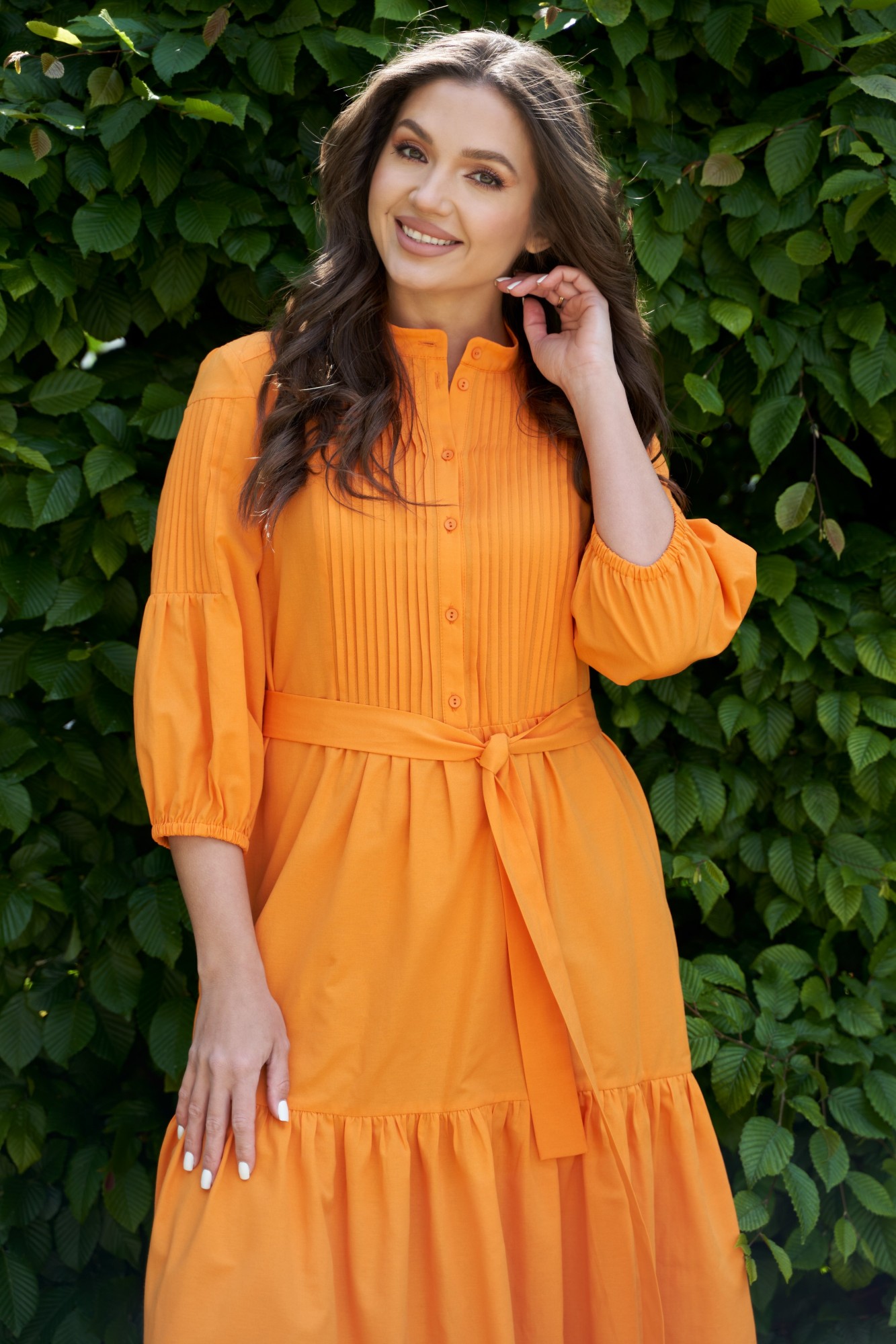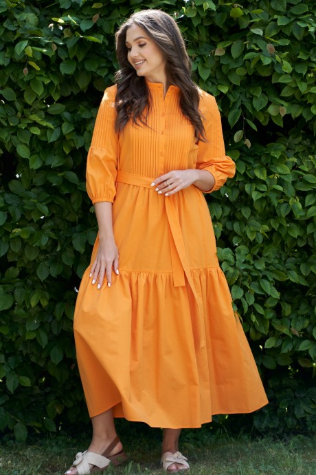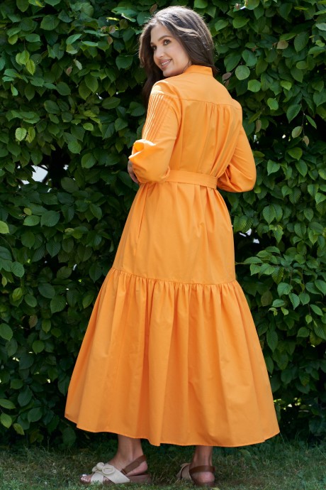 Платье женское прямого силуэта, длины макси, с воланом, со съемным поясом. Лиф переда с вертикальными защипами до линии талии, с планками и застежкой на петли и пуговицы, со сборкой. В боковых швах обработаны карманы. Спинка с кокеткой. Рукав со вставкой с вертикальными защипами, со сборкой, с эластичной тесьмой по низу.