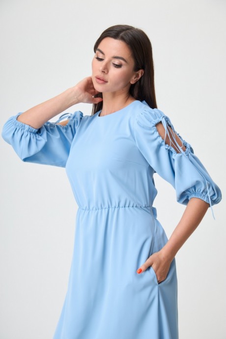 Спину украшает изысканный вырез с двумя воздушными бантами, которые словно бабочки готовы вспорхнуть при каждом вашем движении. Рукава-три четверти с нежными сборами и ажурными разрезами, подчеркнутыми тончайшими шнуровками, добавляют образу романтичную таинственность.
