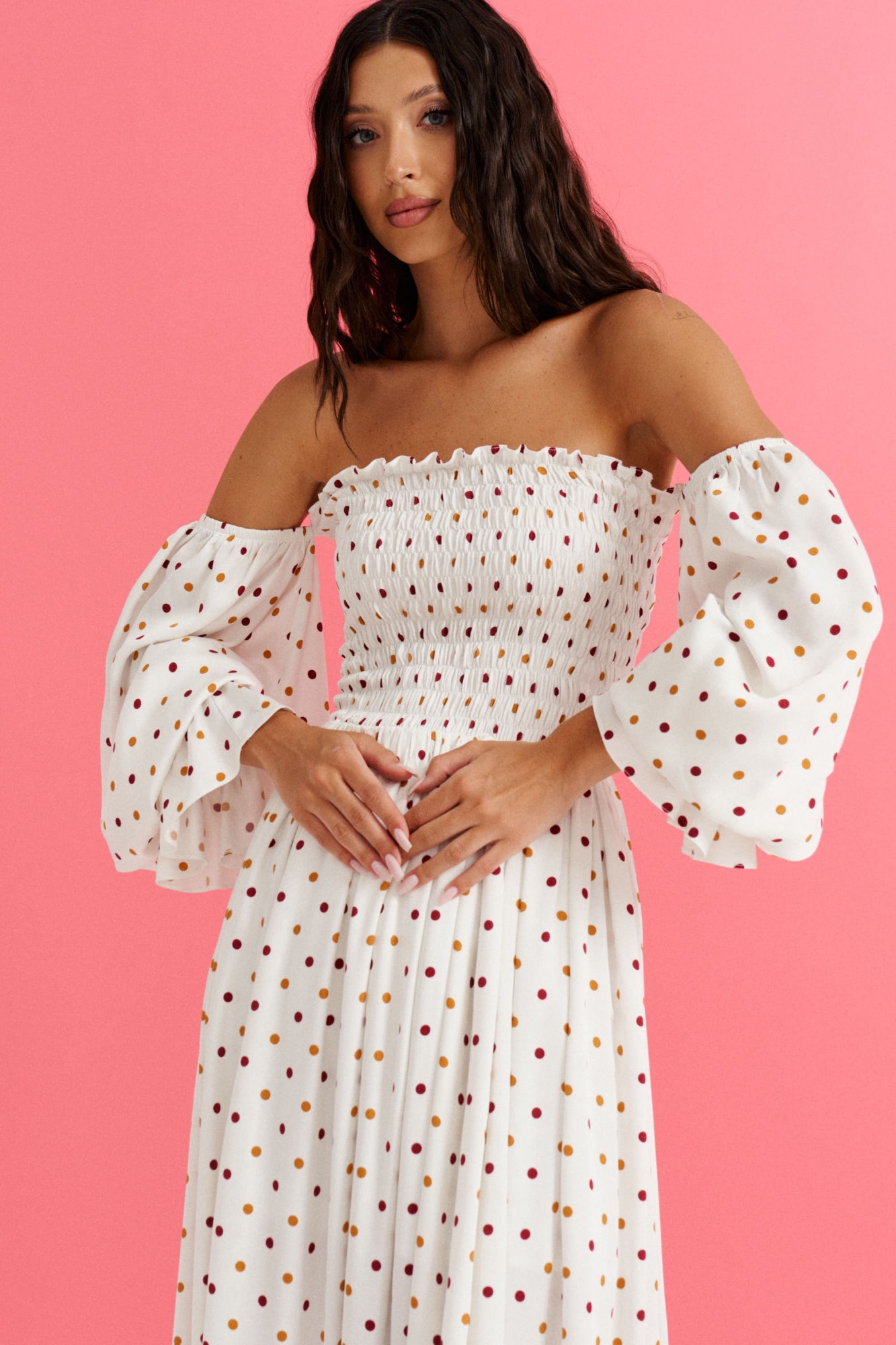 Платье с открытыми плечами выполнено из белого полотна с принтом горох. Характеристики: полуприлегающий силуэт, открытые плечи, отрезное, верх изделия выполнен венгеркой, во верхней части рукава резинка, низ в изделии на подкладке свободного кроя.