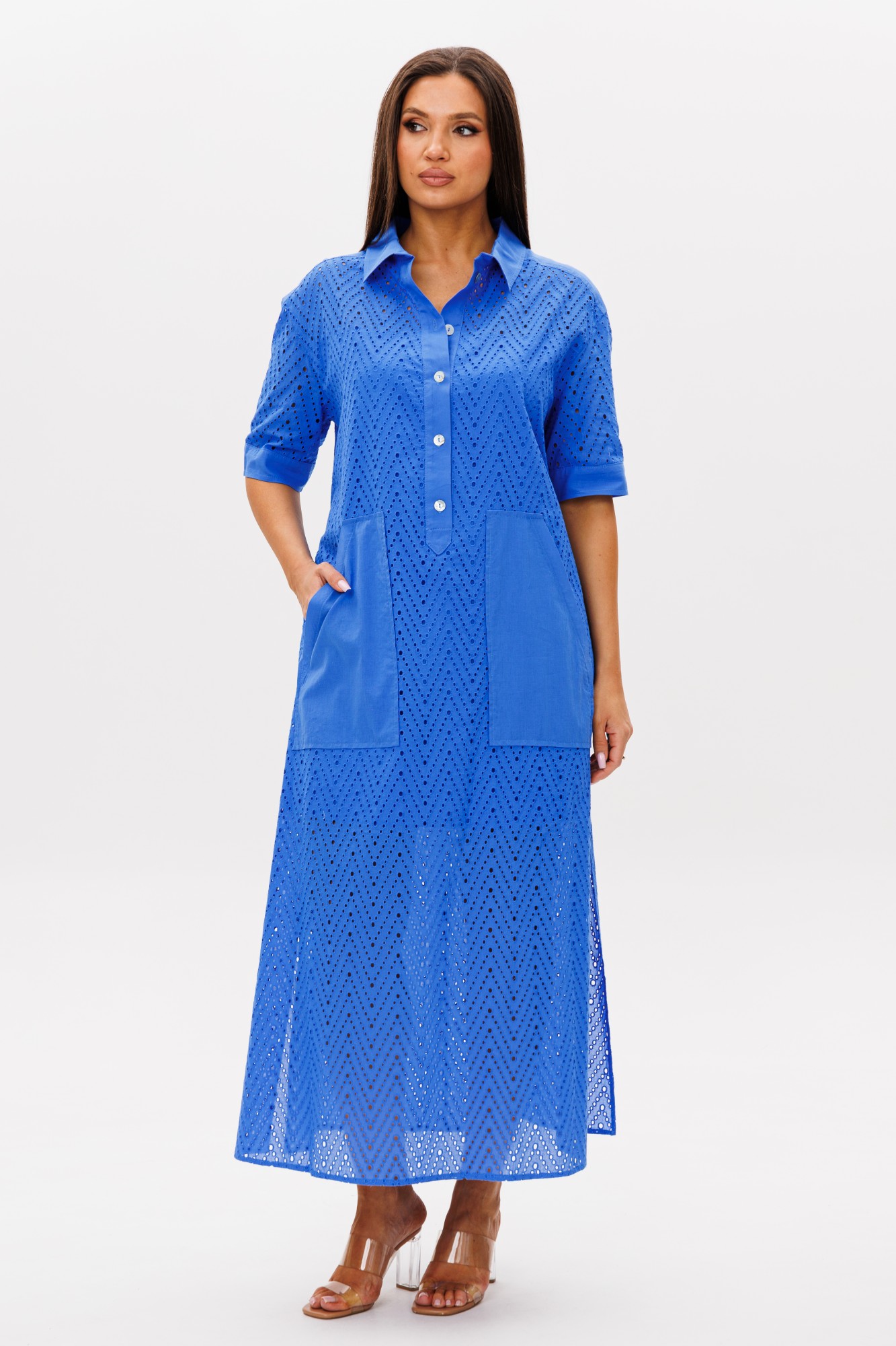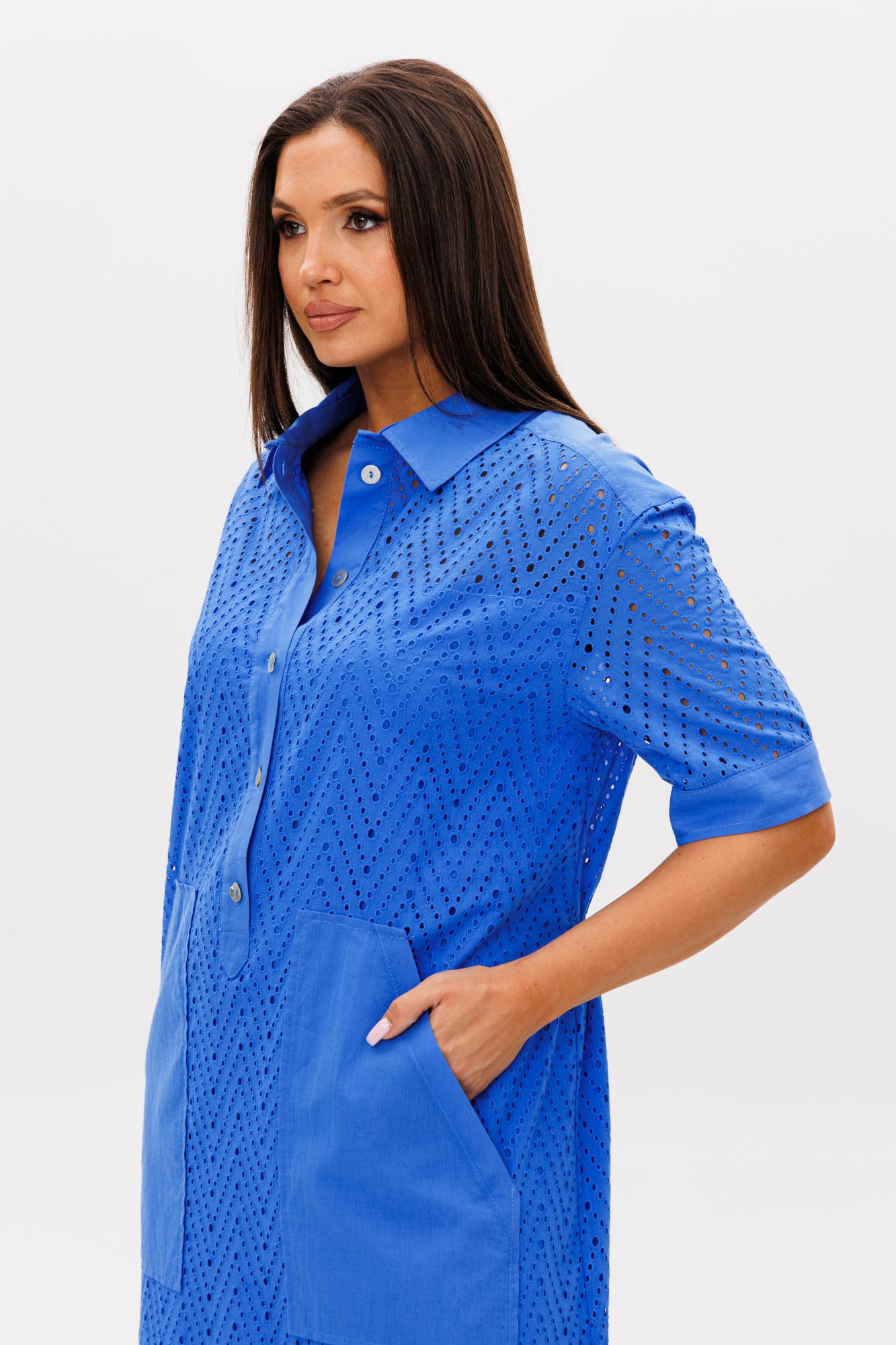 Платье свободного А-силуэта, рубашечного покроя с заниженной линией плеча, рубашечным воротником и рукавом. Полочка с частичной застежкой и накладными фигурными карманами. Спинка с отрезной кокеткой, средним швом и кулиса с регулирующейся тесьмой и фиксаторами по талии. Рукав с локтевой планкой и притачной манжетой с петлей и пуговицей. По боковым швам - разрезы. Все конструктивные элементы платья подчёркнуты контрастными отделочными строчками.