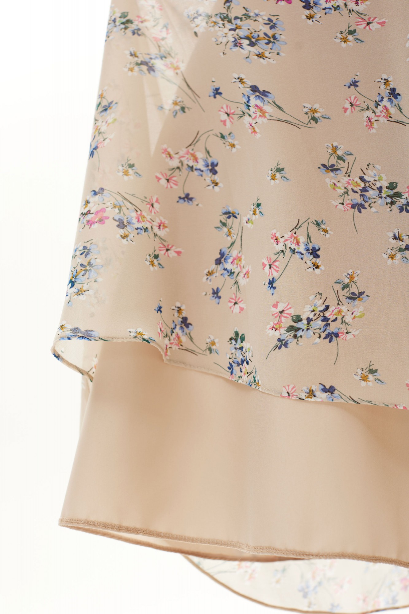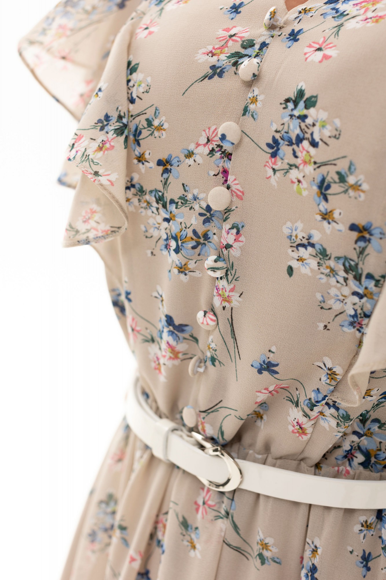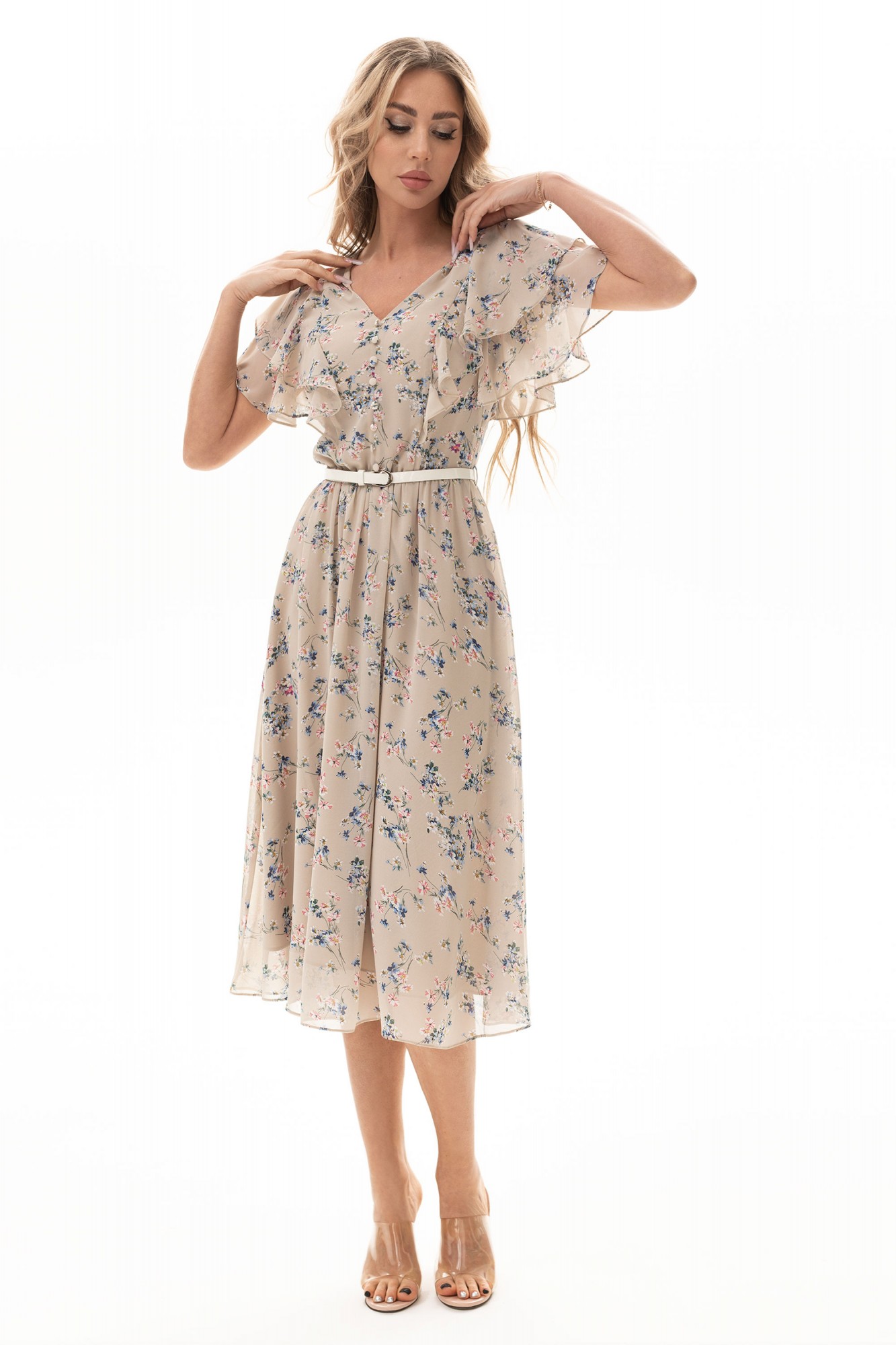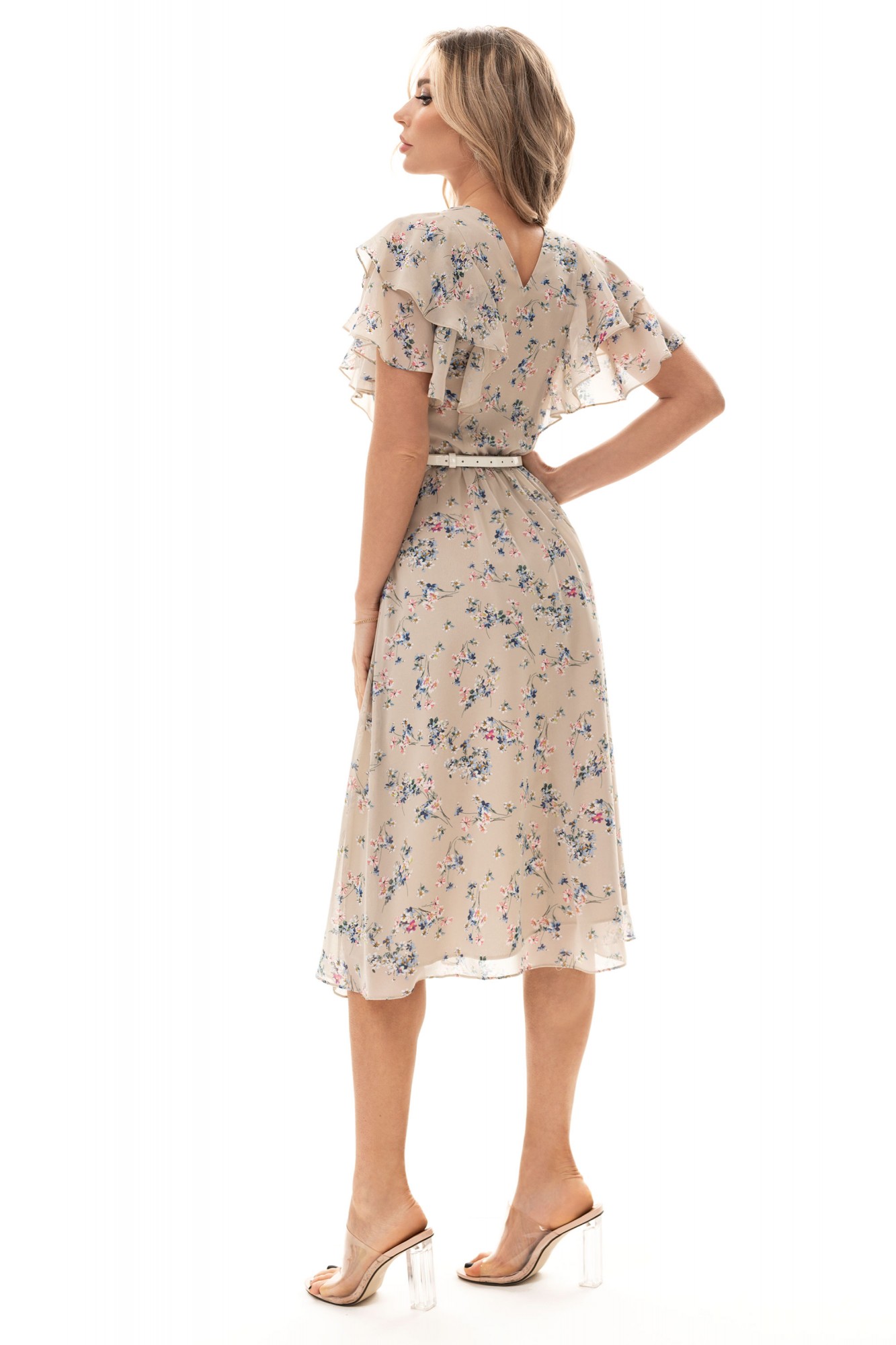 Платье без воротника, без рукавов, с V-образным вырезом горловины, с застежкой на потайную молнию в левом боковом шве. Платье отрезное по линии талии. Шов по талии присборен резинкой. Лиф переда с двумя рельефами, выходящими из плеча. Лиф спинки с двумя рельефами, выходящими из плеча. Из рельефов переда и спинки выходят воланы. Нижняя часть платья расклешенная. Спинка со средним швом.