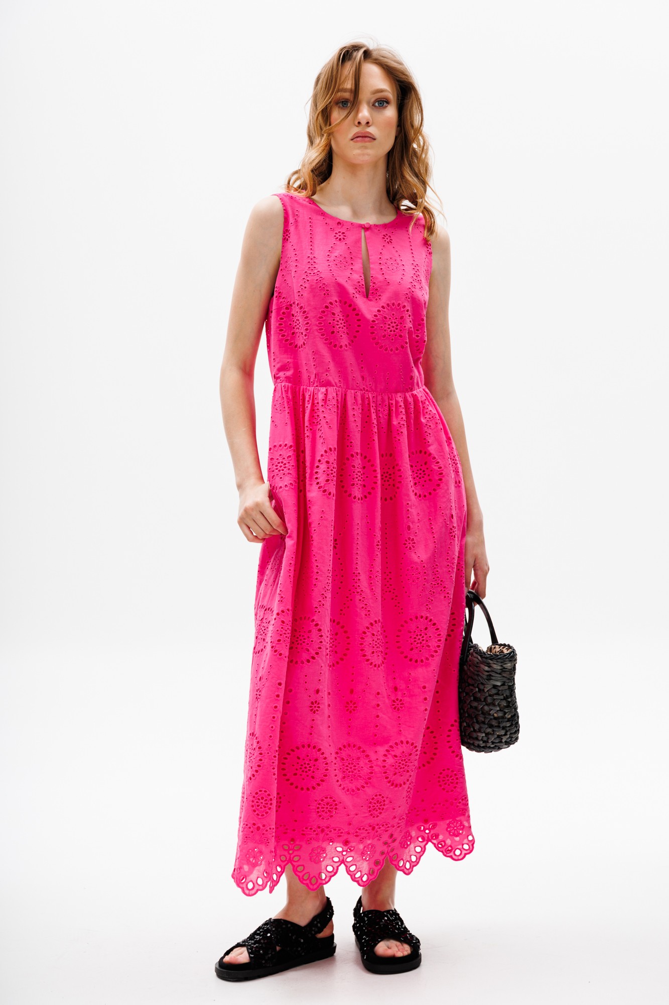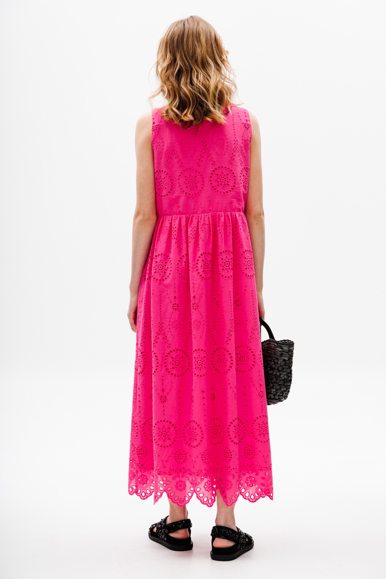 Платье выполнено из хлопка с вышивкой. Платье Х-образного силуэта, длиной миди, отрезное по линии талии. Горловина округлой формы с застежкой на пуговицу. Плечевой шов заужен. Юбка расширена к низу. В боковых швах карманы. По низу юбки фестоны. Платье на отлетной по низу подкладке.