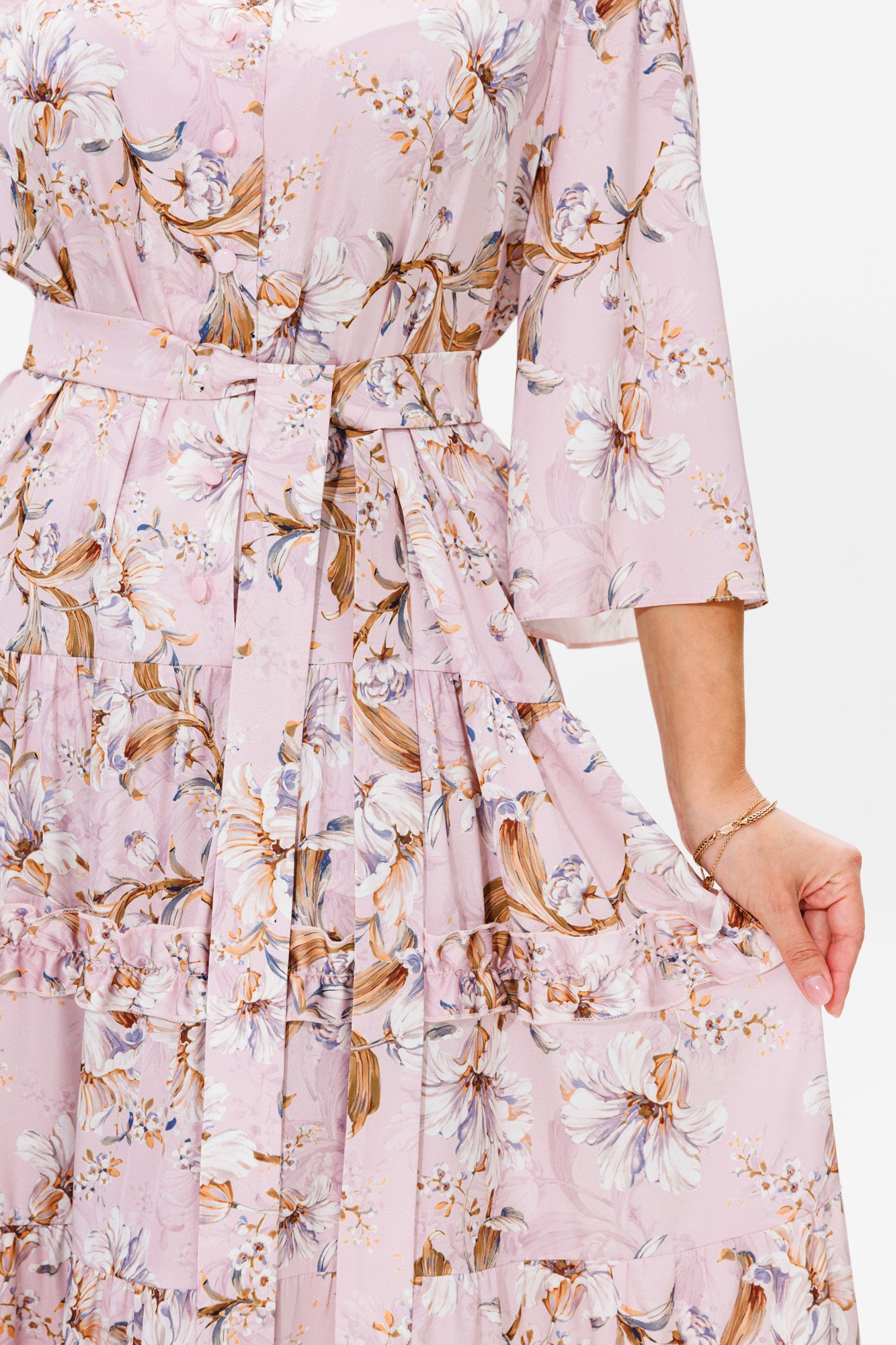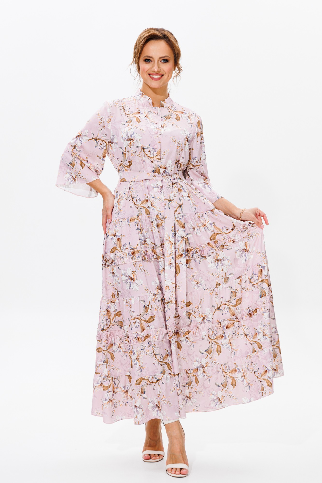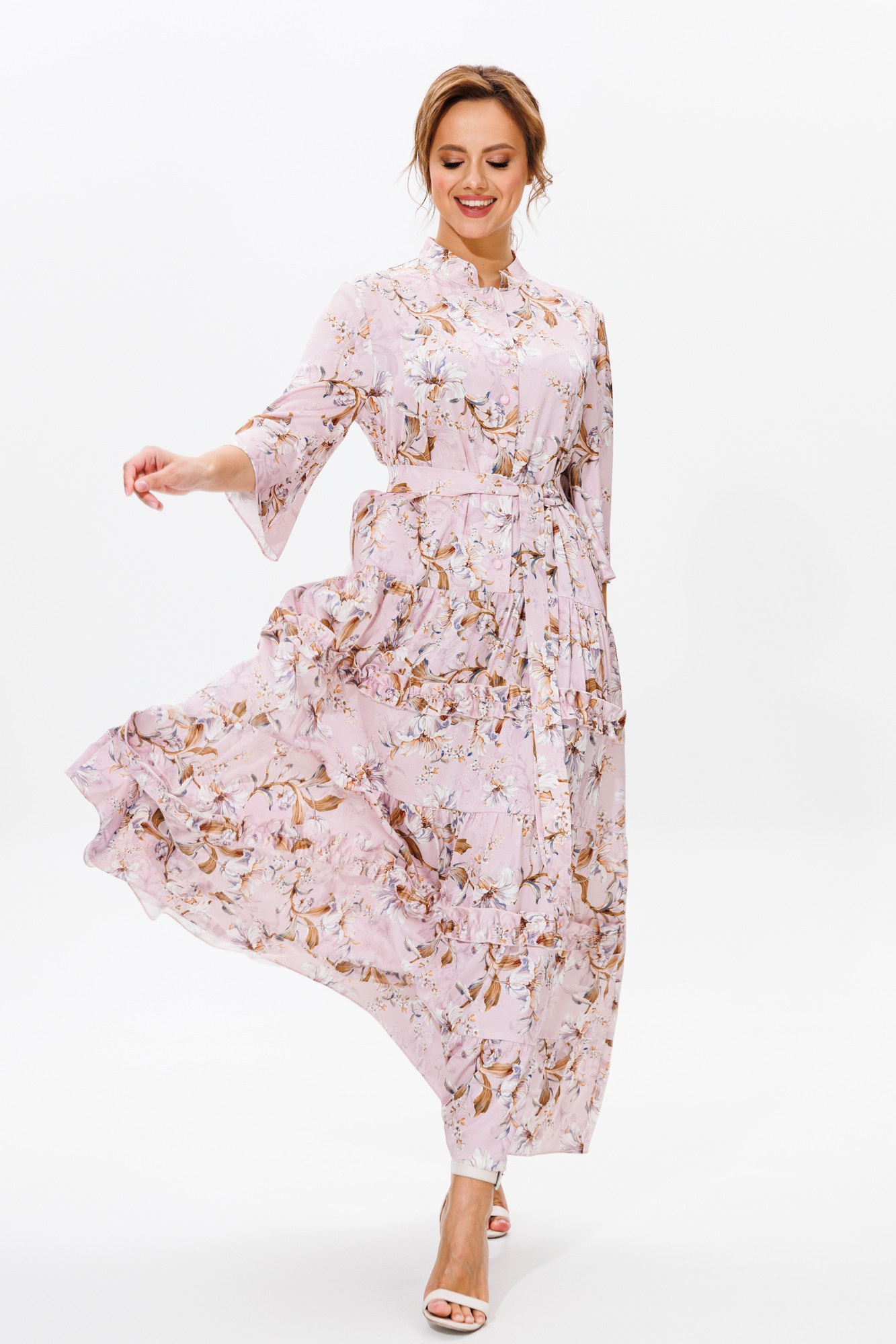 Нарядное женское платье, выполнено из лёгкого струящегося атласа (тянется). Платье отрезное ниже линии талии. Верхняя часть переда с центральной застежкой на петли и пуговицы. Горловина оформлена стойкой. Нижняя часть платья А-образного силуэта, состоящая из трех воланов, декорированных рюшами из основной ткани. Рукава втачные одношовные, расширенные к низу.