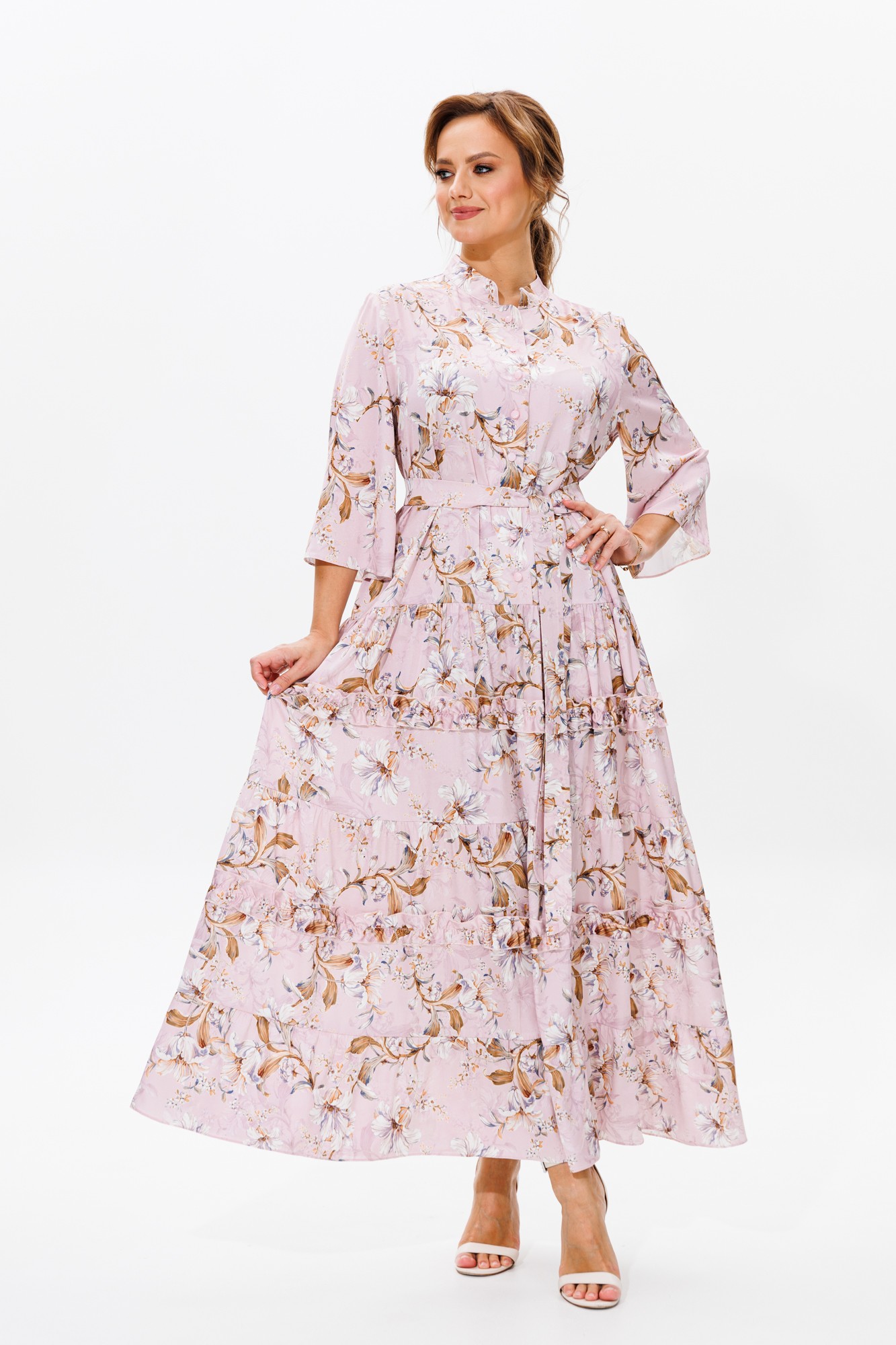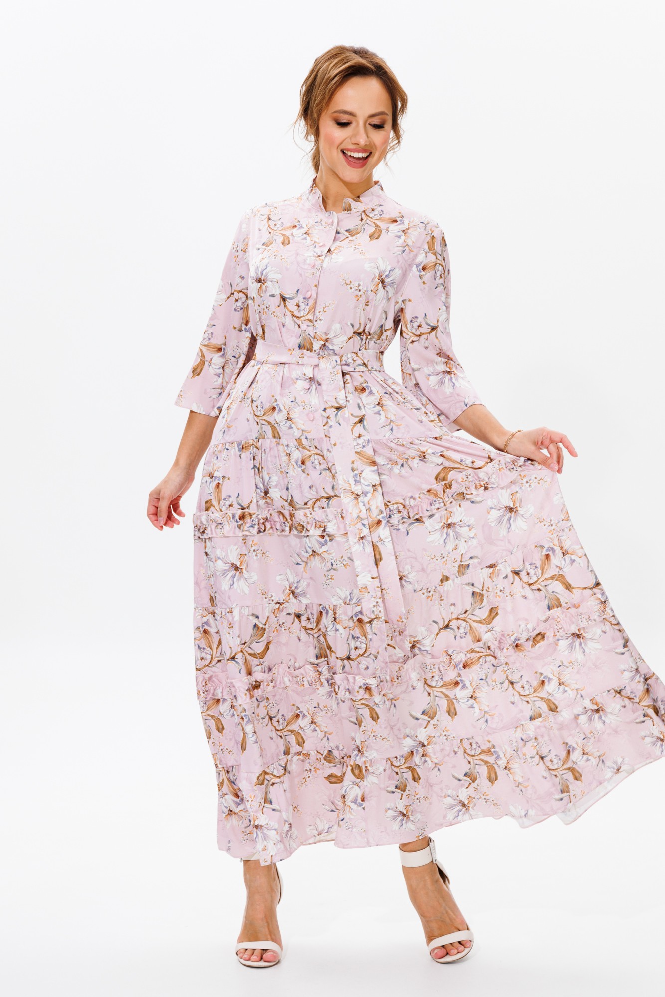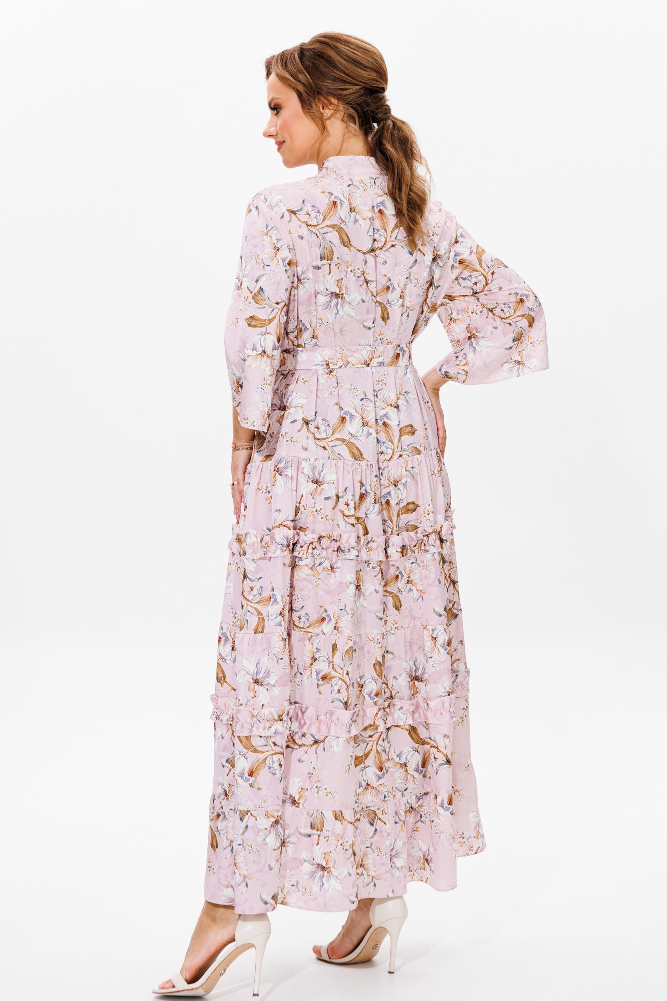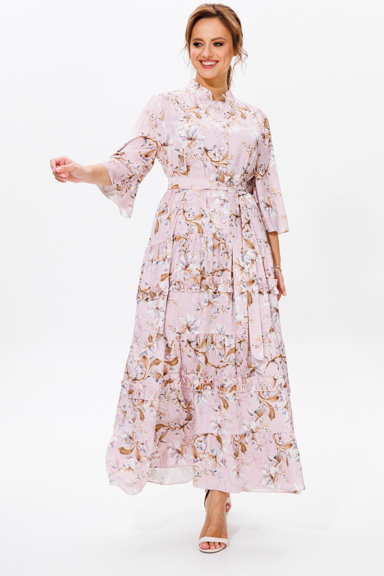 Нарядное женское платье, выполнено из лёгкого струящегося атласа (тянется). Платье отрезное ниже линии талии. Верхняя часть переда с центральной застежкой на петли и пуговицы. Горловина оформлена стойкой. Нижняя часть платья А-образного силуэта, состоящая из трех воланов, декорированных рюшами из основной ткани. Рукава втачные одношовные, расширенные к низу.