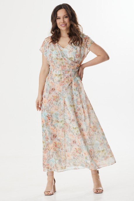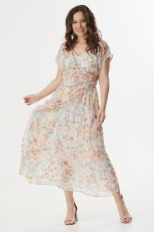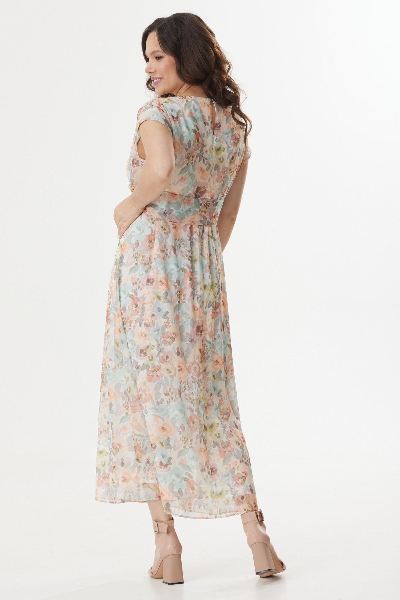 Легкое платье полуприлегающего силуэта на трикотажной подкладке, с расширенной книзу юбкой. Выполнено из нежного струящегося шифона с цветочным принтом. Рукав цельнокроеный, короткий. Застежка по спинке на пришивную пуговицу. Спереди платье дополнено декоративным запахом с застежкой сбоку на пришивные пуговицы.