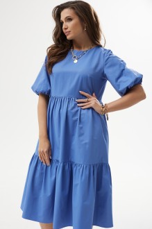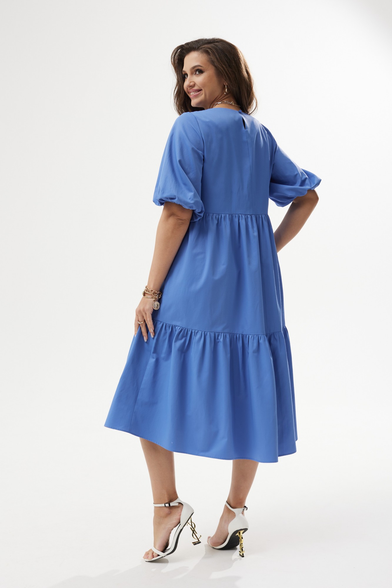 Платье А-силуэта с завышенной талией. Горловина округлой формы. Рукав расширенный к низу, на резинке. Спинка со средним швом с застежкой на воздушную петлю и пуговицу. Юбка состоит из двух объемных присборенных