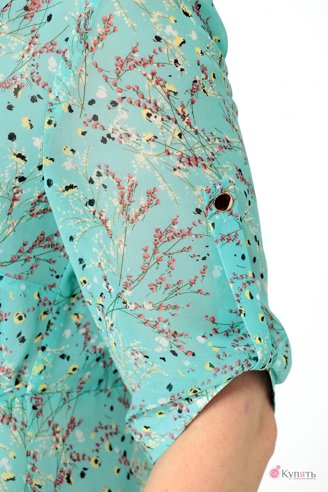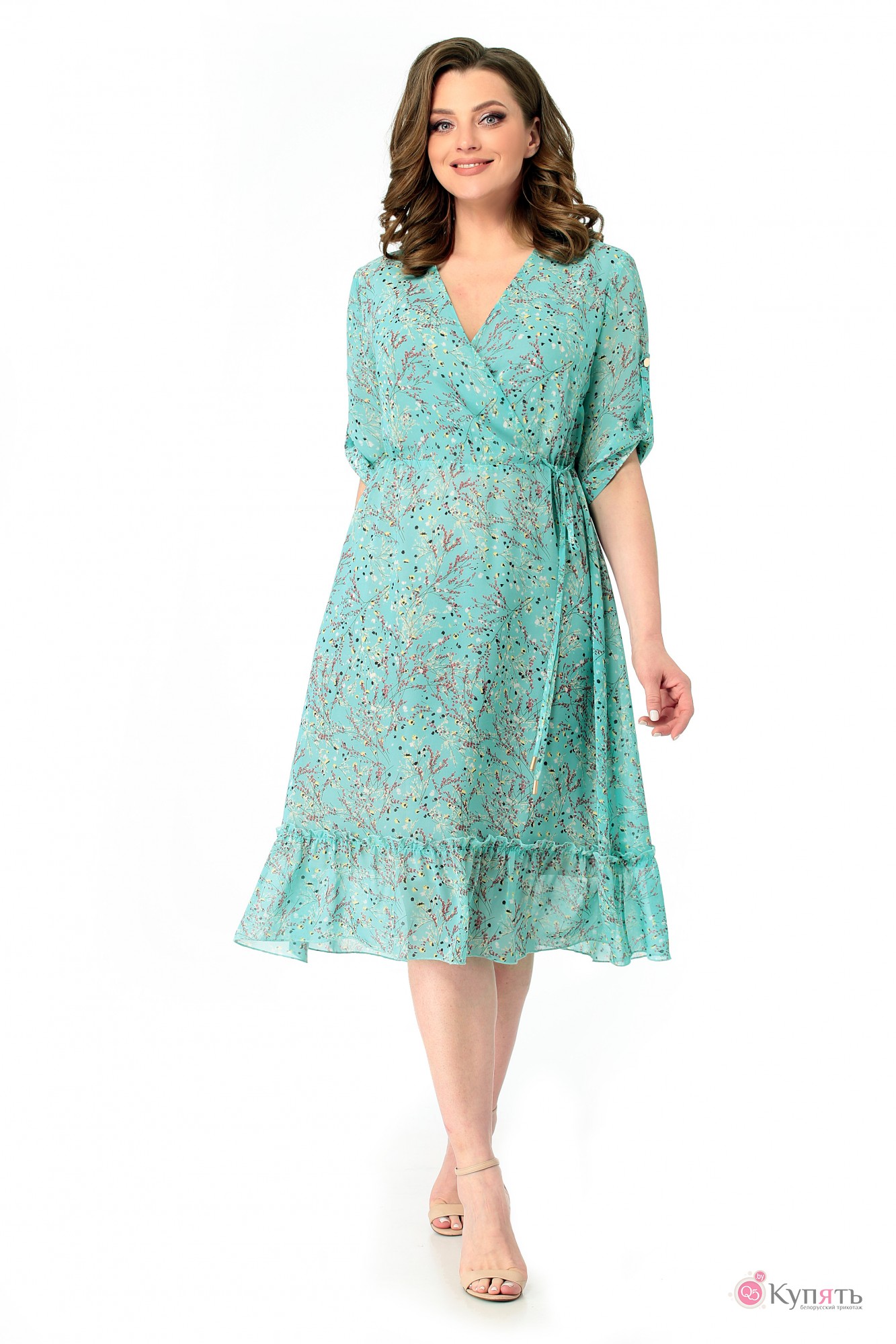 Платье женское на подкладке, отрезное по линии талии. Верхняя часть переда с запахам, нижняя часть с настроченным воланом по низу. По левой части переда декоративная завязка. Рукав втачной по низу с манжетой и декоративной патой.