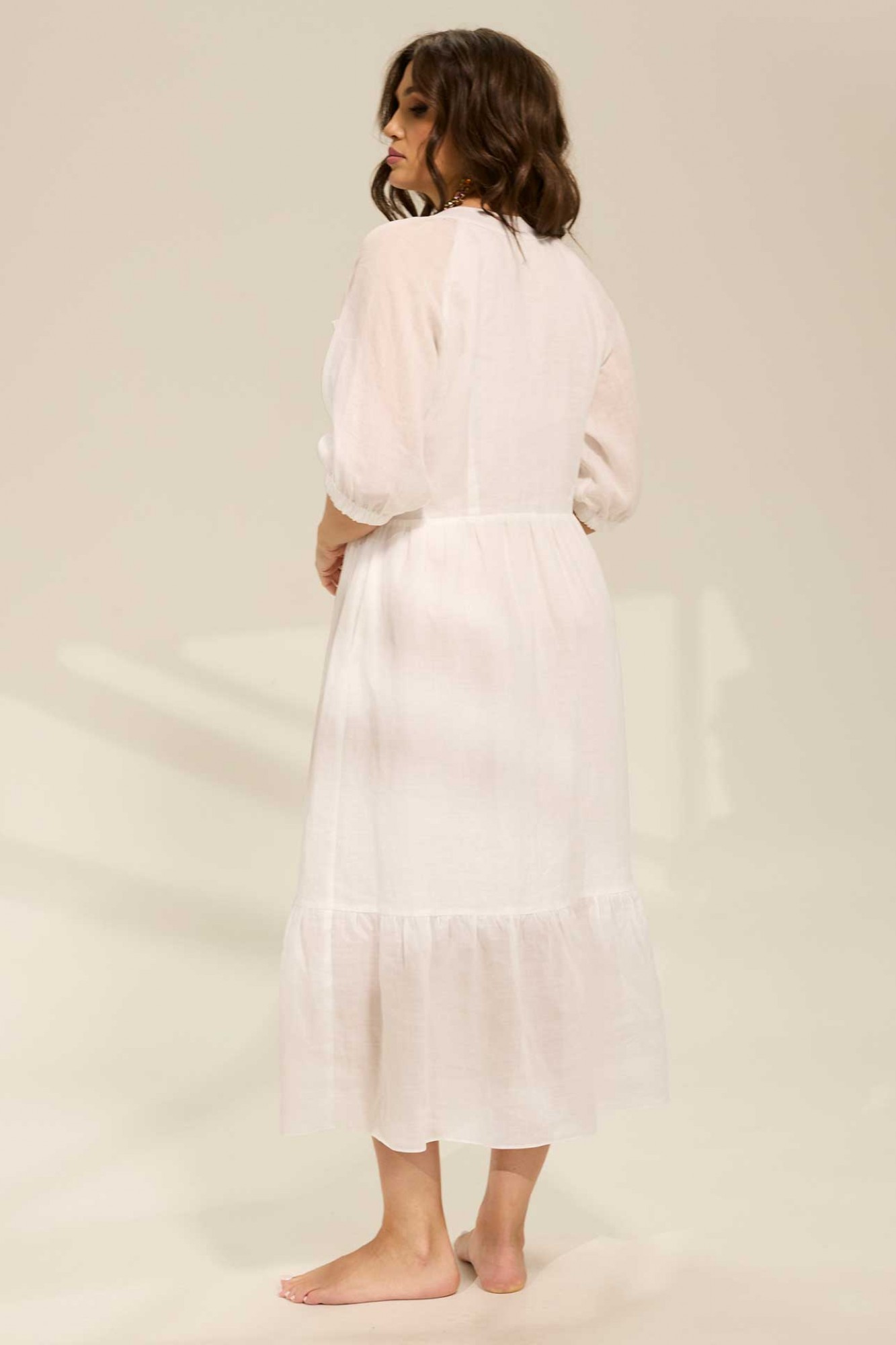 Платье женское полуприлегающего силуэта, отрезное по талии, отрезная присборенная рюша по низу изделия. Вдоль горловины притачная планка. Застежка по переду на петли-пуговицы. В области груди, частично по переду вдоль планки, обработаны рюшки. Рукав-реглан, по низу на резинке. Платье на подкладке, карманы в боковых швах.