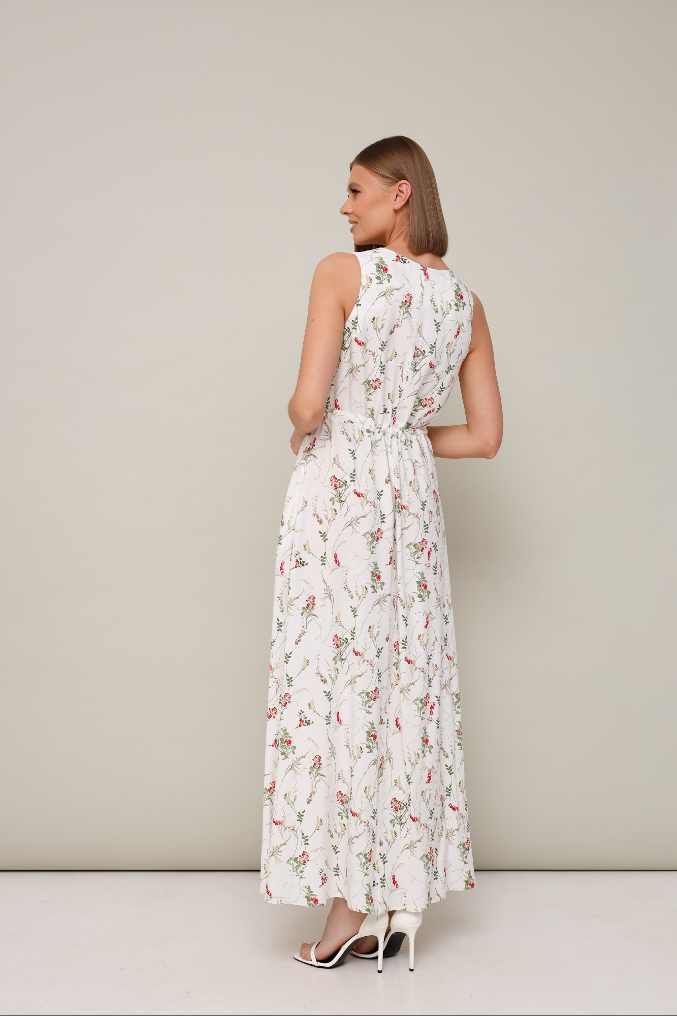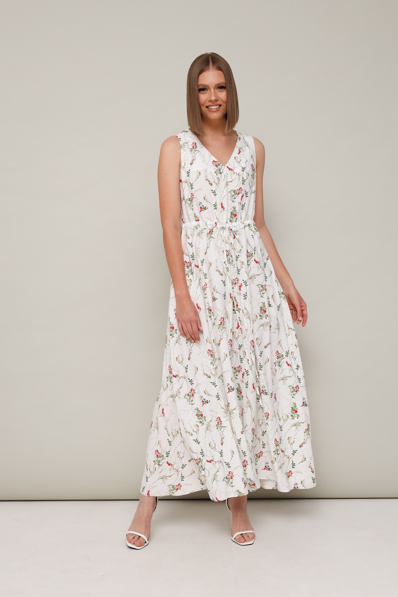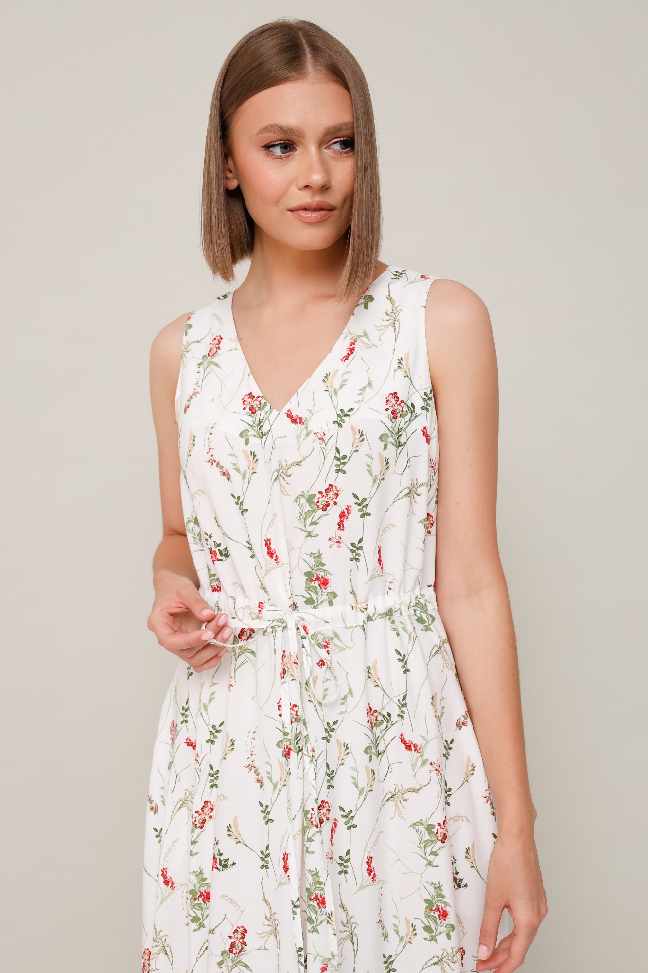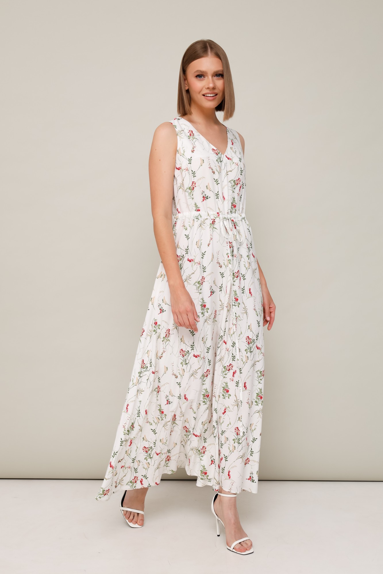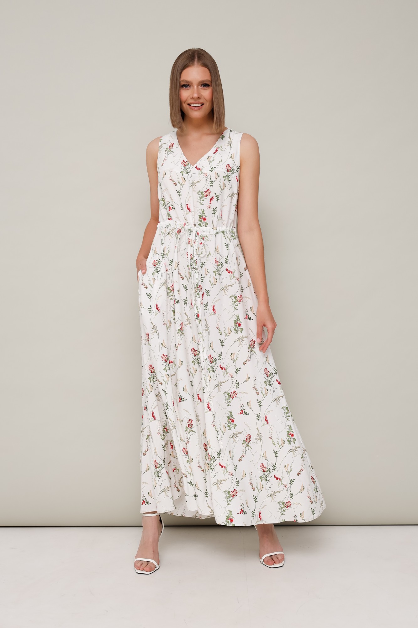 Платье выполнено из натуральной ткани с содержанием вискозы и льна. Горловина V-образной формы. По линии талии настрочная кулиса с хлопковым шнуром. В боковых швах обработаны карманы. Платье без подкладки.