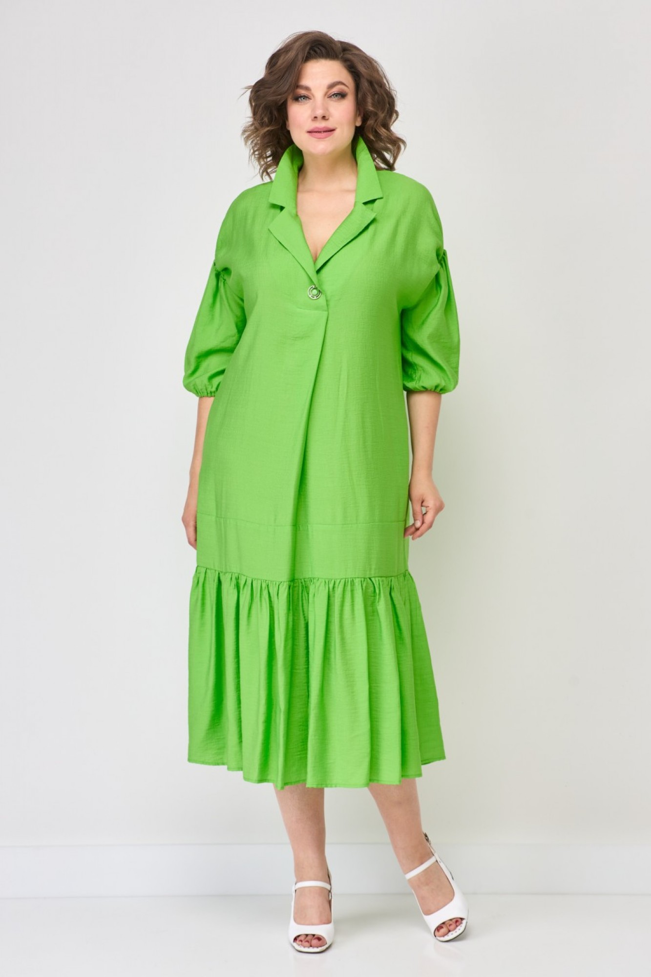 Платье женское, стильное, в стиле бохо. Свободного кроя со спущенной линией плеча, рукав ¾, манжета на резинке, такой же резинкой украшен и сам рукав, что придает изделию необычный вид. Воротник отложной, по передней части полочка, украшением служит пуговица. По низу изделия- притачной волан. Для удобства в носке- предусмотрены карманы. Платье можно носить как с поясом ( дизайн пояса может отличаться от фото) так и без.