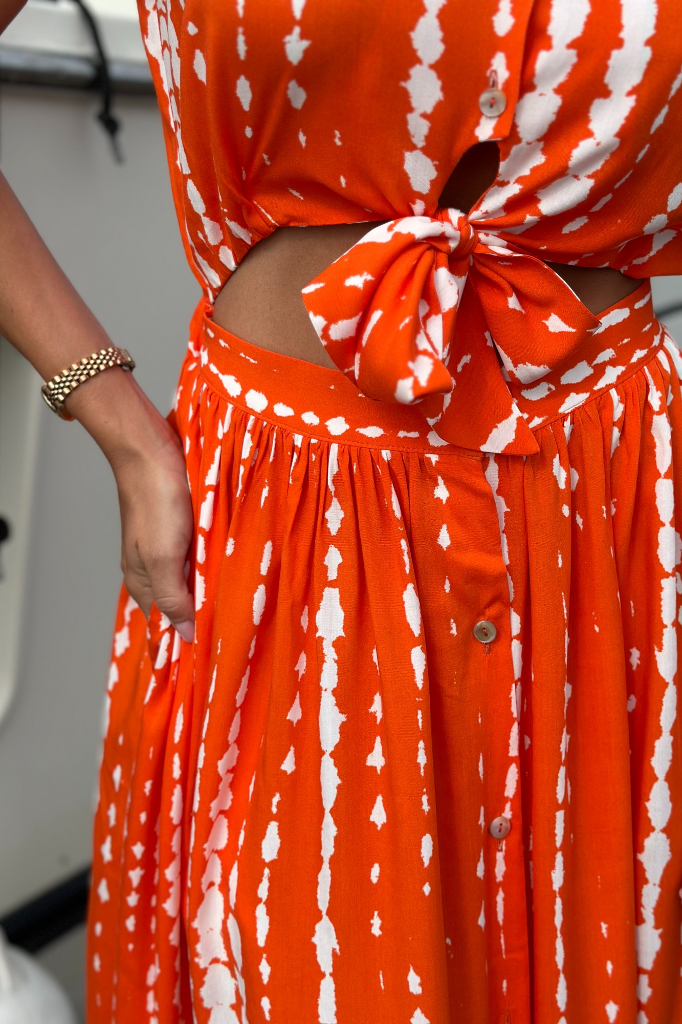 Легкое платье из хлопкового полотна, длиной макси, имитирующее костюм. С застежкой на пуговицы по переду, отрезное по линии талии, верхняя часть по переду завязывается. Рубашечный воротник, рукав короткий на резинке по низу. По спинке пояс отрезной с резинкой.